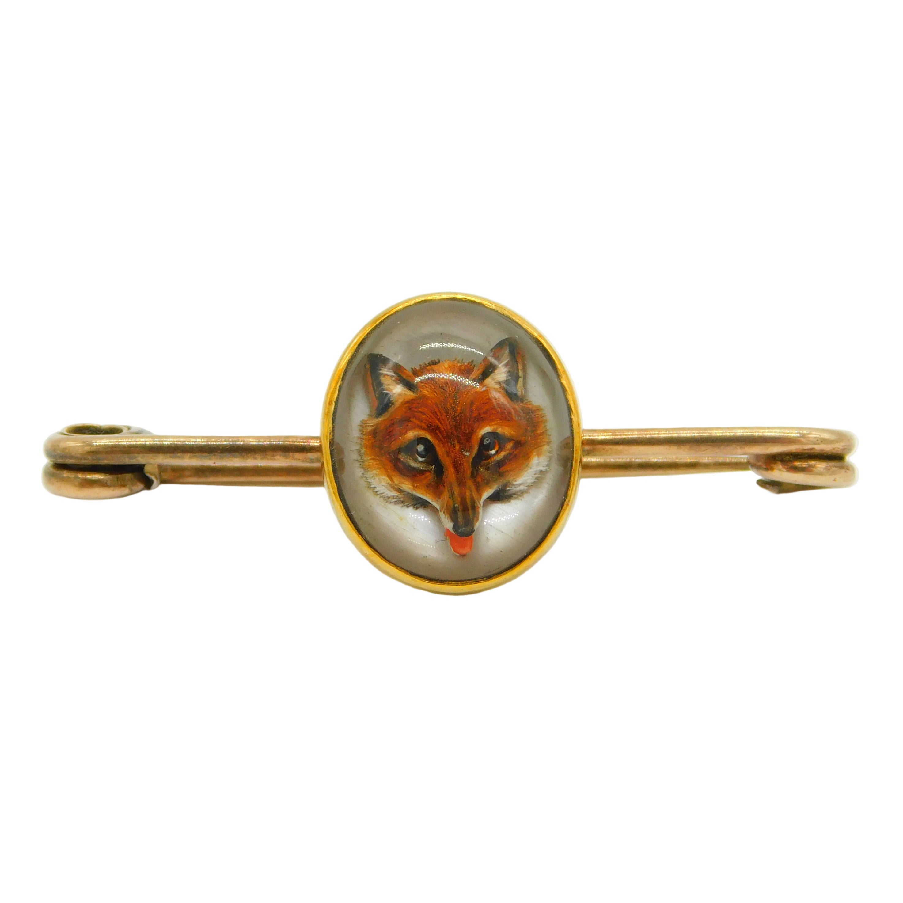 Victorian 18ct Gold Reverse Carved Essex Crystal Fox Mask Brooch Pin Antique c1860