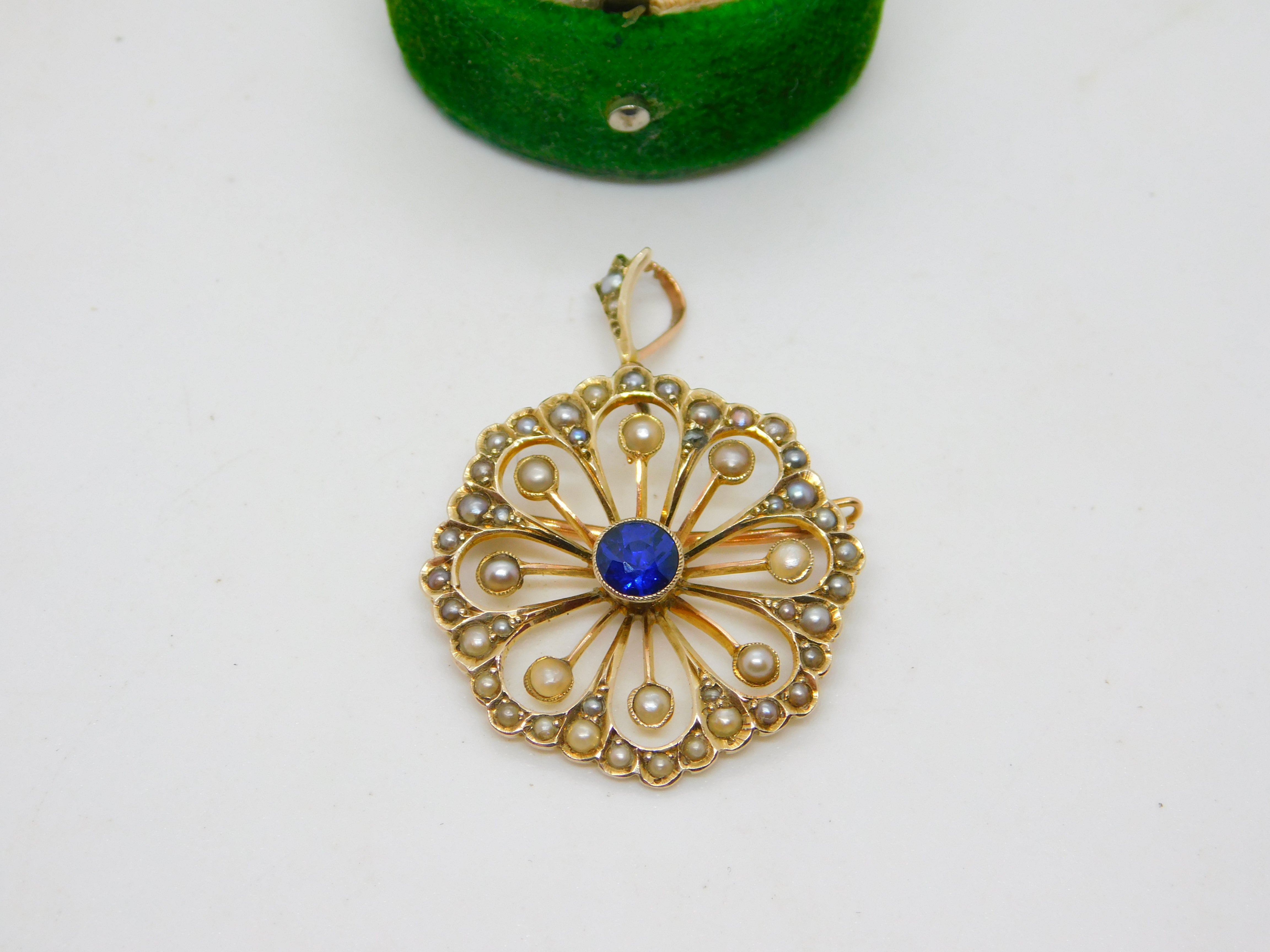 Edwardian 9ct Yellow Gold, Sapphire & Seed Pearl Floral Pendant Antique c1910