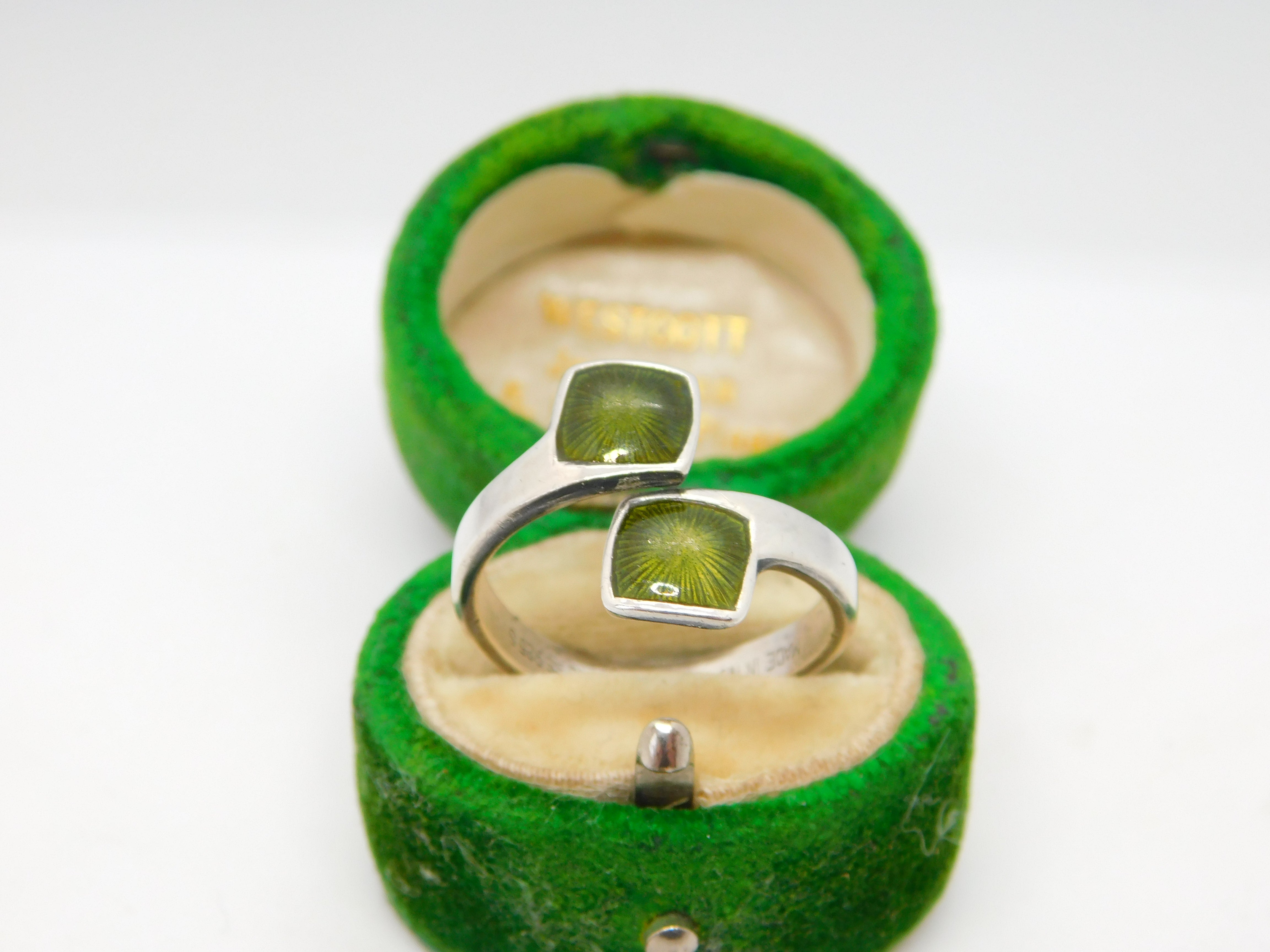 Aksel Holmsen Norway Sterling Silver Green Enamel Crossover Ring Vintage c1960