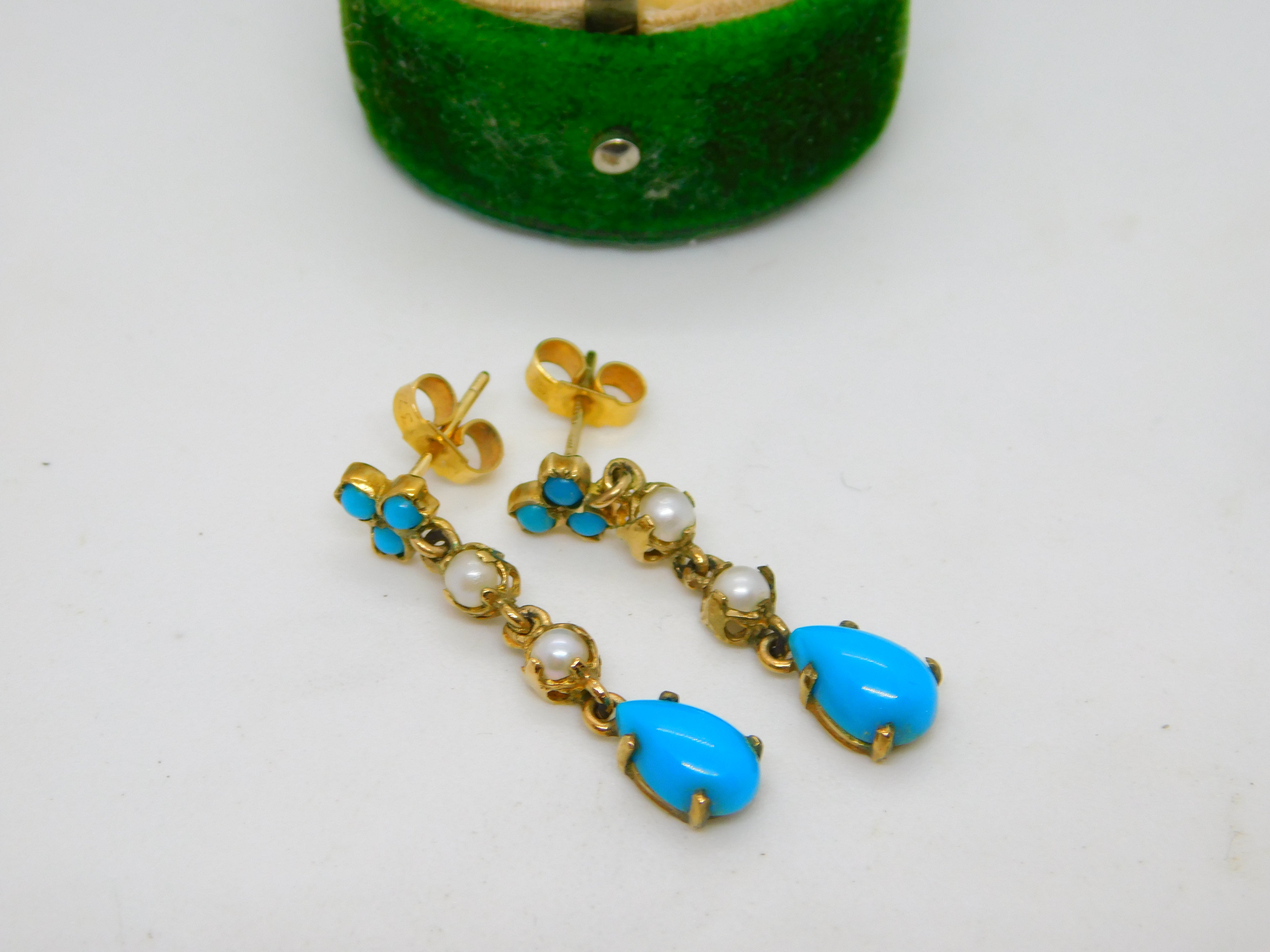 9ct Gold Victorian Style Pearl & Turquoise Drop Earrings Vintage 1991 London