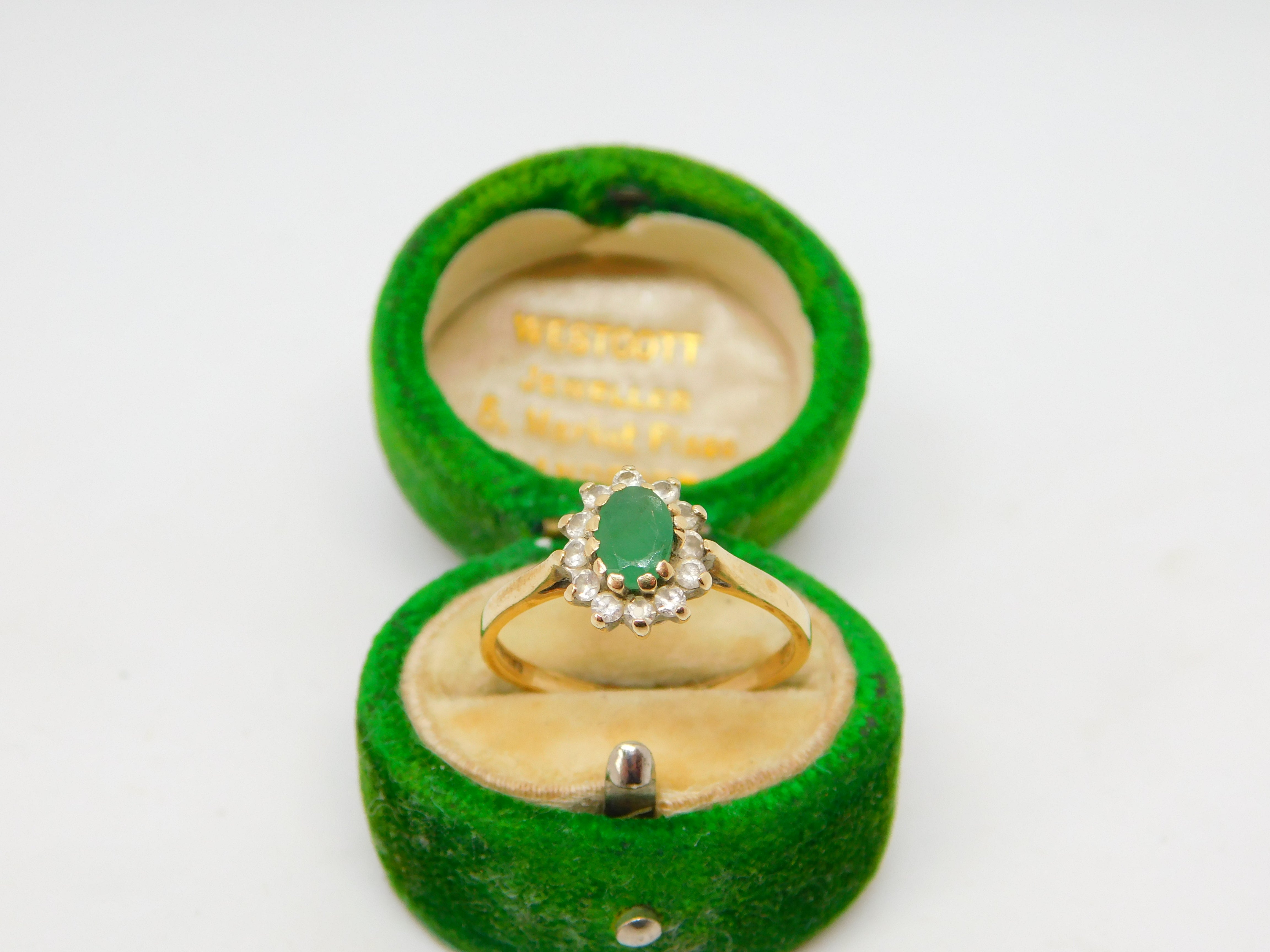 9ct Yellow Gold, Emerald & Spinel Set Floral Cluster Ring Vintage 1973 London