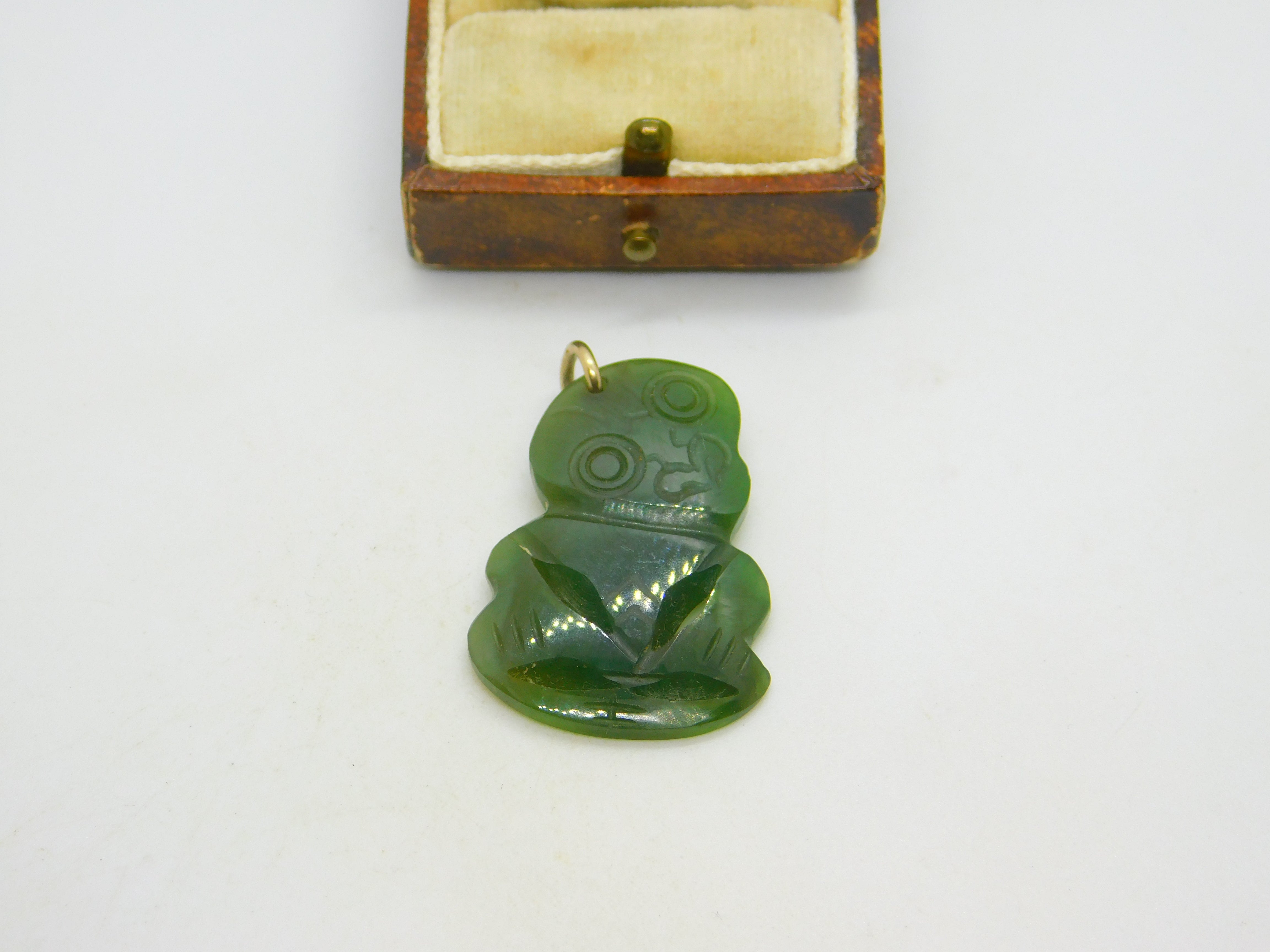 9ct Rose Gold Carved Nephrite Jade Tiki Maori Charm Pendant Antique c1920