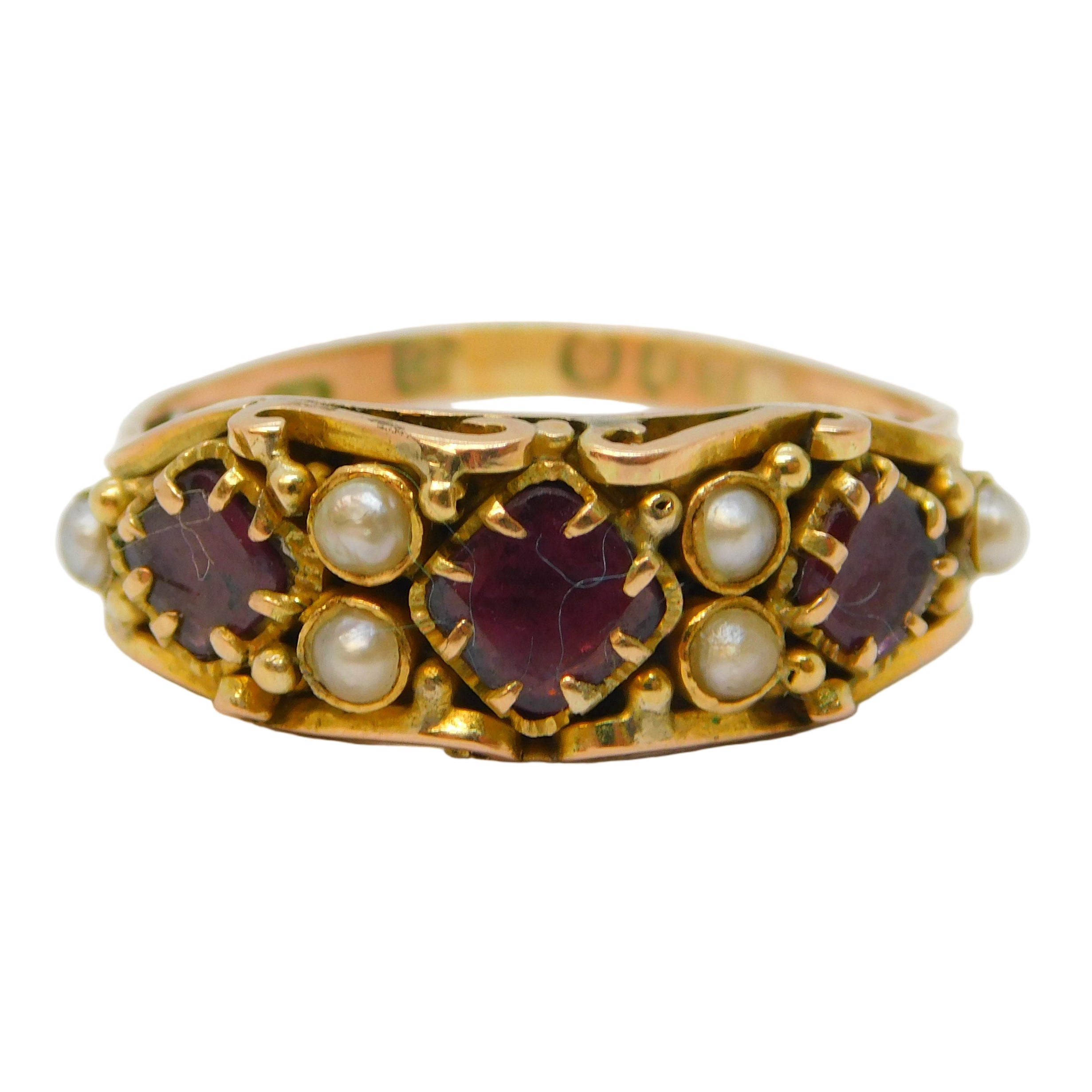 Victorian 9ct Gold, Almandine Garnet, Seed Pearl Dress Ring Antique Chester c1890