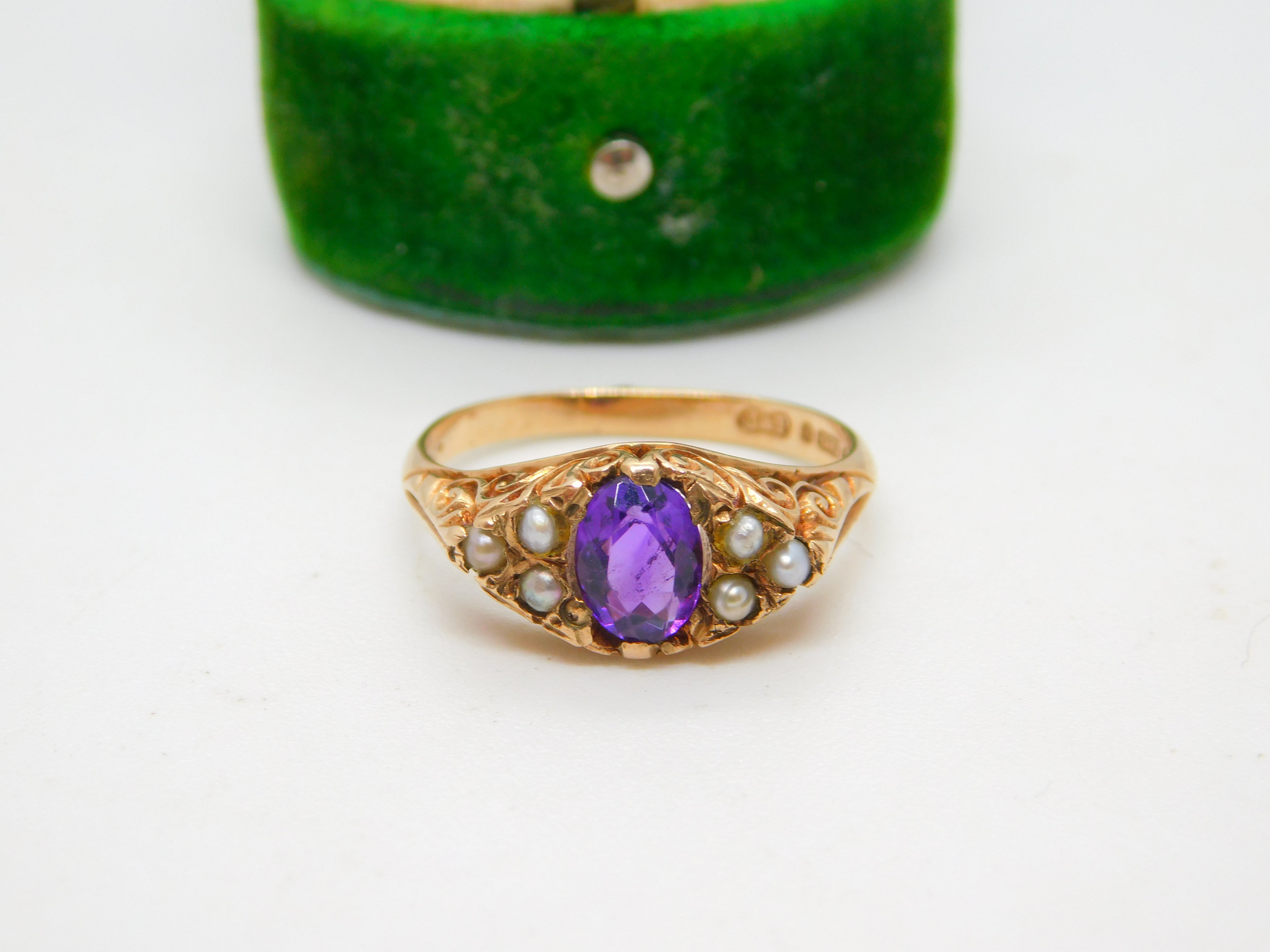 9ct Gold Victorian Style, Amethyst & Seed Pearl Boat Ring Vintage 1970 London