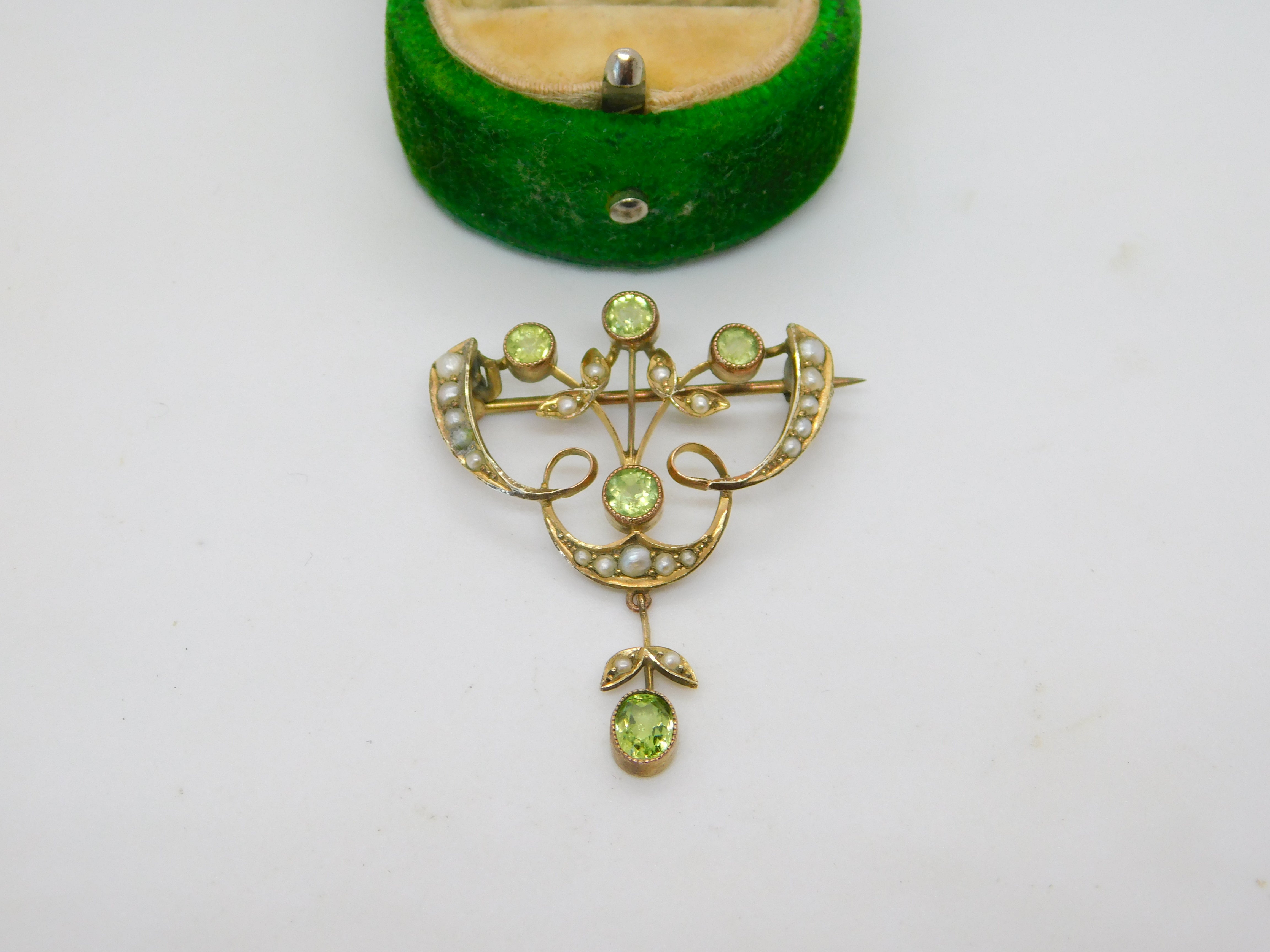 Edwardian 9ct Gold, Peridot & Seed Pearl Floral Lavelier Brooch Antique c1910