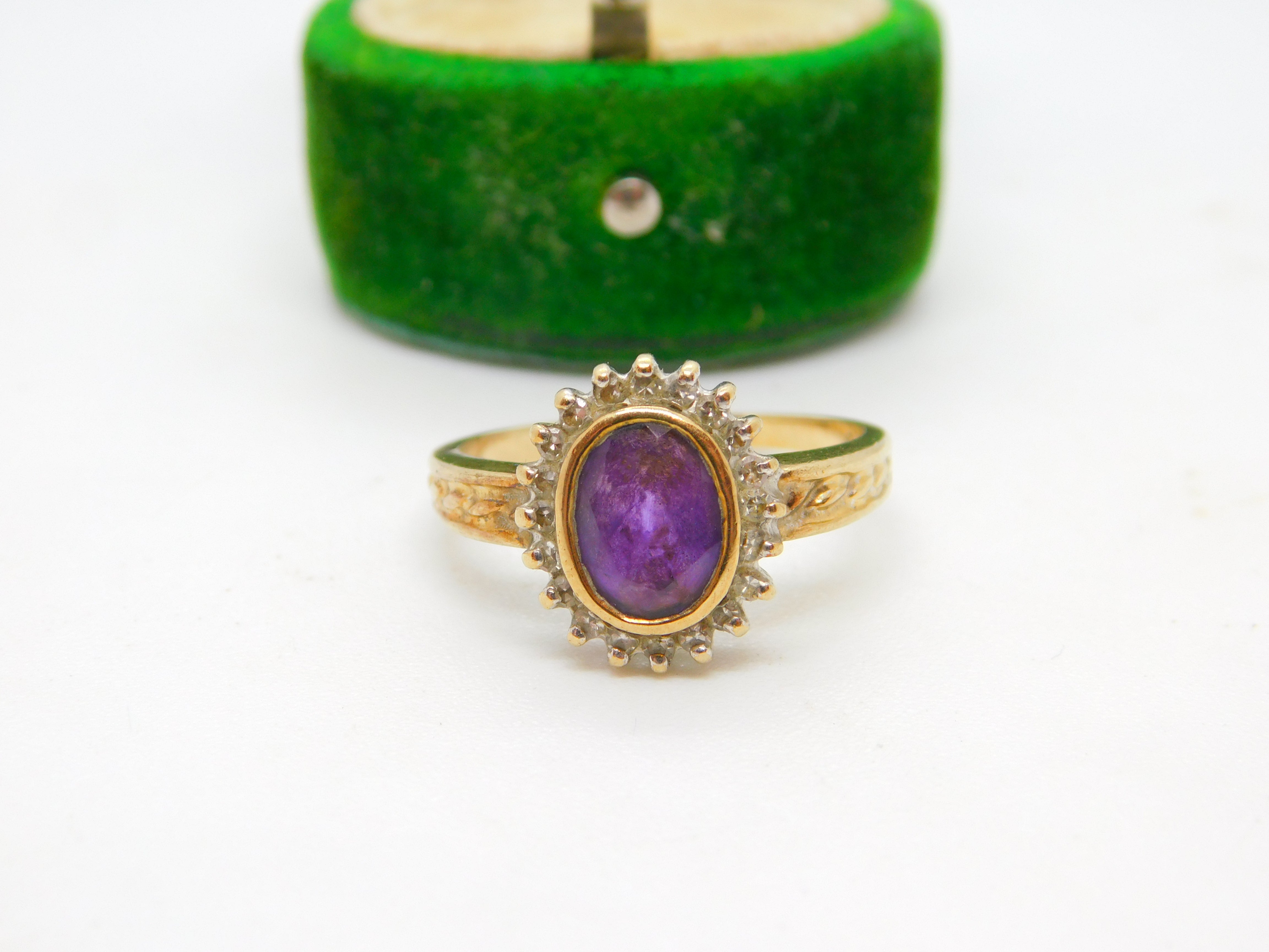 10ct Yellow Gold, Amethyst & Six Diamond Set Dress Ring Vintage c1970