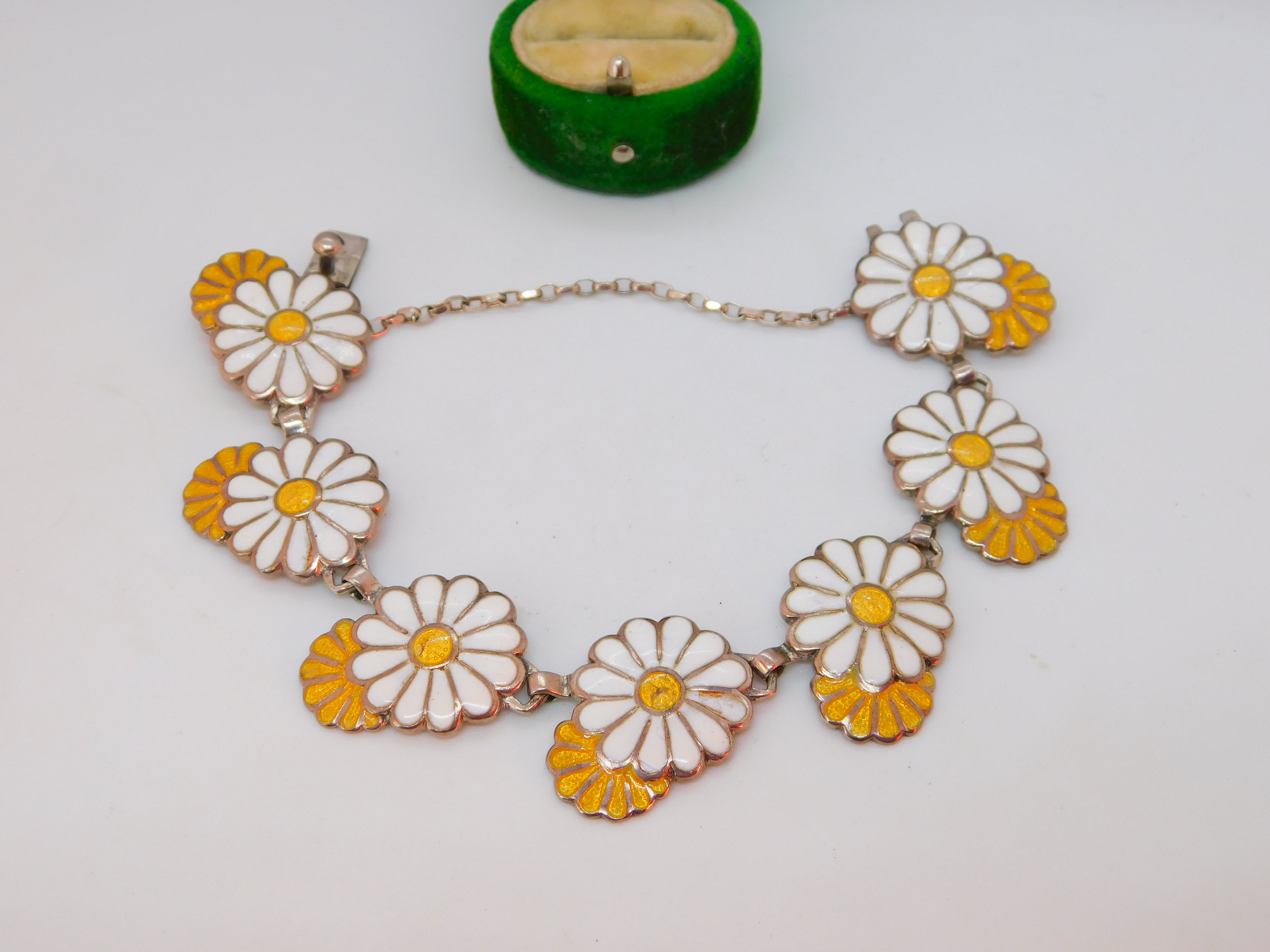 Margot De Taxco Sterling Silver Daisy Flower Enamel Bracelet Vintage c1960