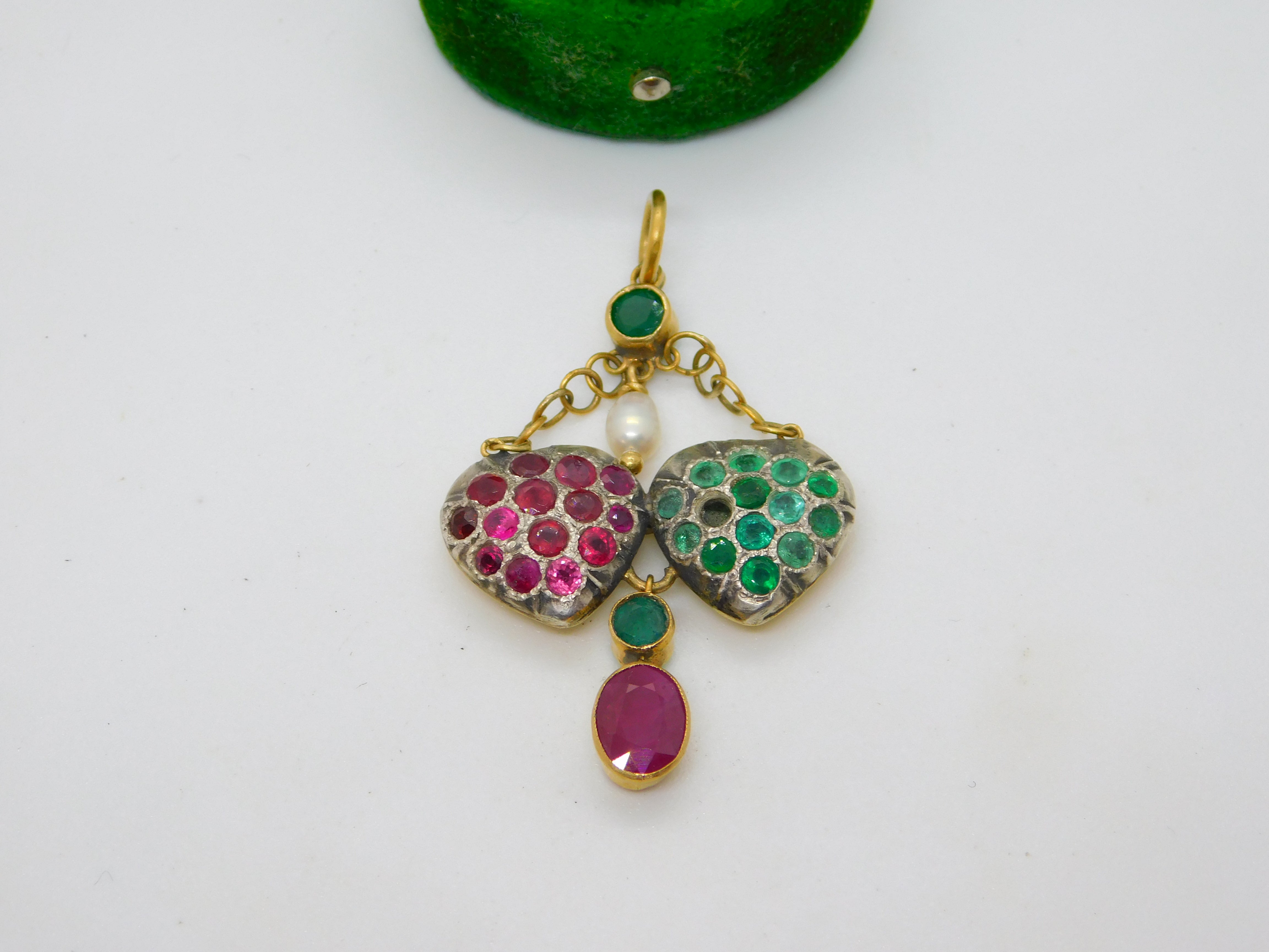 Georgian 18ct Gold, Ruby, Emerald & Pearl Set Lavalier Sweetheart Drop Pendant c1820