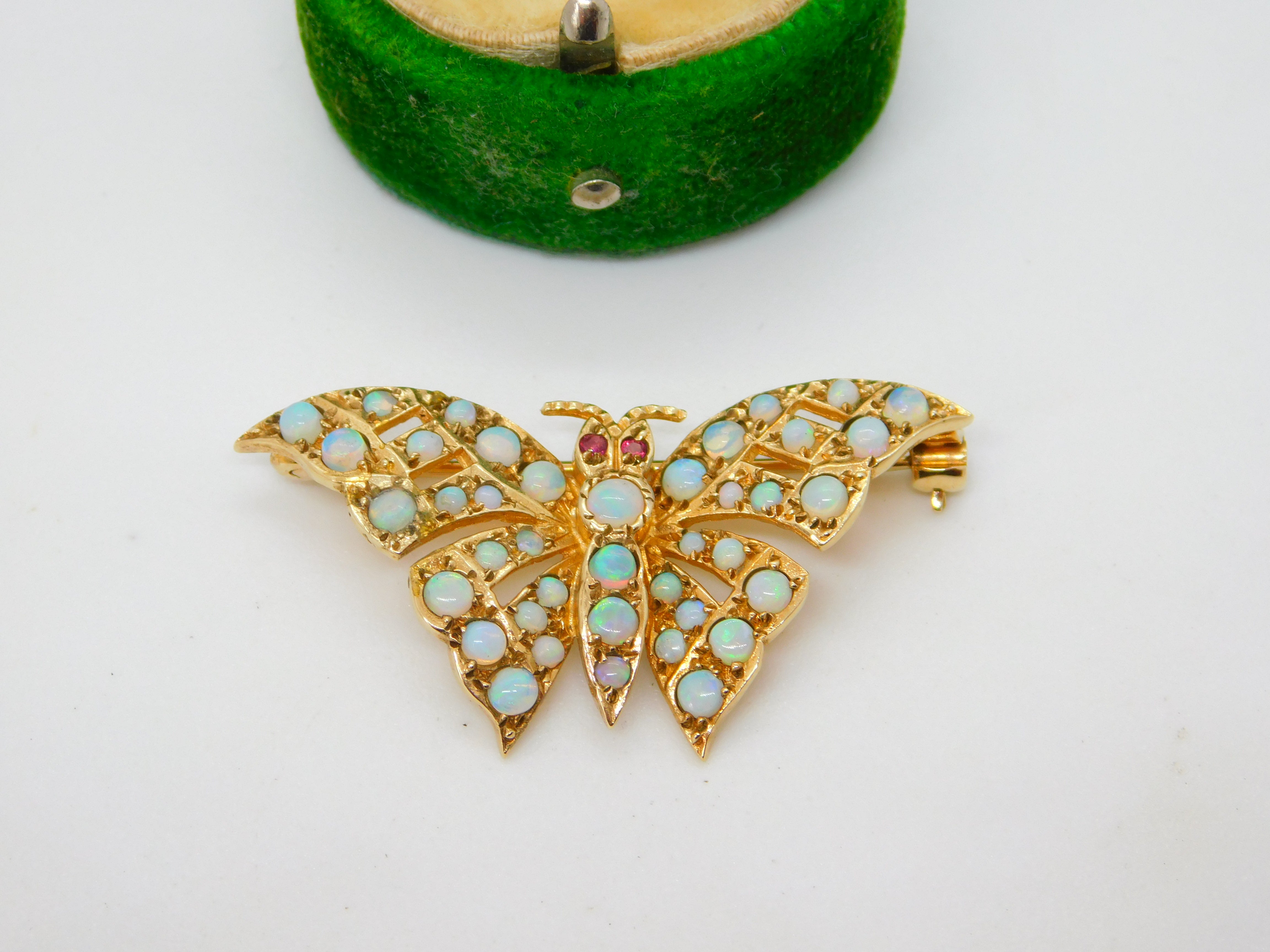9ct Yellow Gold, Ethiopian Opal & Ruby Butterfly Brooch Vintage 1984 London