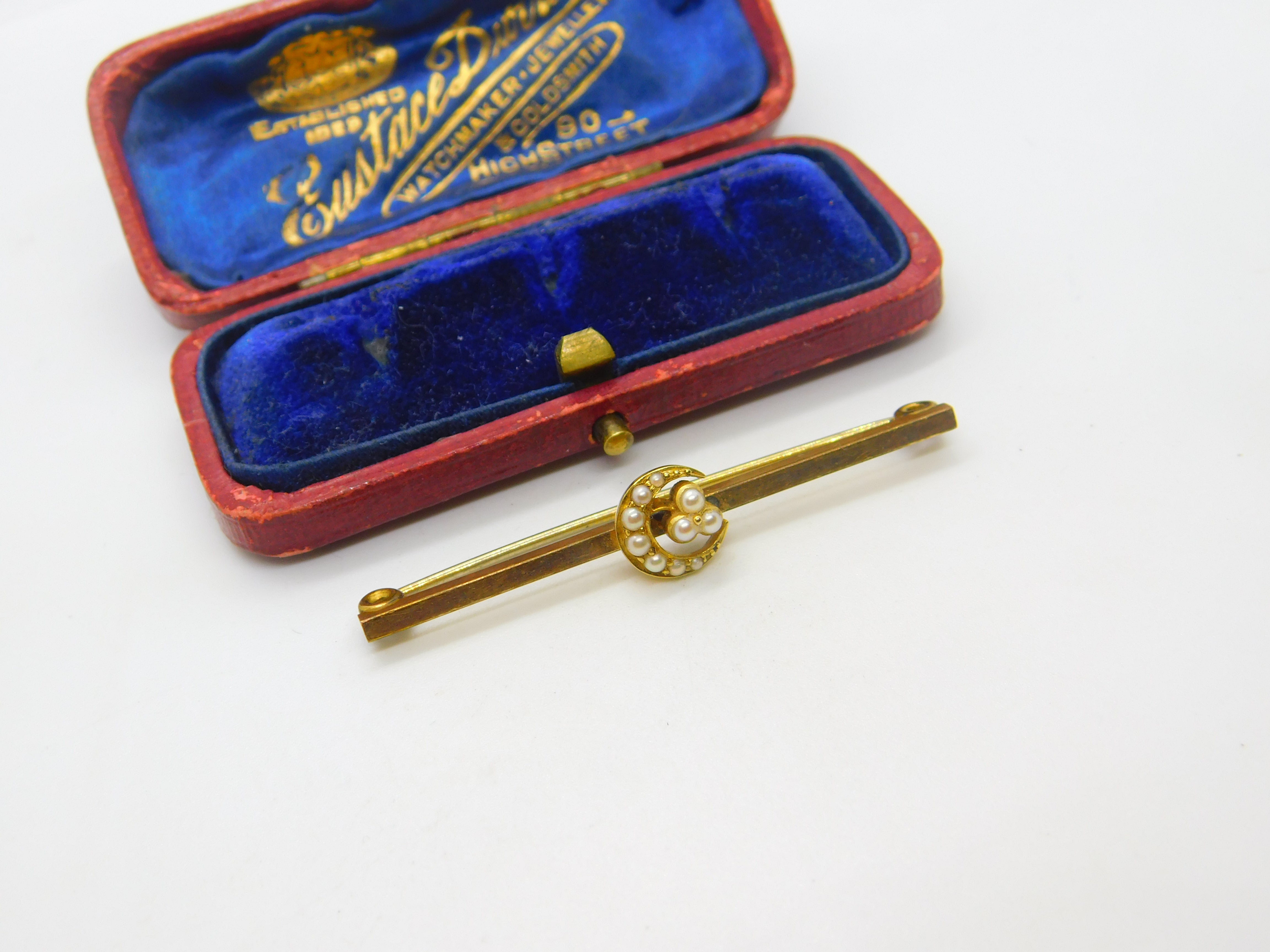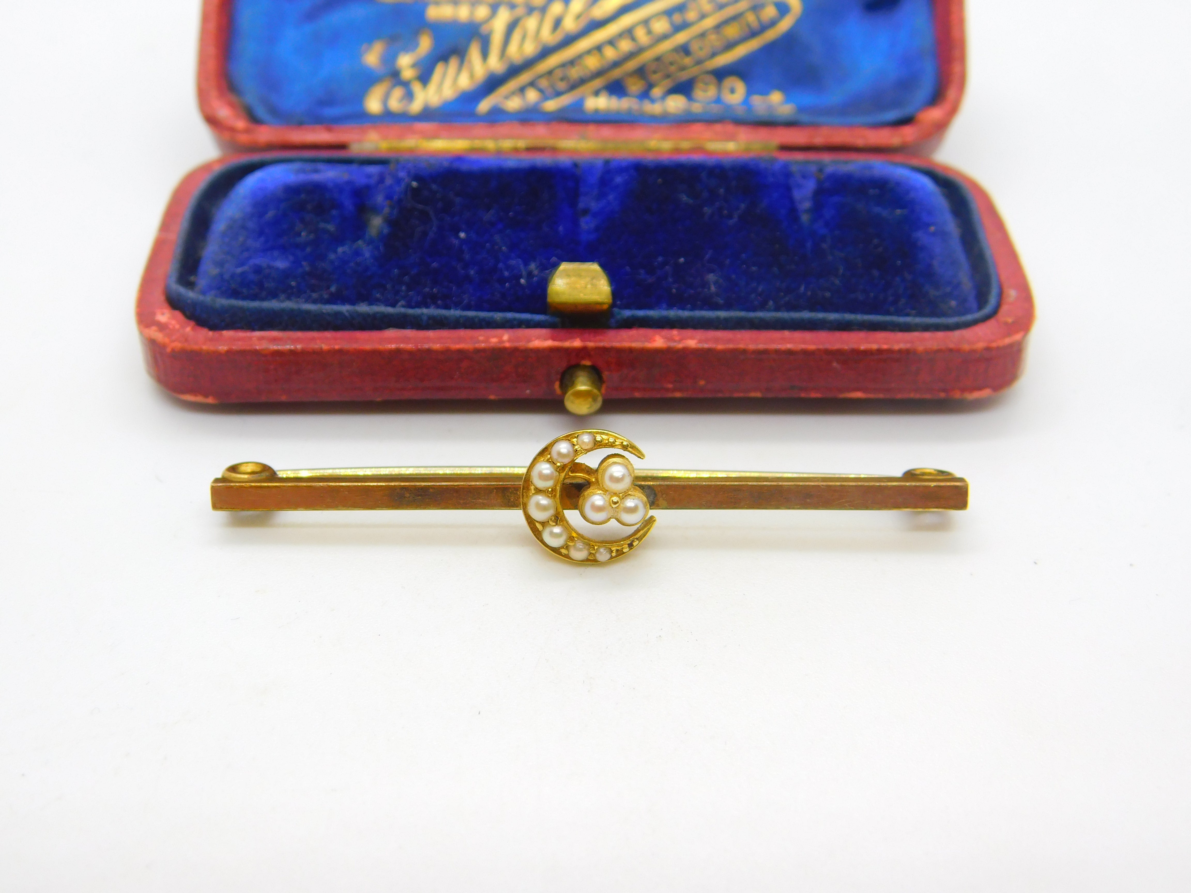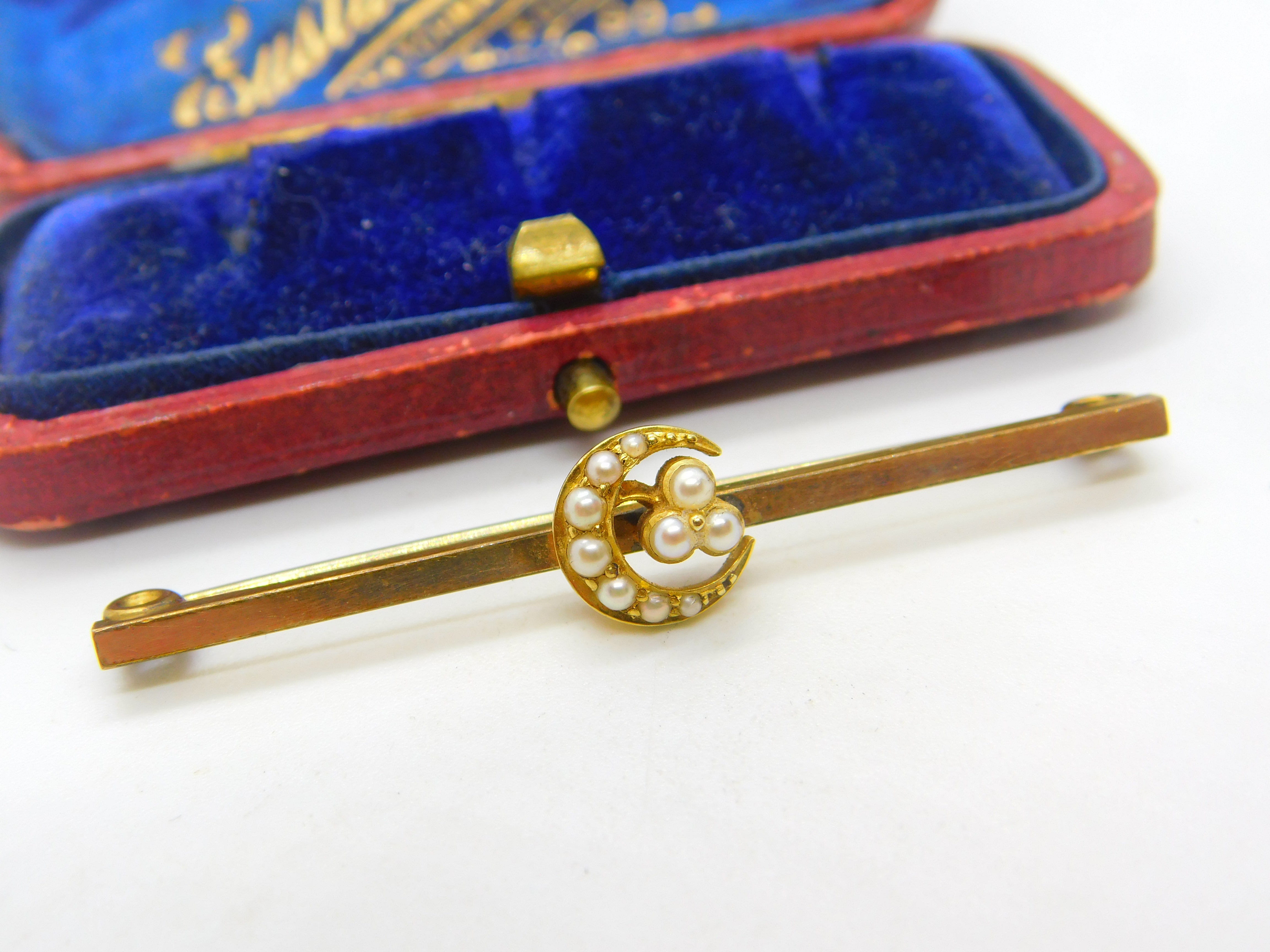12ct Yellow Gold Cased & Seed Pearl Crescent Sweetheart Brooch c1920 Antique