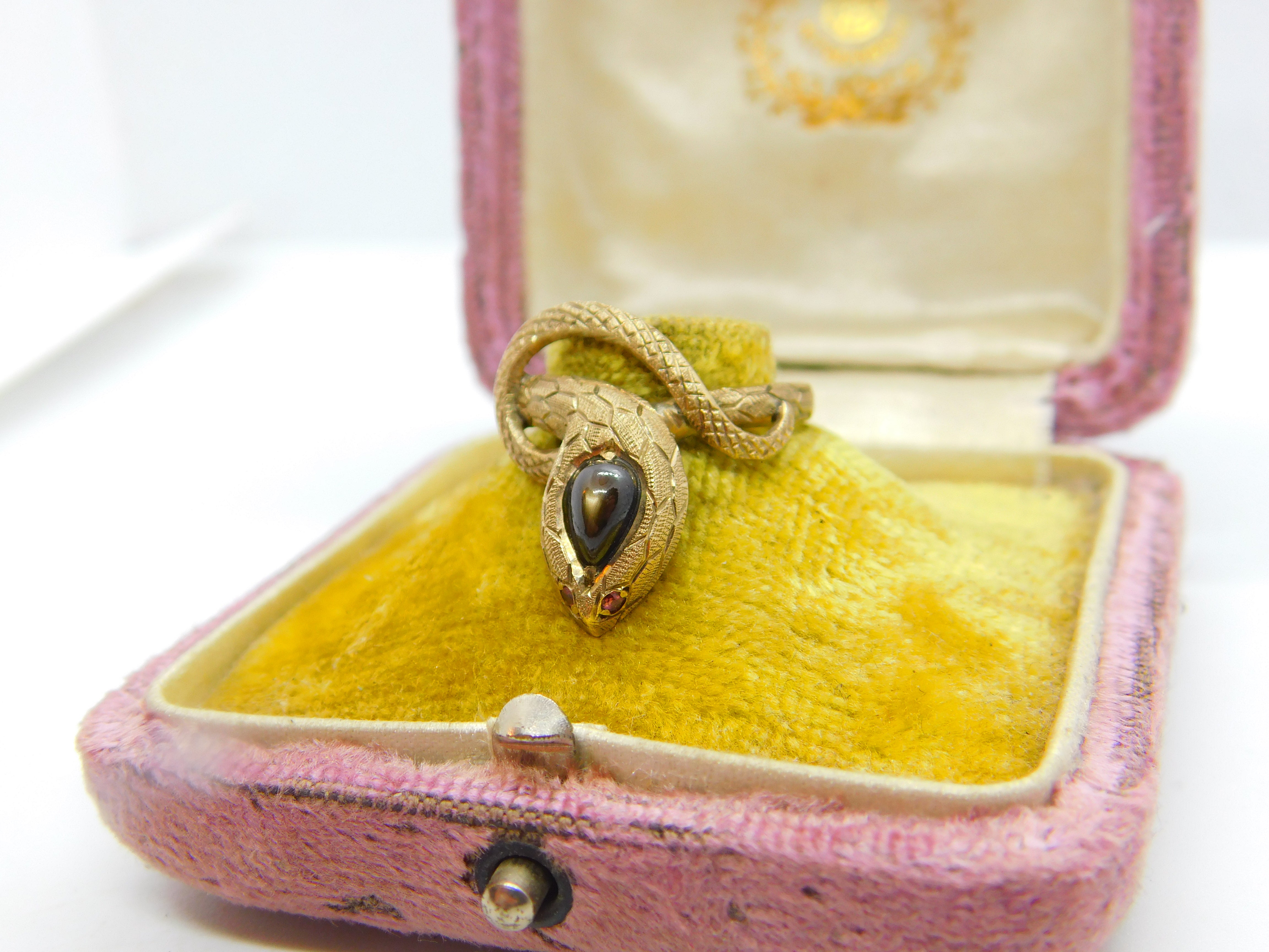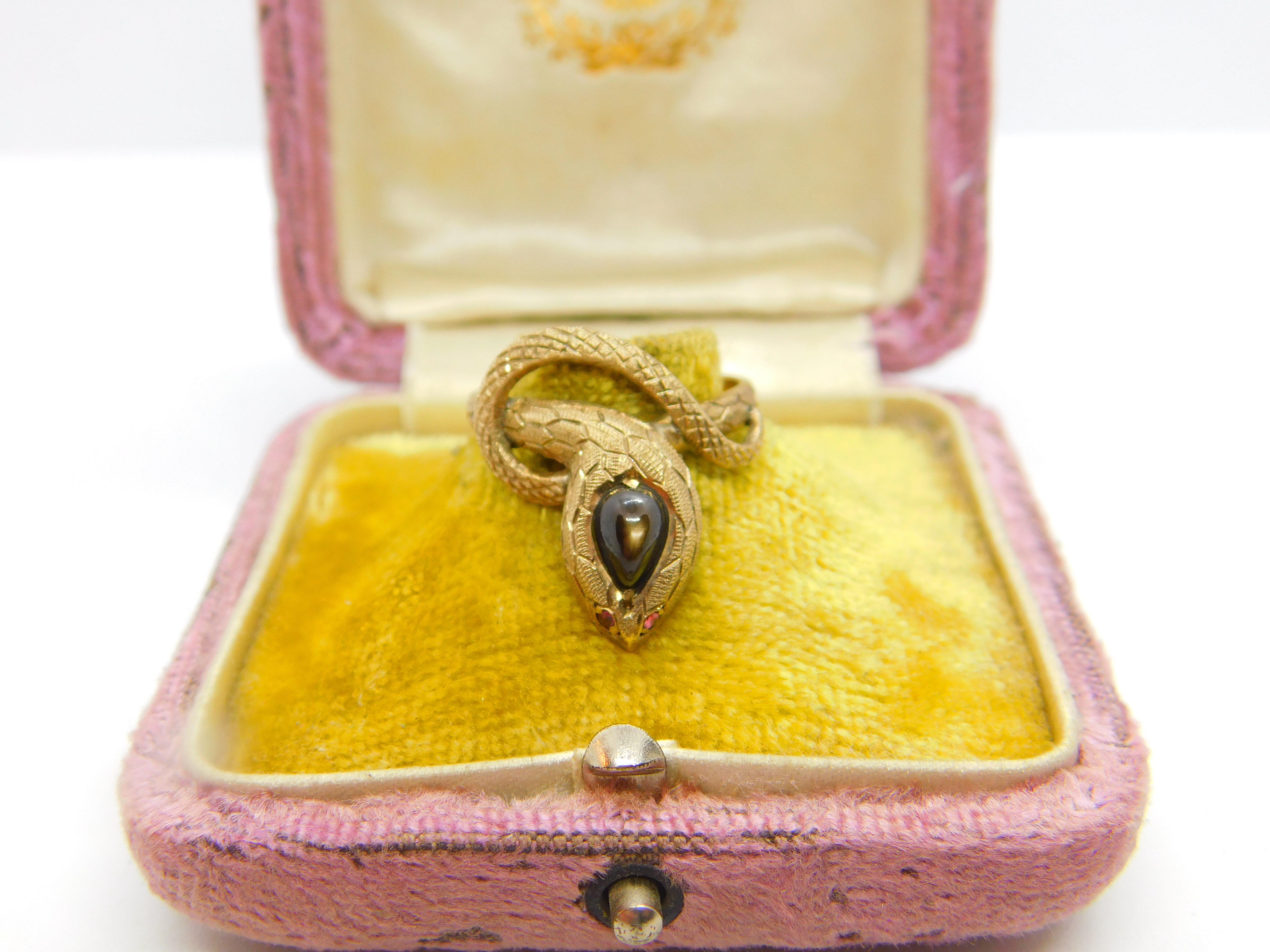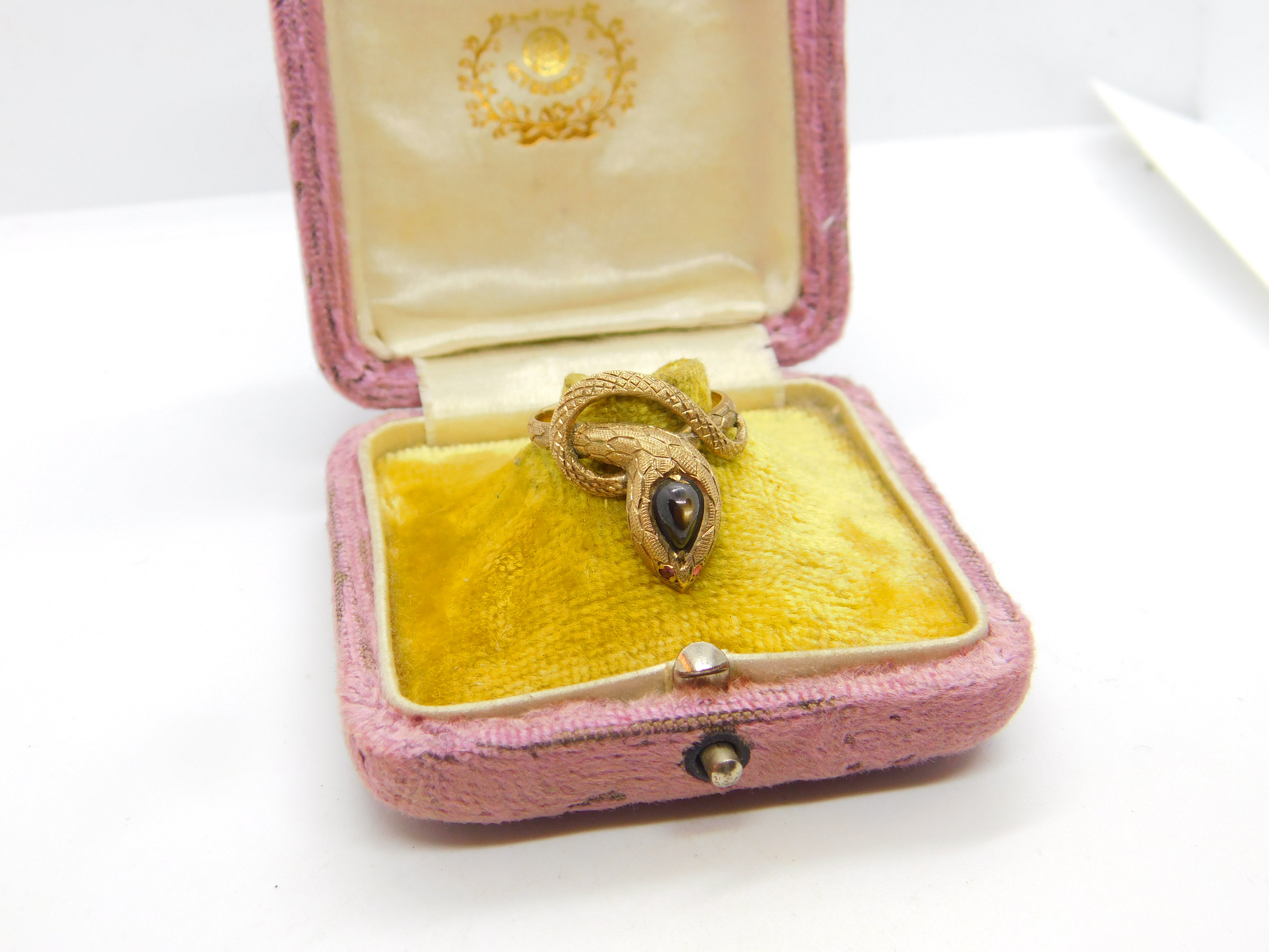 Details: A fantastic and wonderfully designed vintage 14ct yellow gold snake or serpent ring set with cabochon star sapphire alongside ruby set eyes hallmarked to the interior band c1970. This is a wonderful item that would make a perfect gift or addition to any collection. The BOX pictured is for PRESENTATION ONLY and is NOT included in the listings but used to frame the pictures unless specifically stated otherwise.