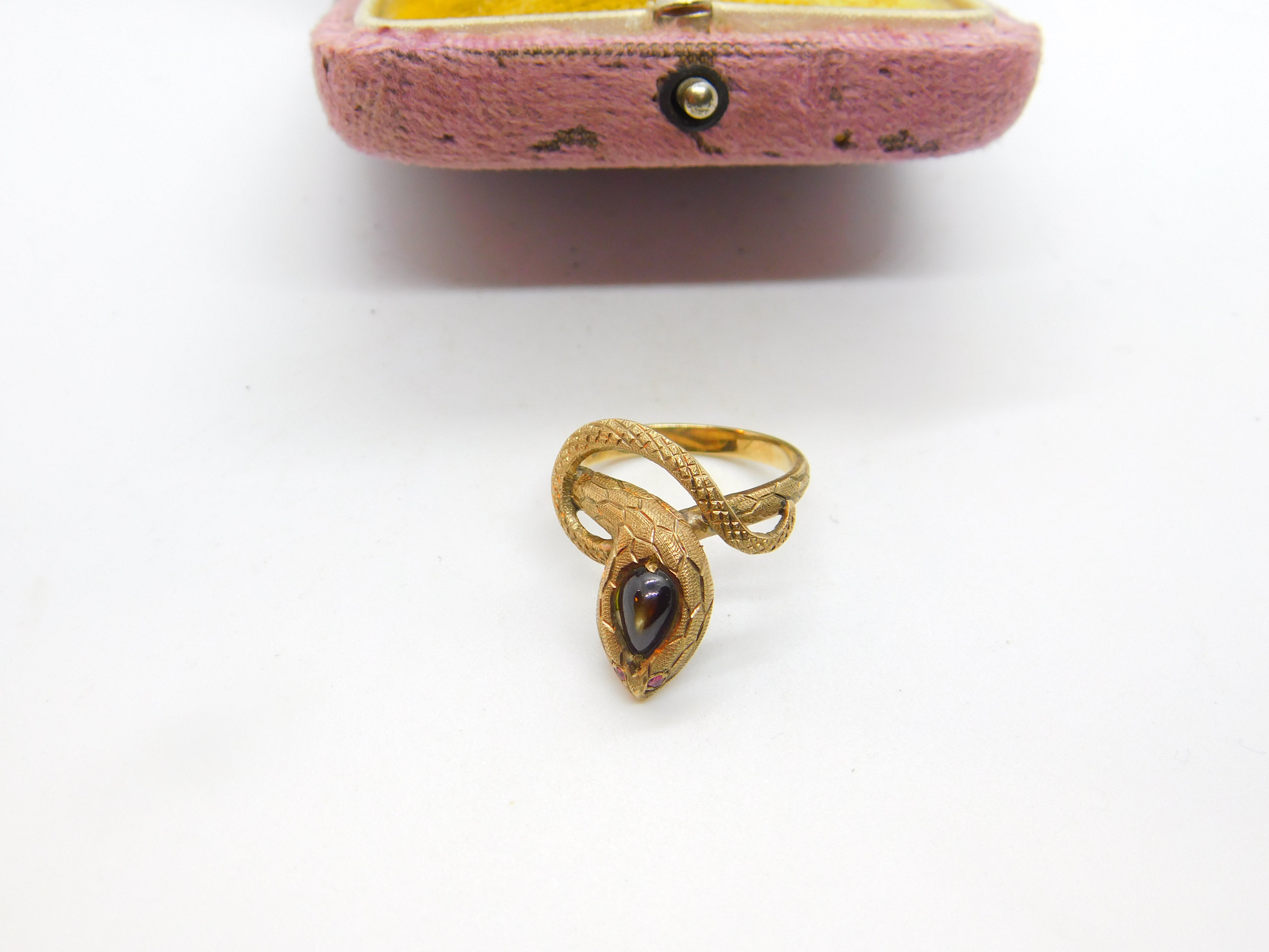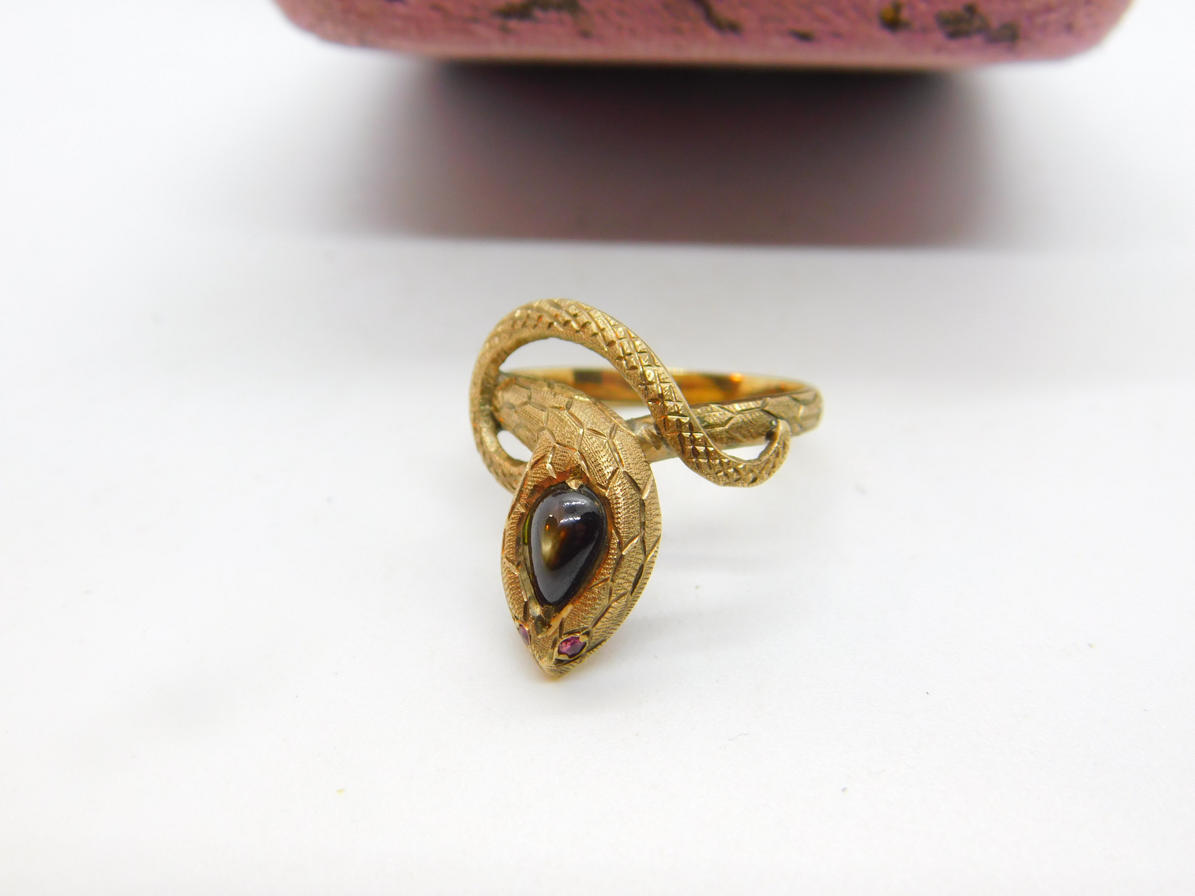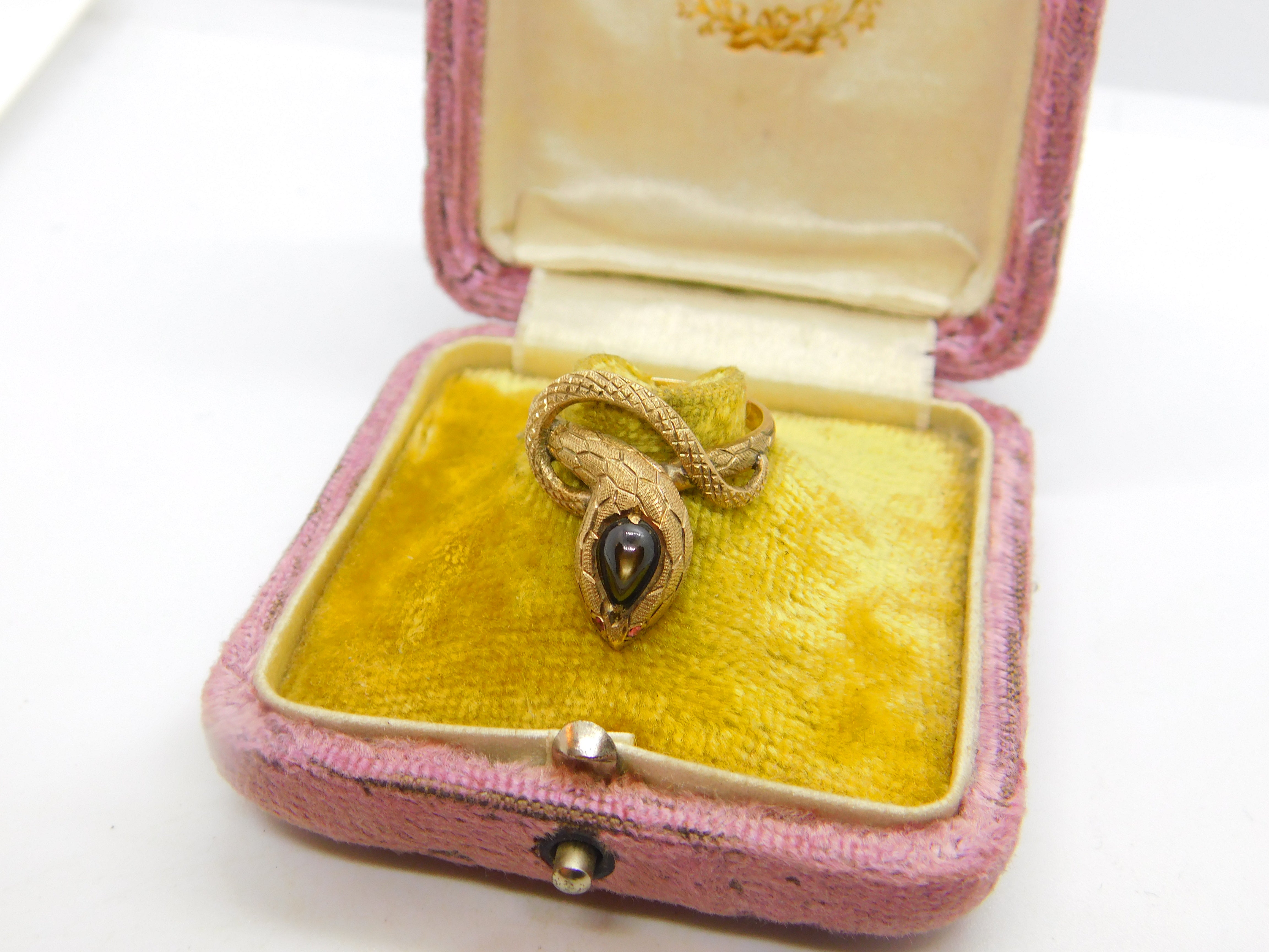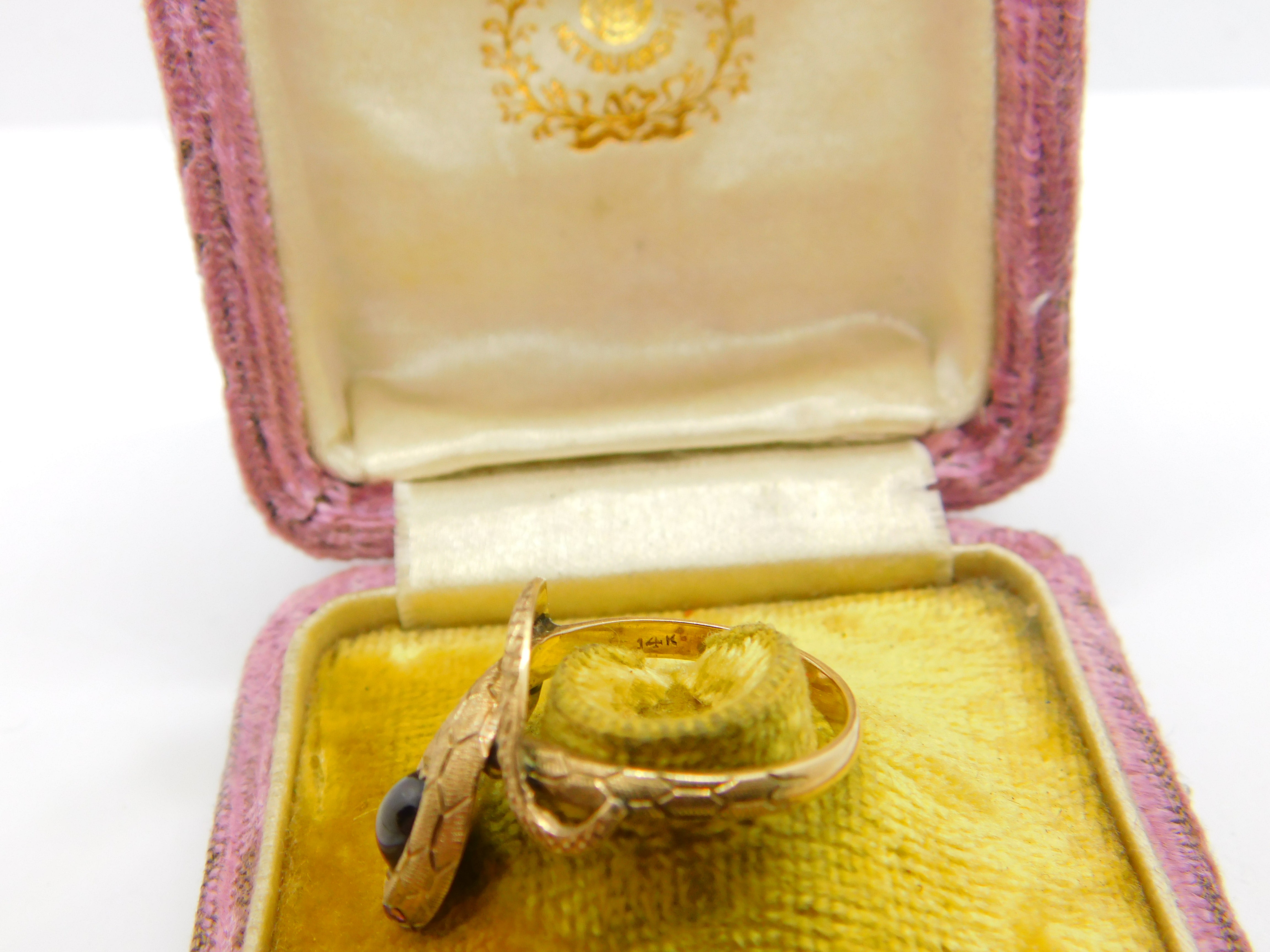Details: A fantastic and wonderfully designed vintage 14ct yellow gold snake or serpent ring set with cabochon star sapphire alongside ruby set eyes hallmarked to the interior band c1970. This is a wonderful item that would make a perfect gift or addition to any collection. The BOX pictured is for PRESENTATION ONLY and is NOT included in the listings but used to frame the pictures unless specifically stated otherwise.