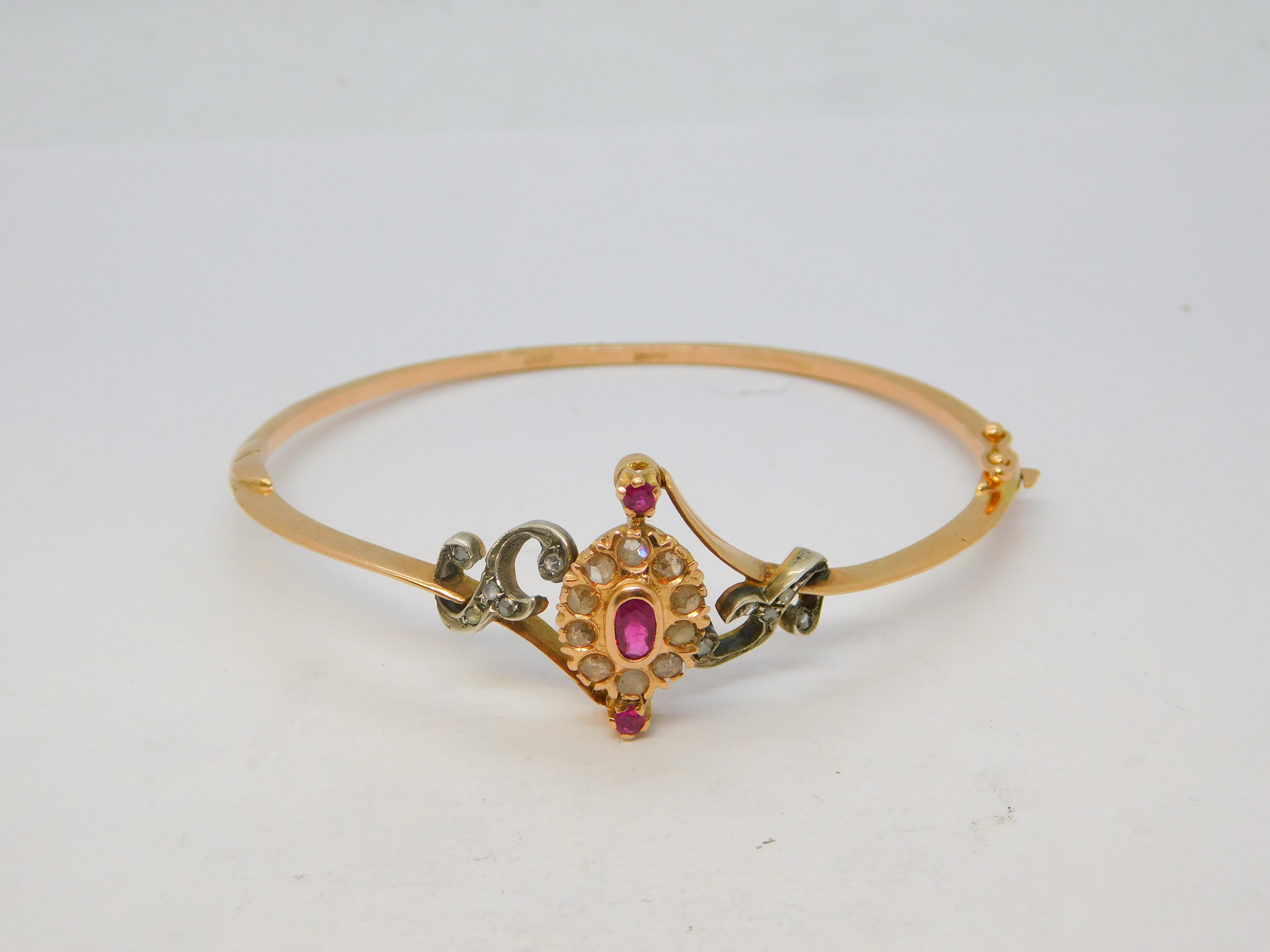 Details: A fantastic and wonderfully designed antique art deco 20th century 14ct rose gold floral crossover pattern bange set to the centre with three graduating rubies, the central ruby flanked by approximately 1ct old-cut diamonds alongside further small diamodns to the floral shoulders, hallmarked to the interior bangle and all the stones have been tested, a stunning example. This is a wonderful item that would make a perfect gift or addition to any collection.