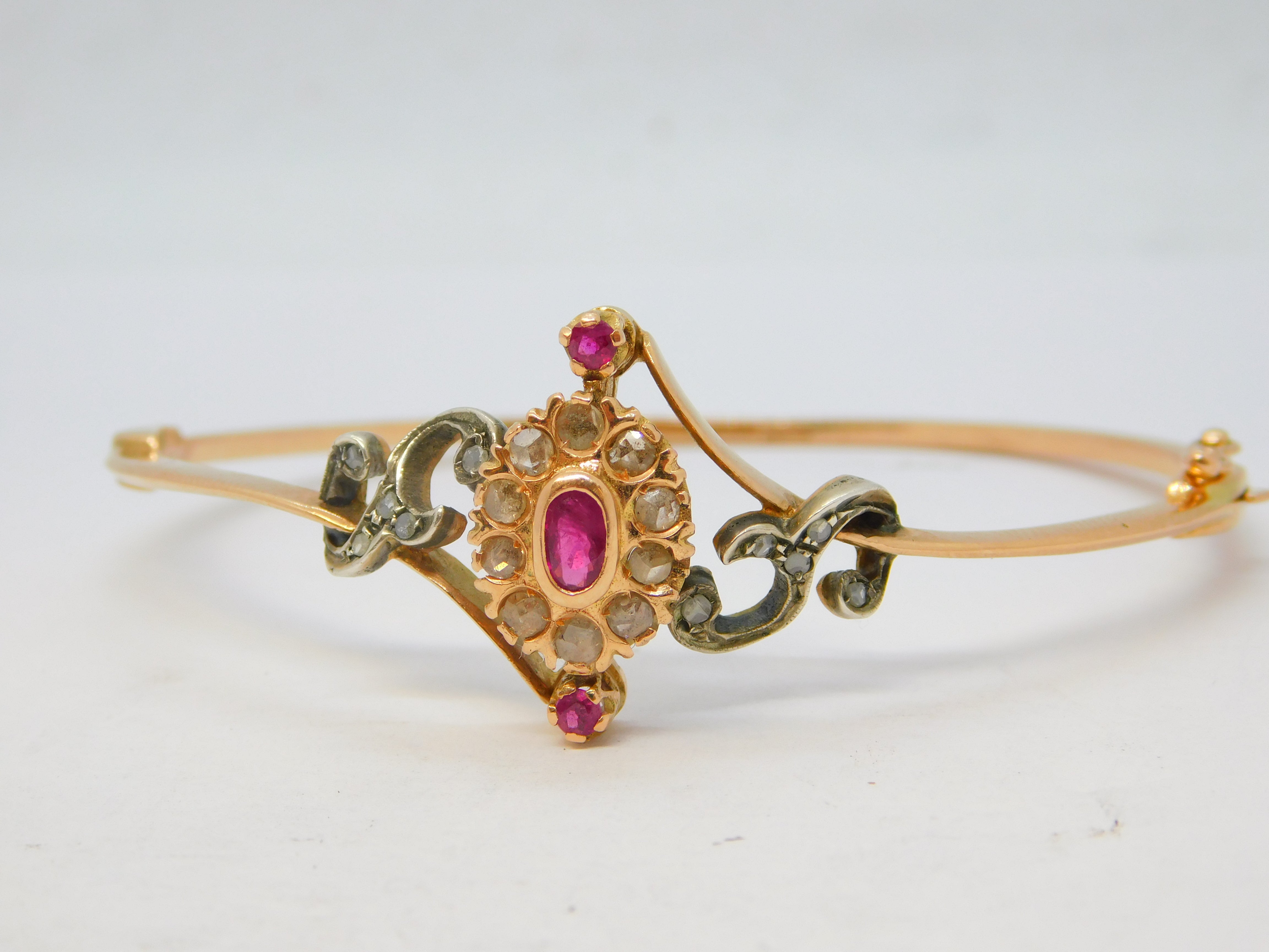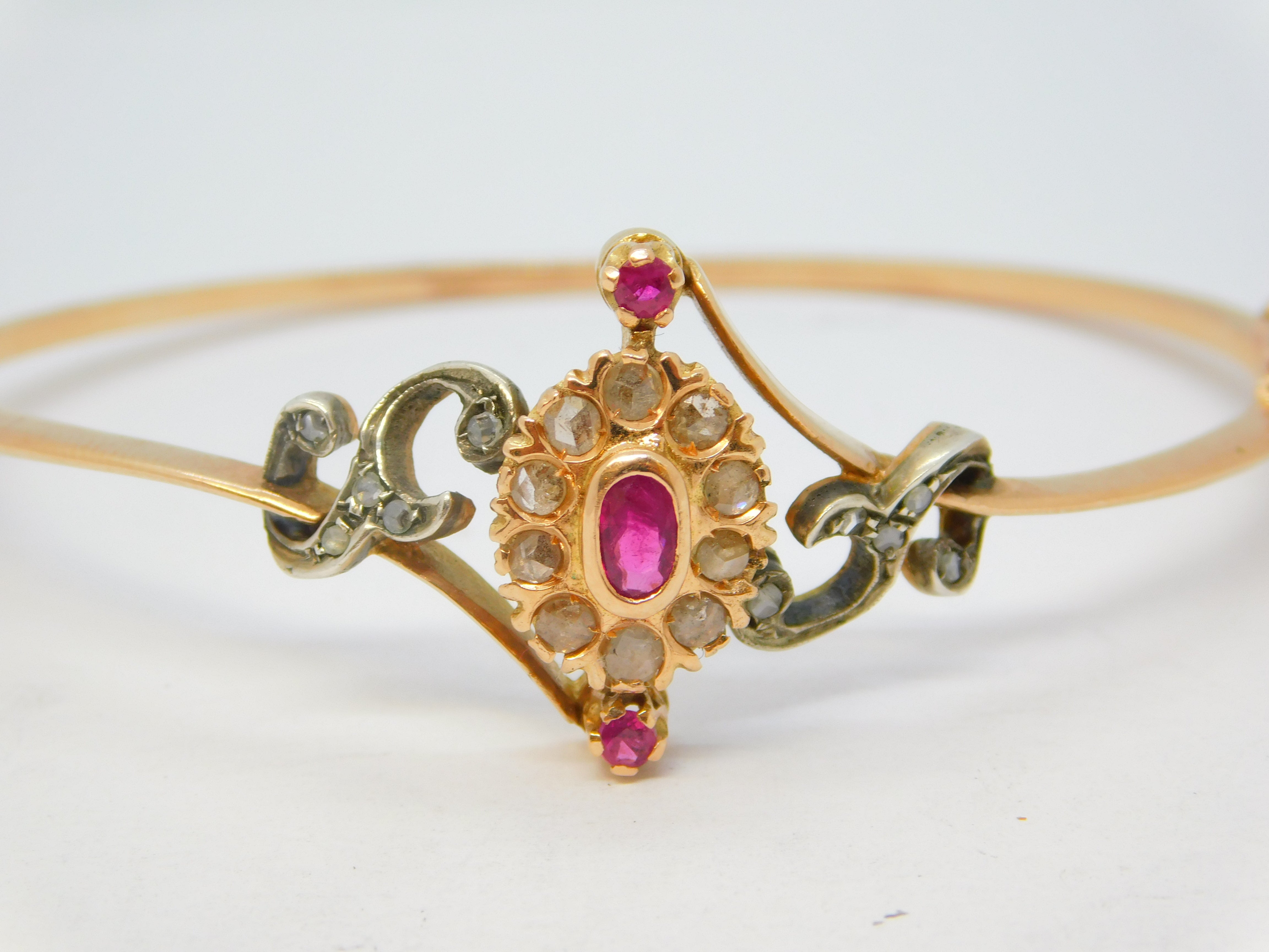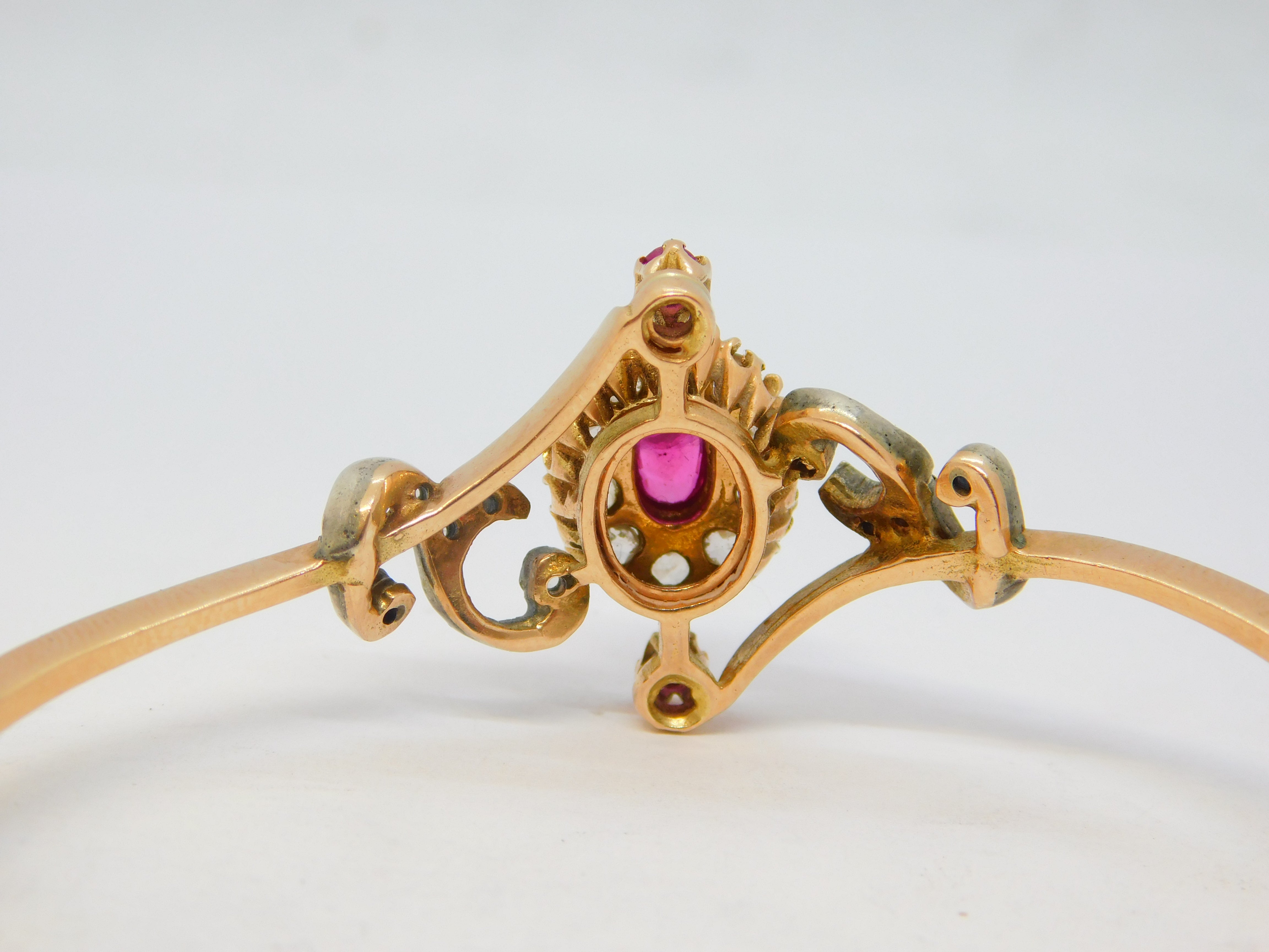 14ct Rose Gold, 1ct Old-Cut Diamond & Ruby Crossover Bangle Bracelet Antique c1920