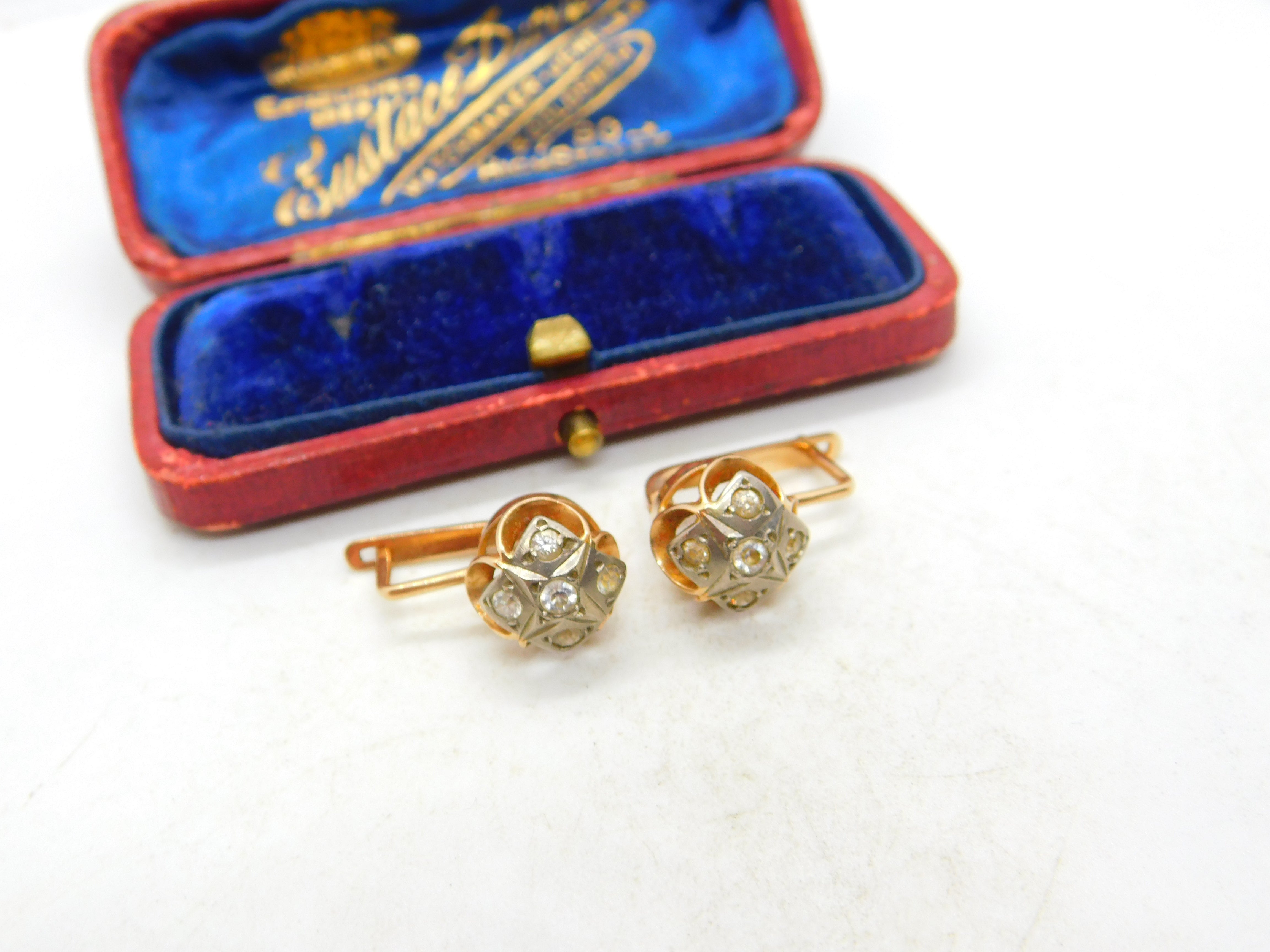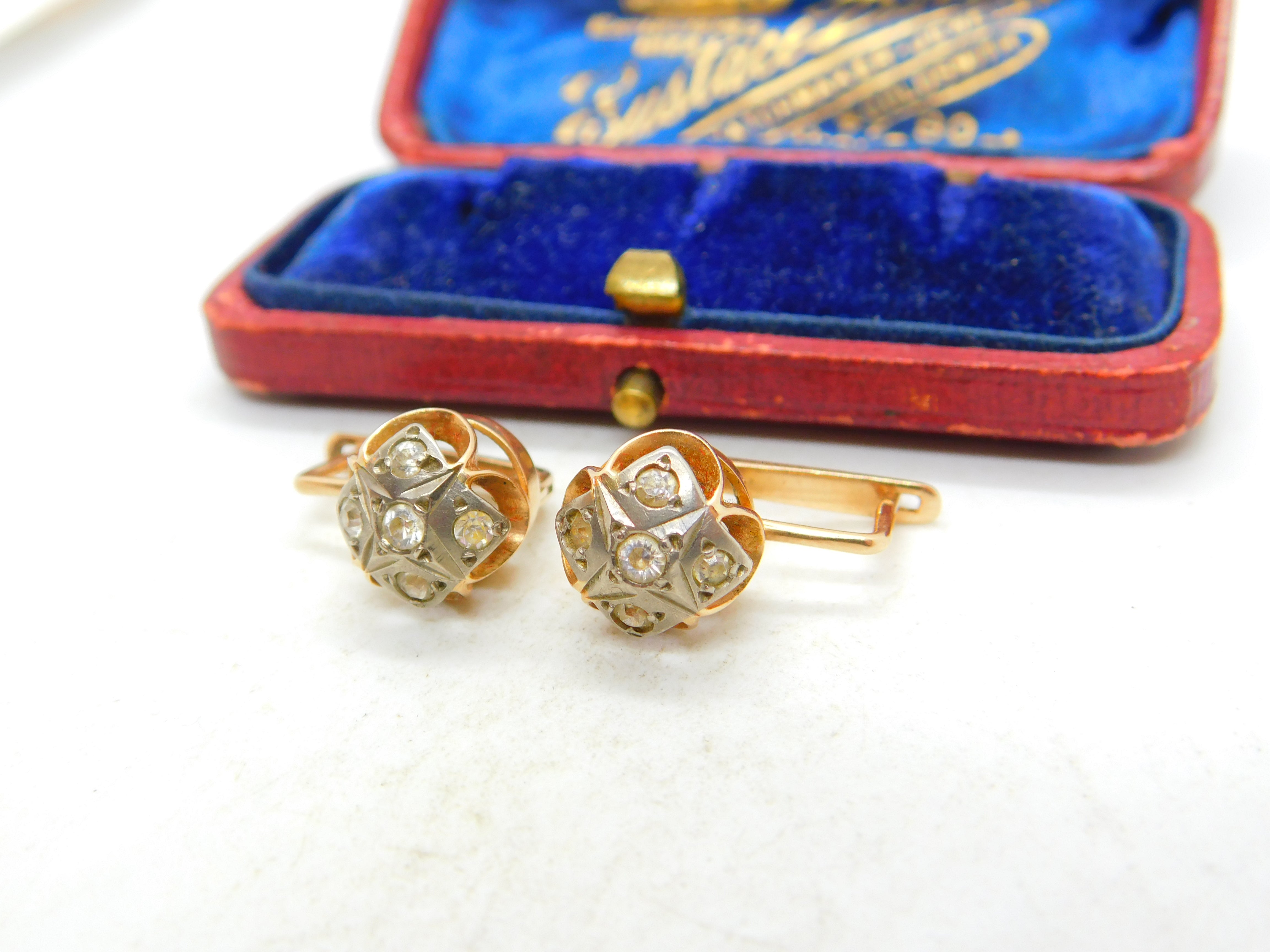 Pretty pair of vintage 14ct yellow gold drop pendant earrings set with clear faux diamond paste stones dating from the Art Deco period. The gold is marked to the back of the clips, this reads '.585' for 14ct gold. The stones have been tested, all are present and in good order please see the pictures. Good hinge to open and secure both, the earrings are for pierced ears. Wonderful pair of vintage earrings.