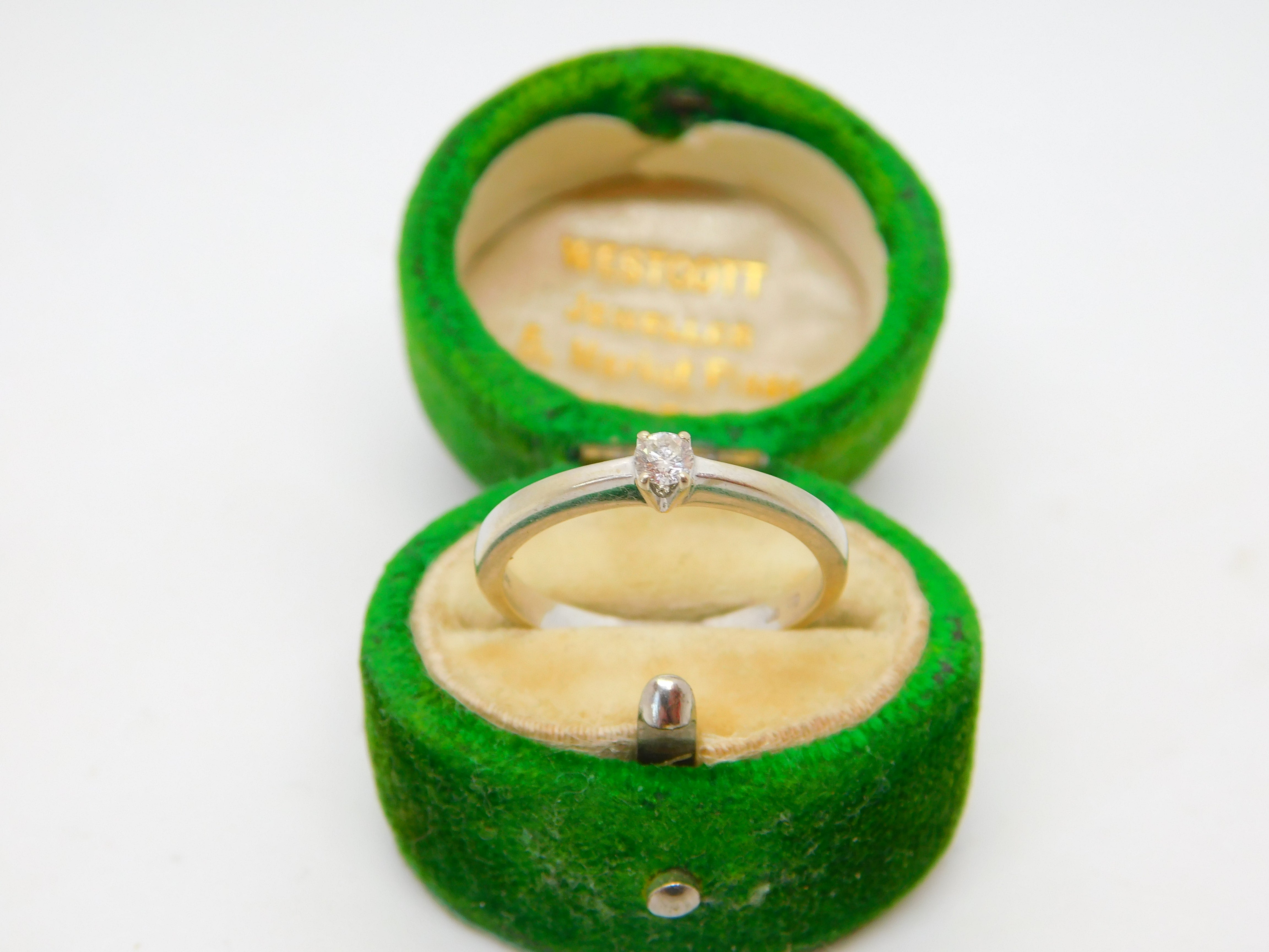 Details: A fantastic and wonderfully designed vintage 14ct white gold solitaire ring set with a central 0.1ct diamond hallmarked to the interior band c1970. The diamond has been tested. This is a wonderful item that would make a perfect gift or addition to any collection. The BOX pictured is for PRESENTATION ONLY and is NOT included in the listings but used to frame the pictures unless specifically stated otherwise.