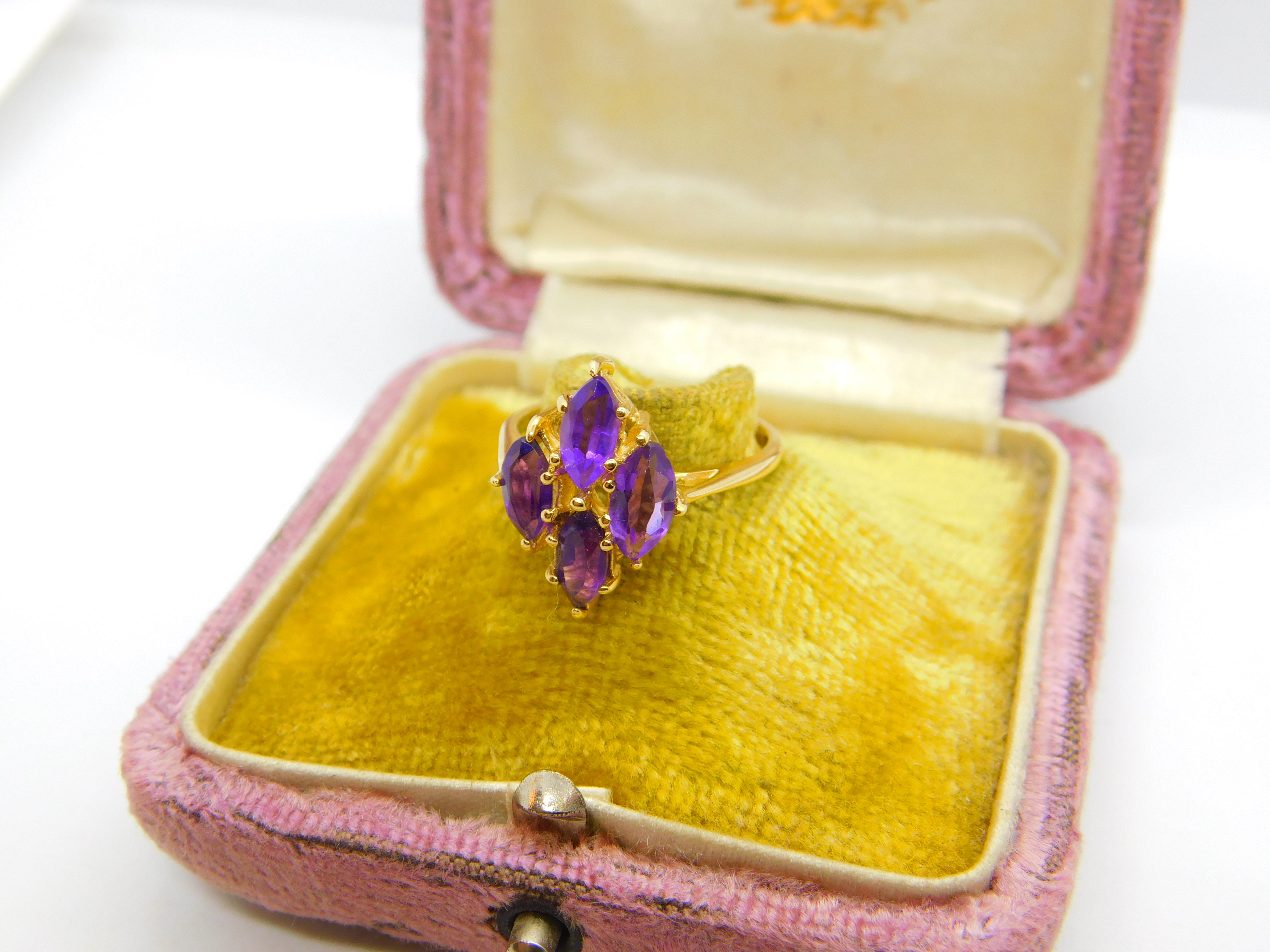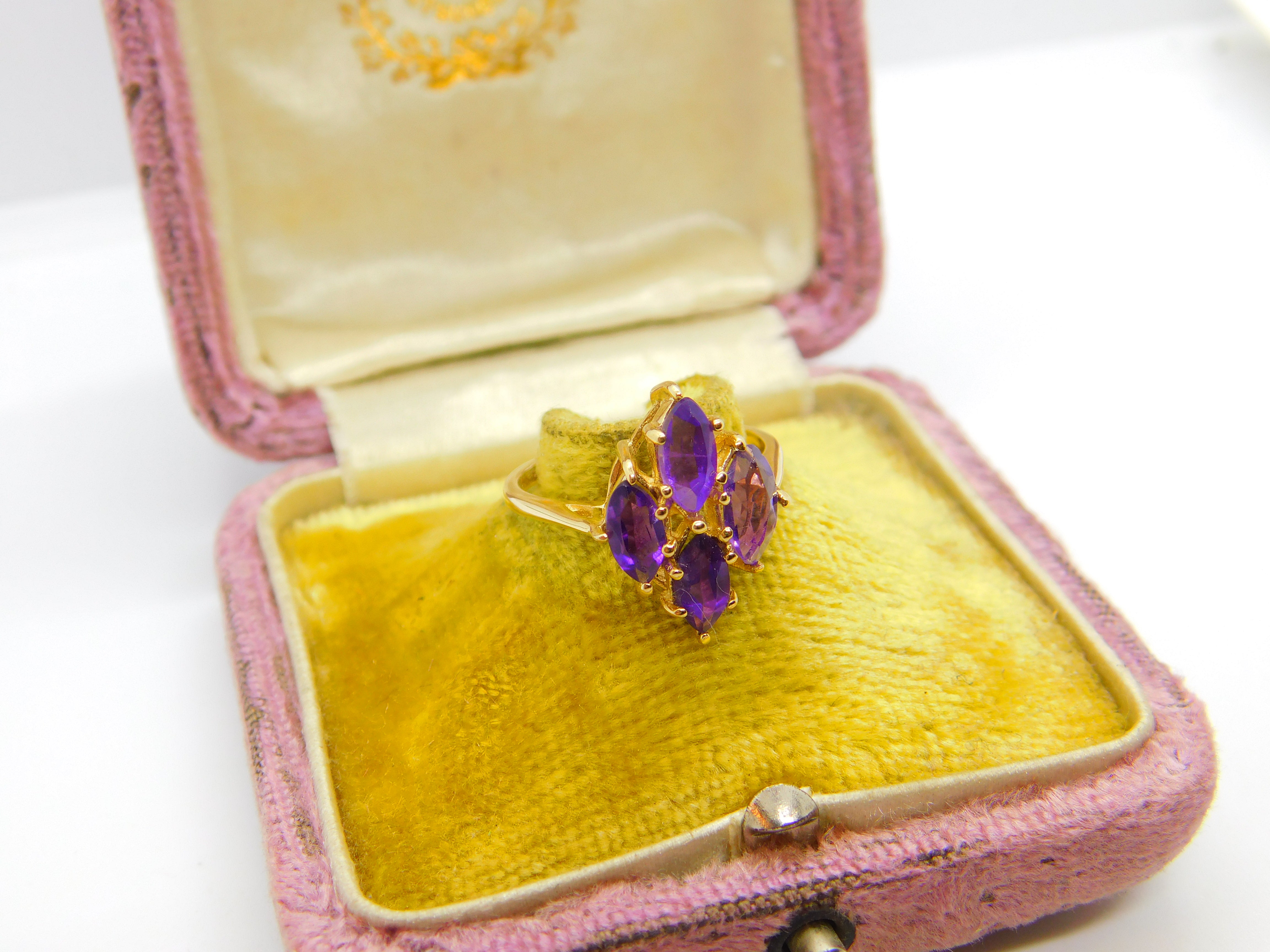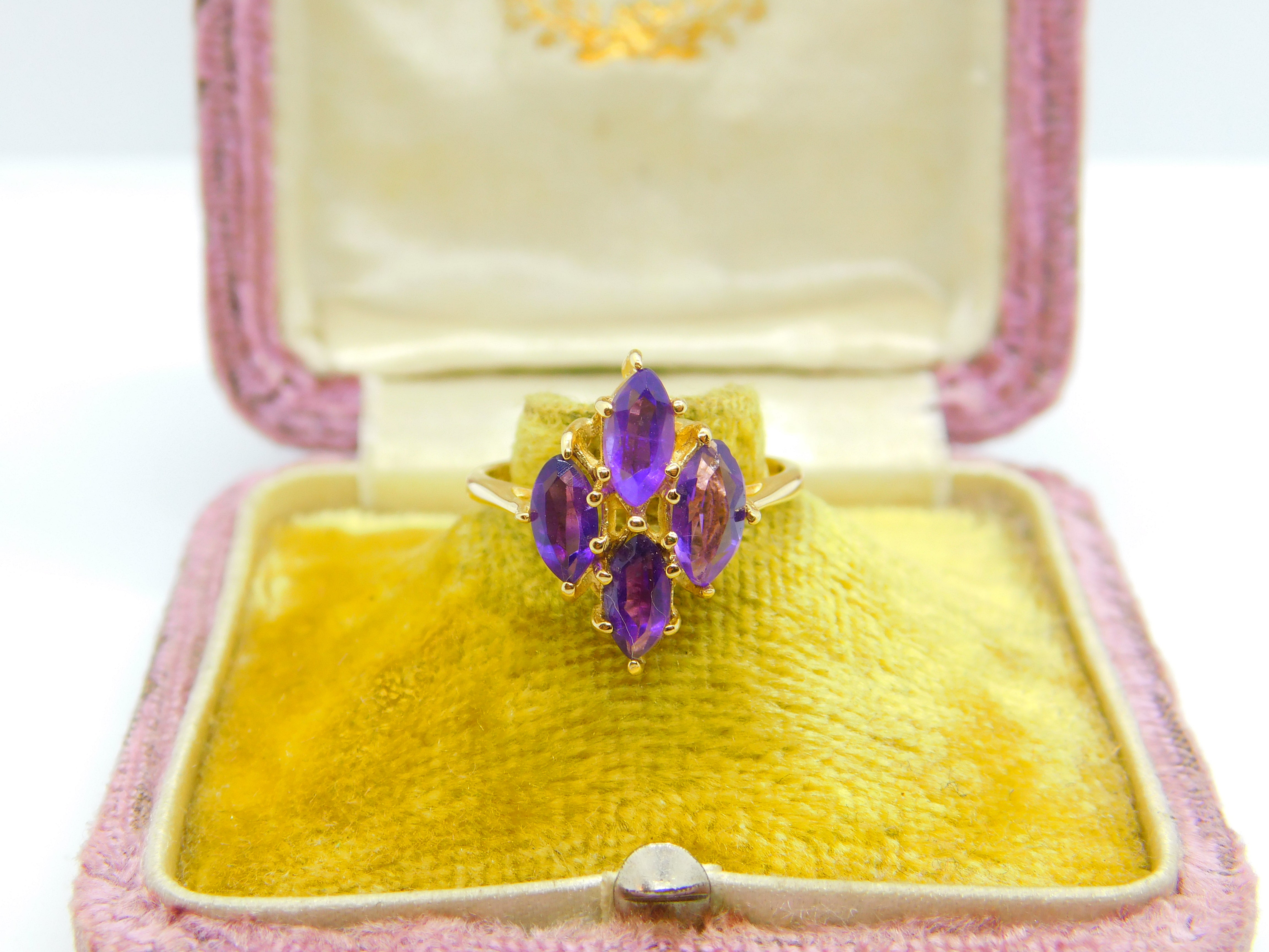 Details: A fantastic and wonderfully designed antique art deco 14ct yellow gold and amethyst set floral cluster ring hallmarked 14K to the interior band c1930. This is a wonderful item that would make a perfect gift or addition to any collection. The BOX pictured is for PRESENTATION ONLY and is NOT included in the listings but used to frame the pictures unless specifically stated otherwise.