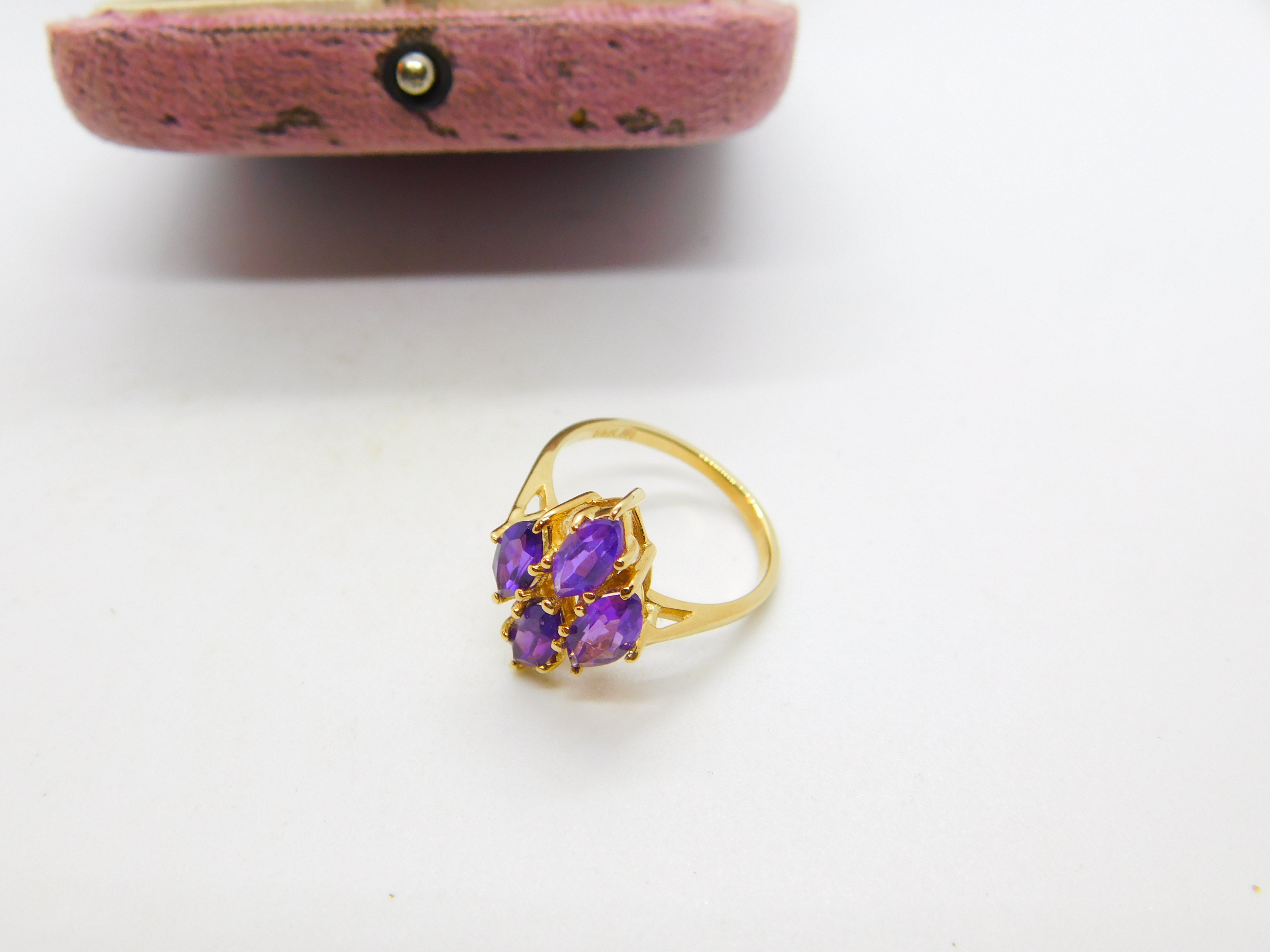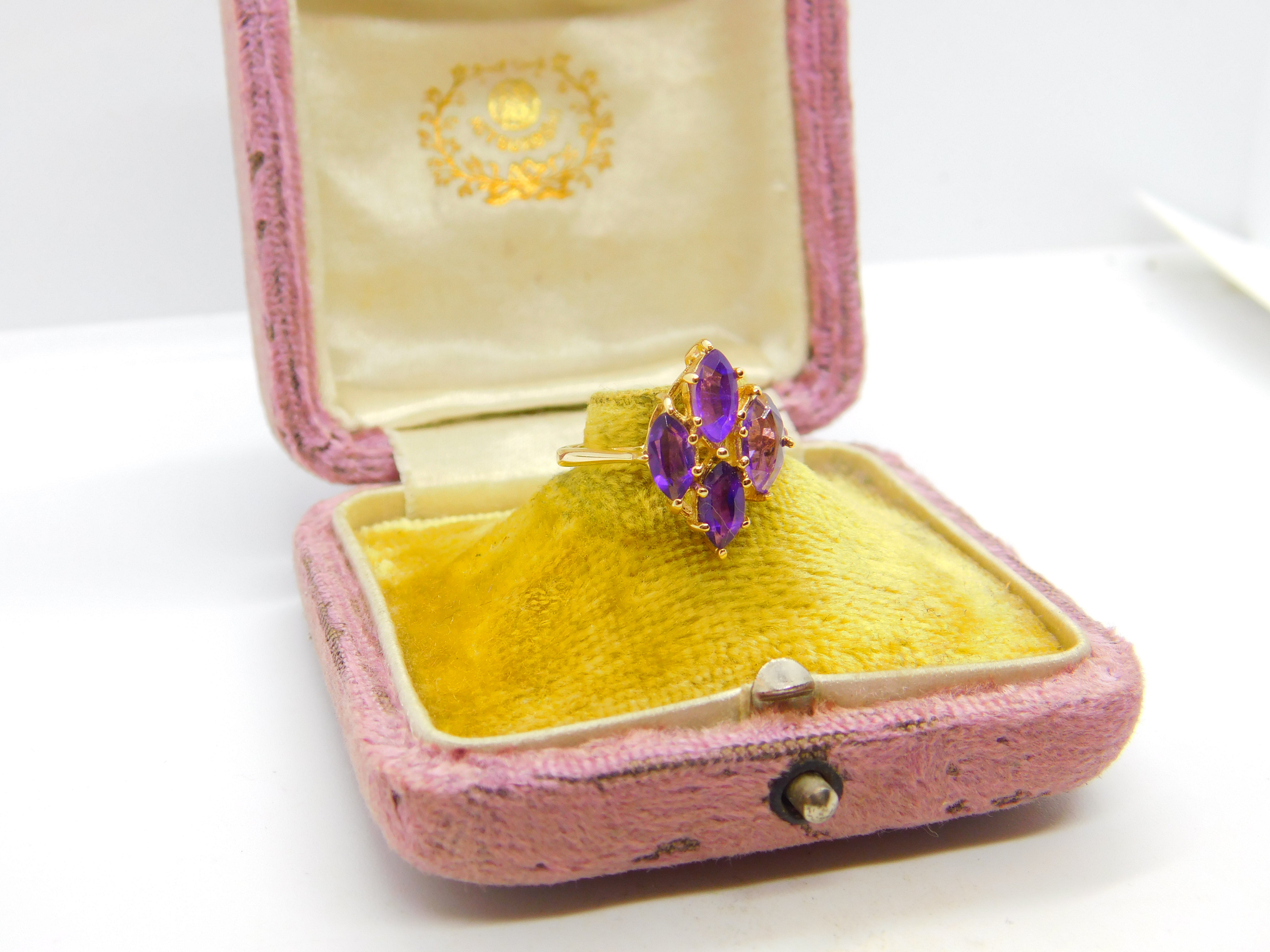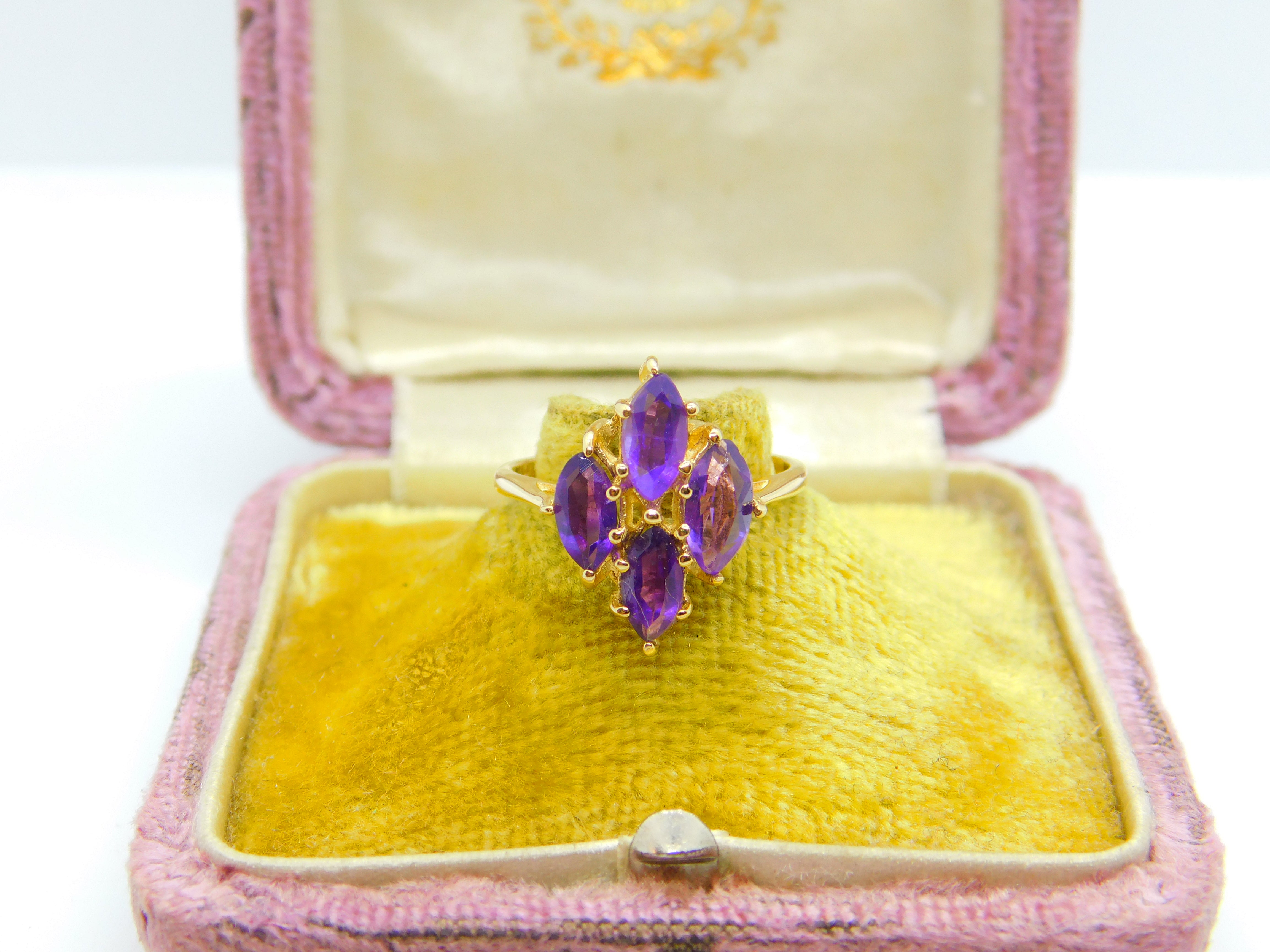Details: A fantastic and wonderfully designed antique art deco 14ct yellow gold and amethyst set floral cluster ring hallmarked 14K to the interior band c1930. This is a wonderful item that would make a perfect gift or addition to any collection. The BOX pictured is for PRESENTATION ONLY and is NOT included in the listings but used to frame the pictures unless specifically stated otherwise.