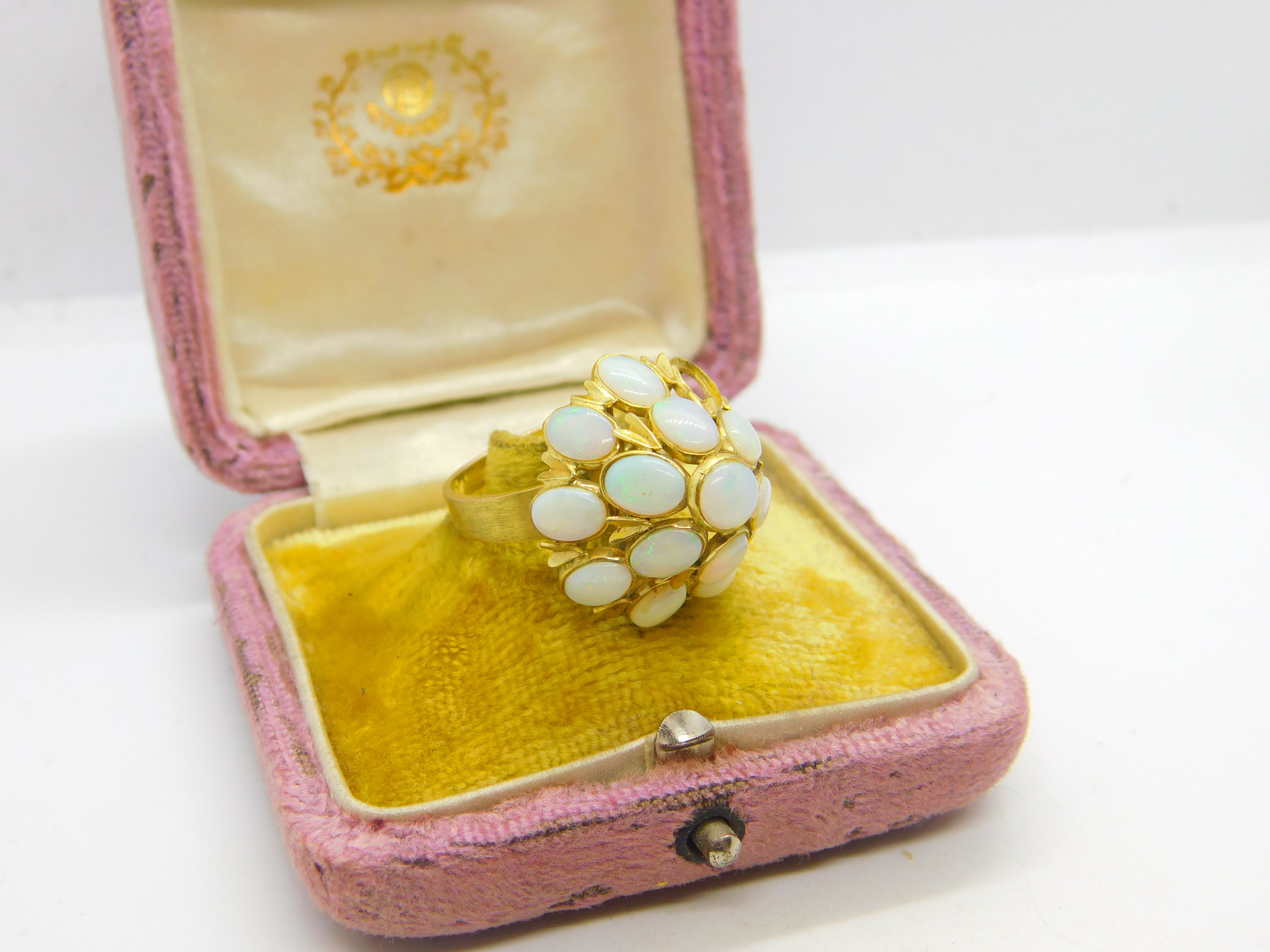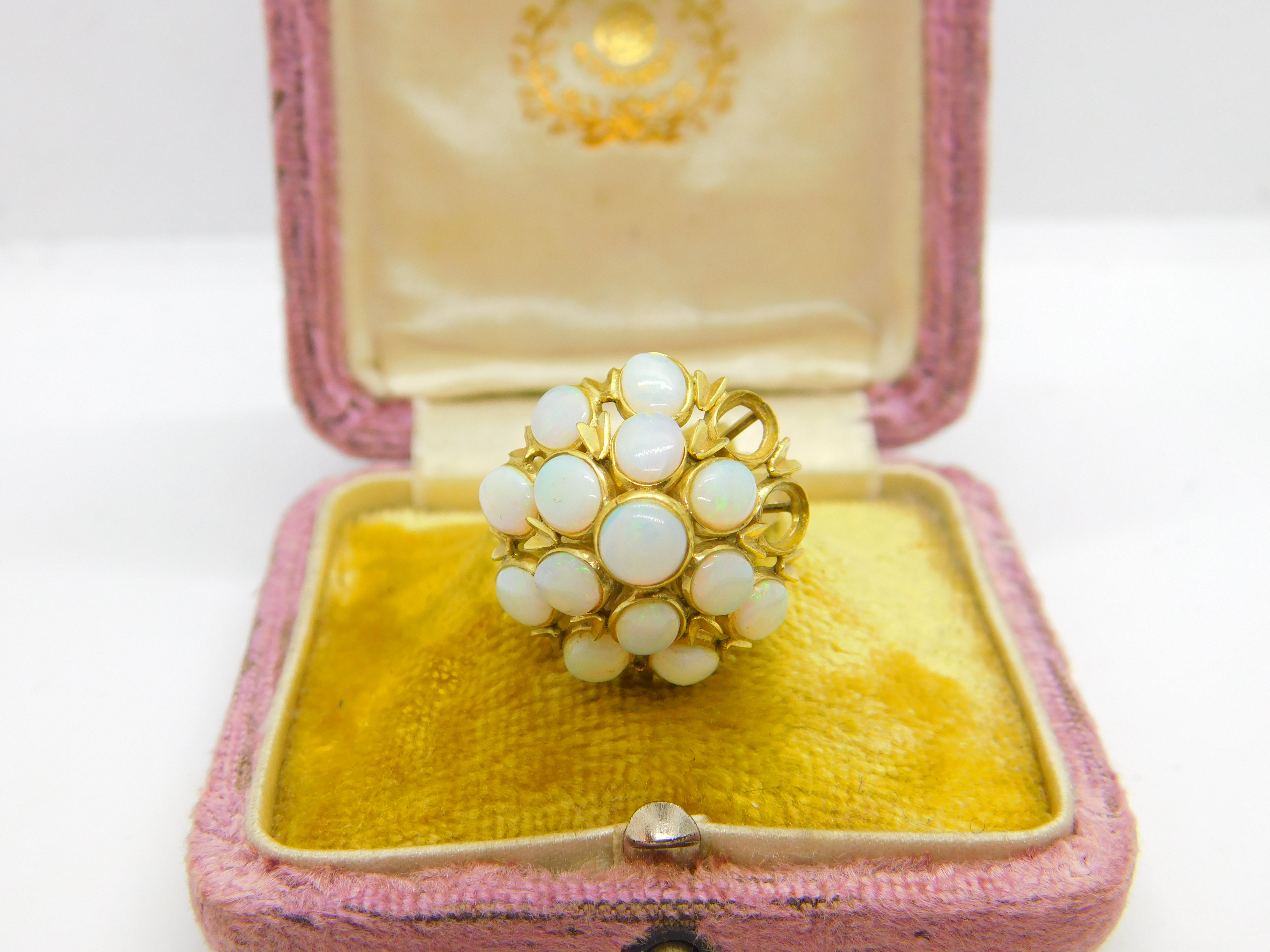 Details: A fantastic and wonderfully designed antique art deco 14ct yellow gold statement ring set with cabochon fire opals hallmarked to the interior band c1920. Missing two opals unfortunately. This is a wonderful item that would make a perfect gift or addition to any collection. The BOX pictured is for PRESENTATION ONLY and is NOT included in the listings but used to frame the pictures unless specifically stated otherwise.
