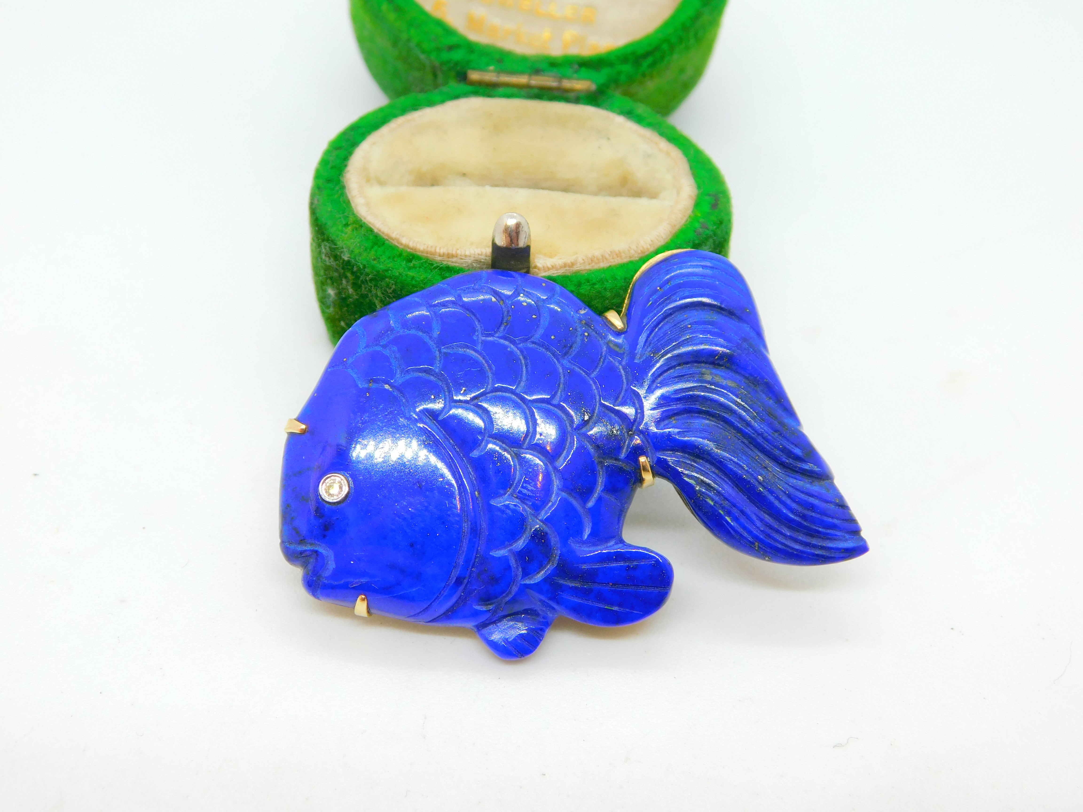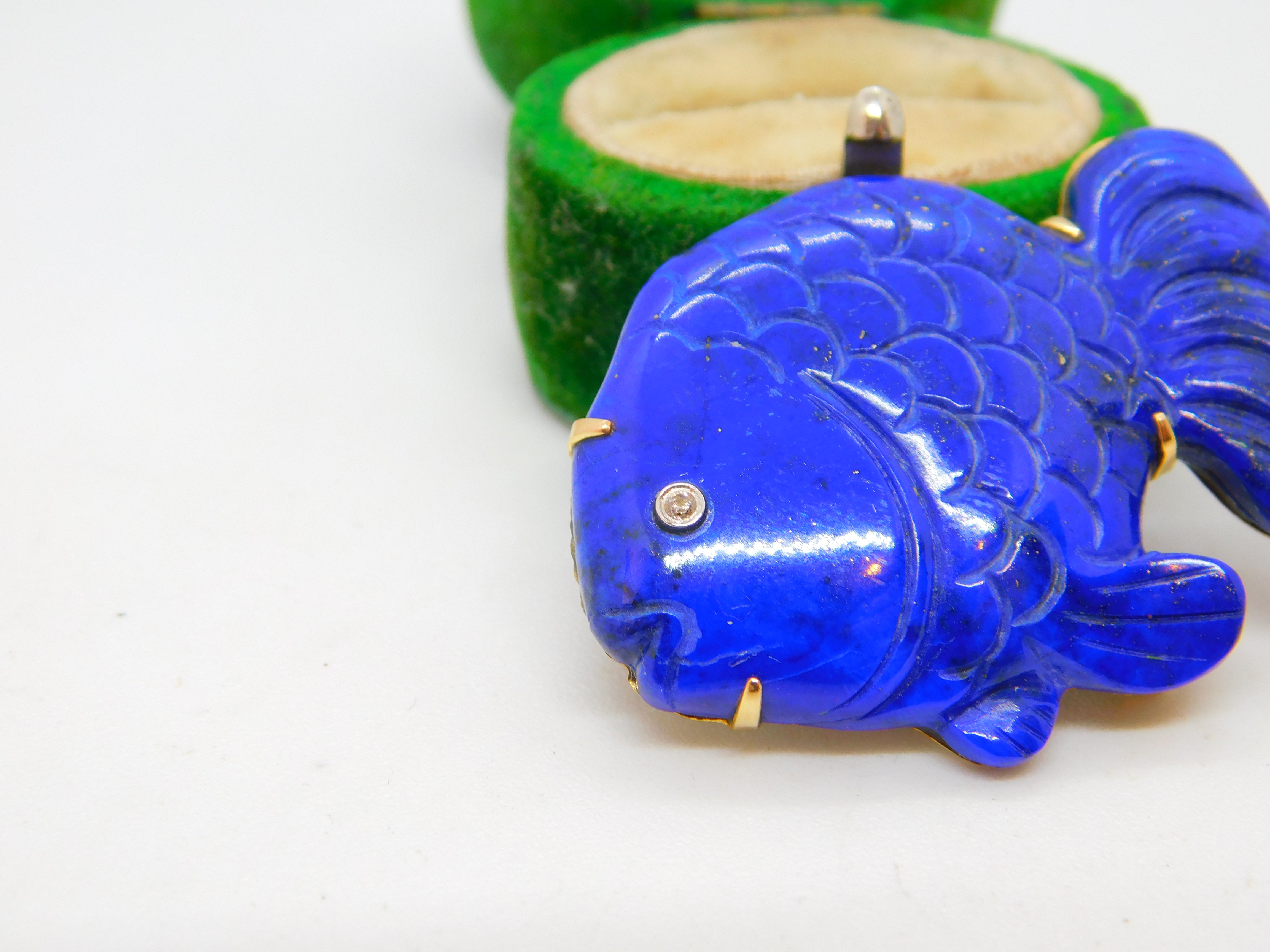 14ct Yellow Gold, Carved Lapis Lazuli & Diamond Fish Brooch Vintage c1980