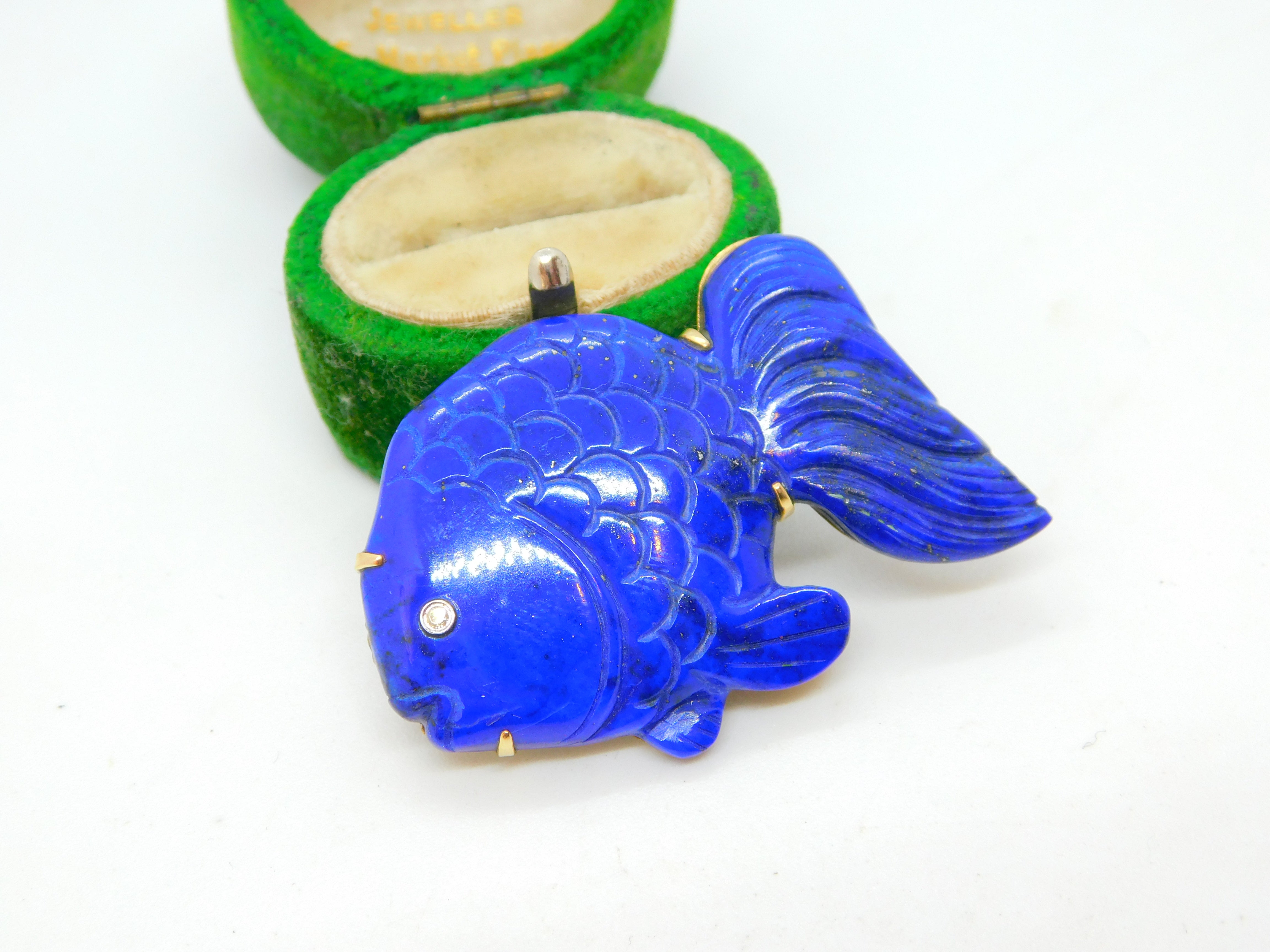 Details: A fantastic and wonderfully designed vintage 14ct yellow gold mounted carved lapis lazuli brooch in the form of a tropical fish set with 0.1ct diamond to the eye c1980, the gold has been XRF tested as it is unmarked. This is a wonderful item that would make a perfect gift or addition to any collection. The BOX pictured is for PRESENTATION ONLY and is NOT included in the listings but used to frame the pictures unless specifically stated otherwise.