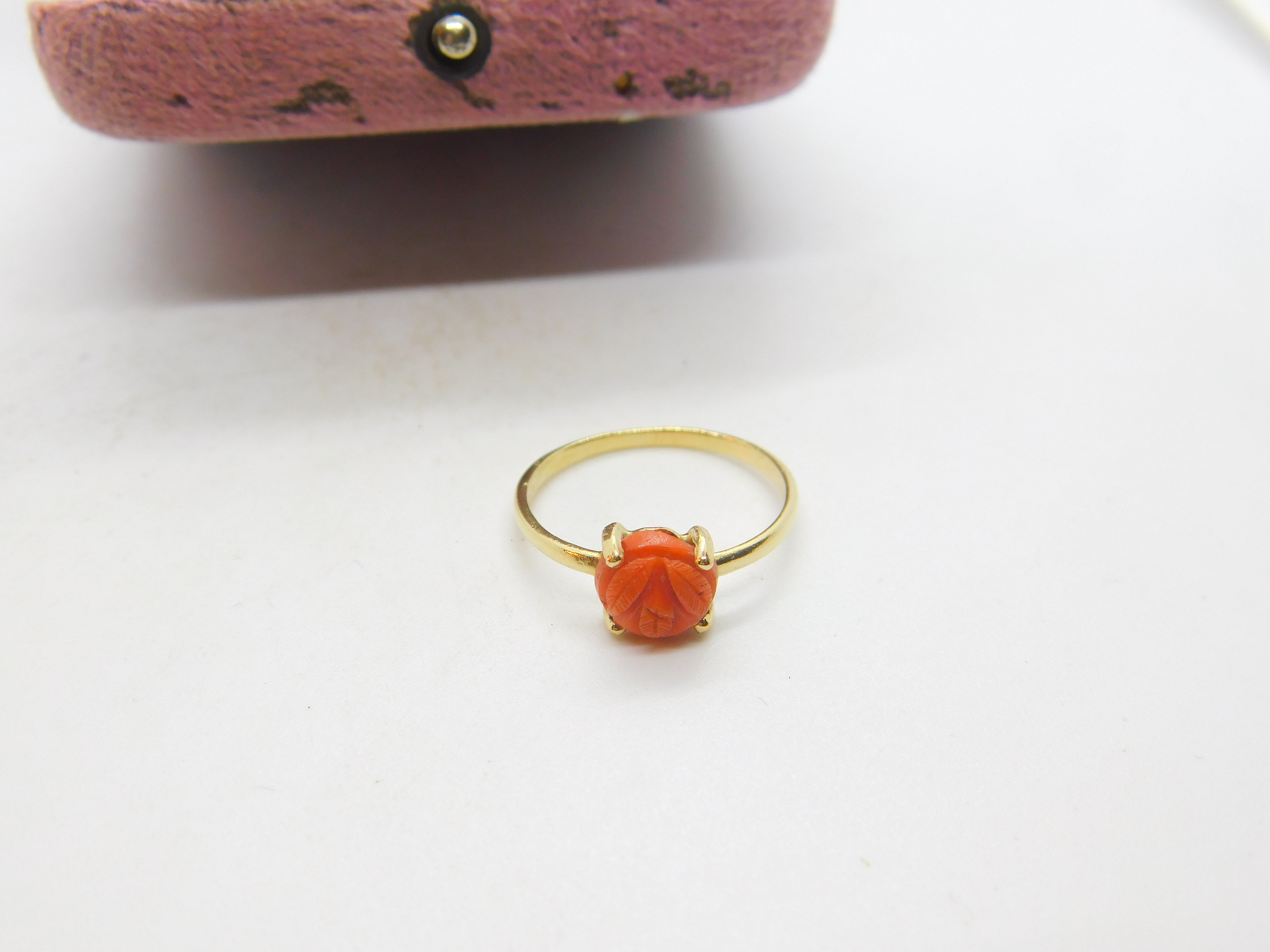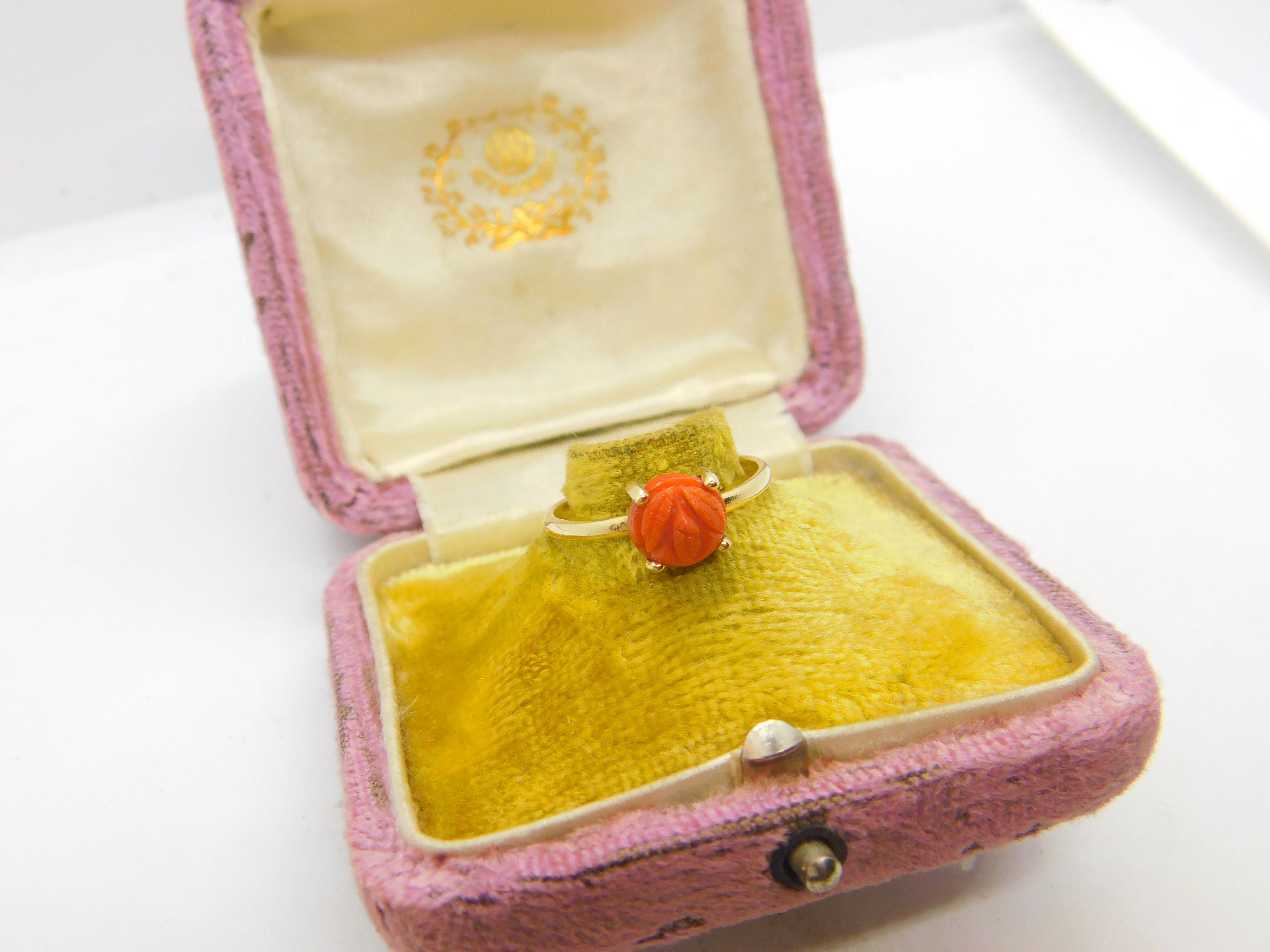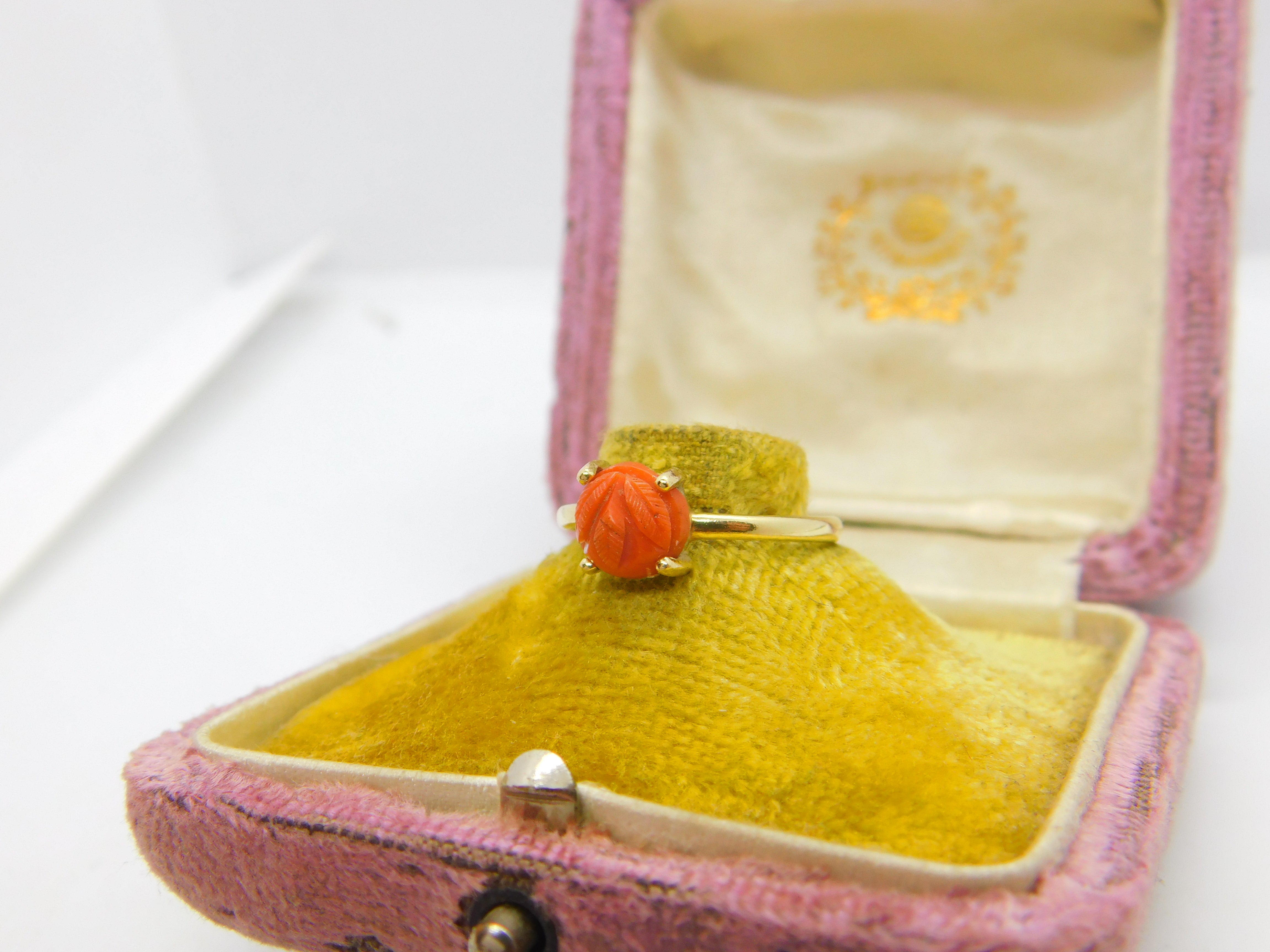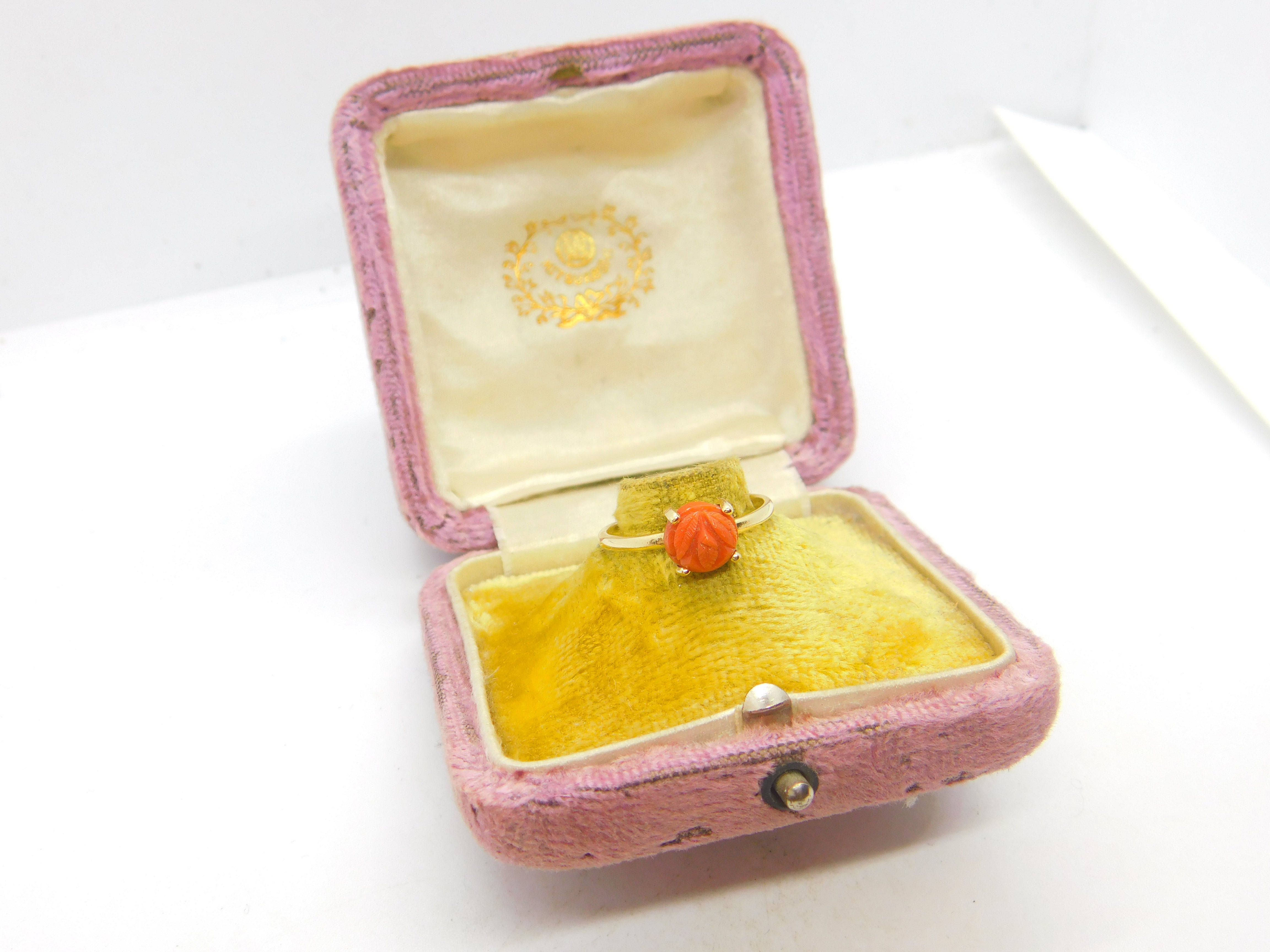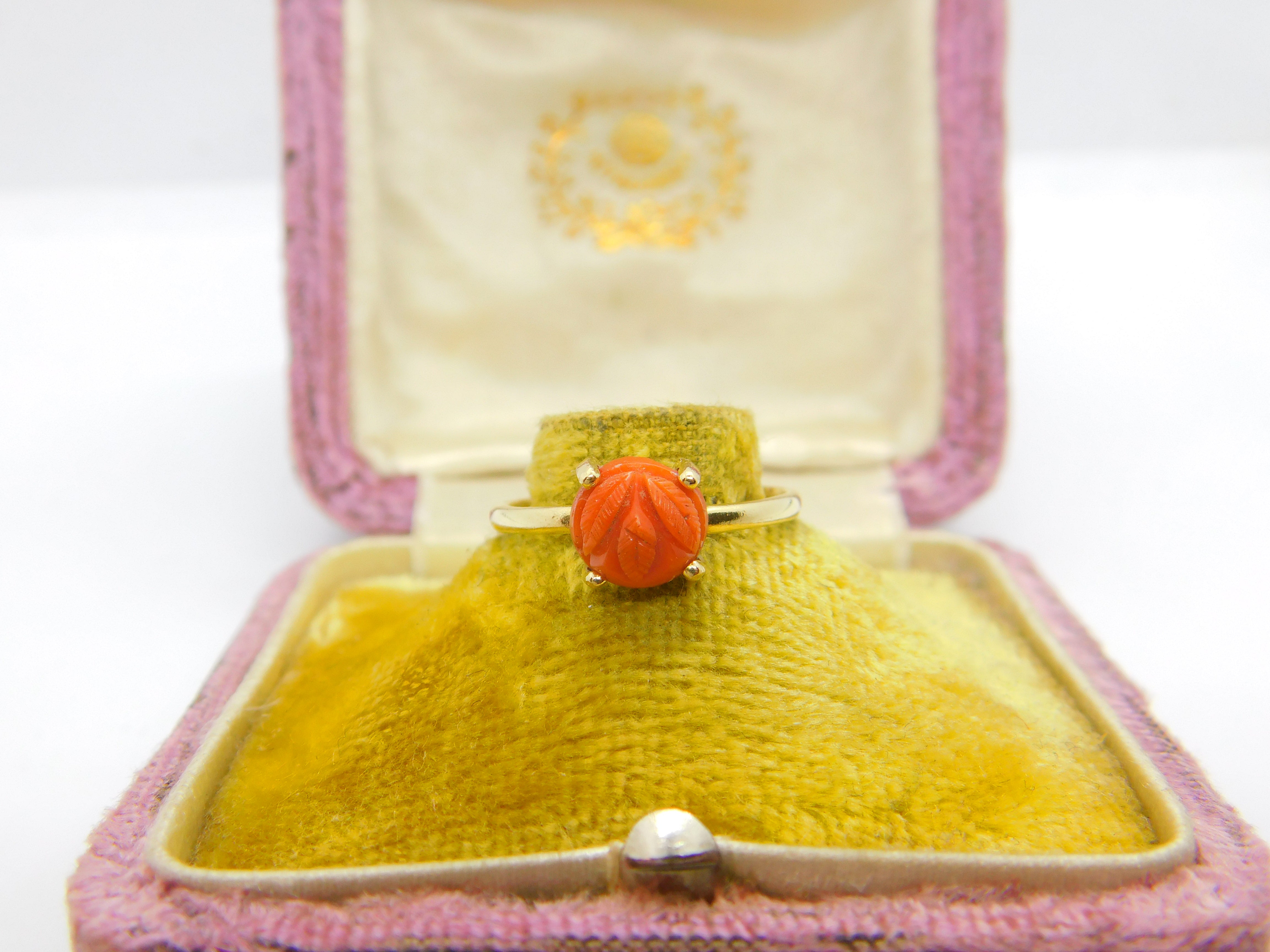 Details: A fantastic and wonderfully designed antique art deco 14ct yellow gold and carved floral coral set band ring c1920 - the gold has been XRF tested. This is a wonderful item that would make a perfect gift or addition to any collection. The BOX pictured is for PRESENTATION ONLY and is NOT included in the listings but used to frame the pictures unless specifically stated otherwise.