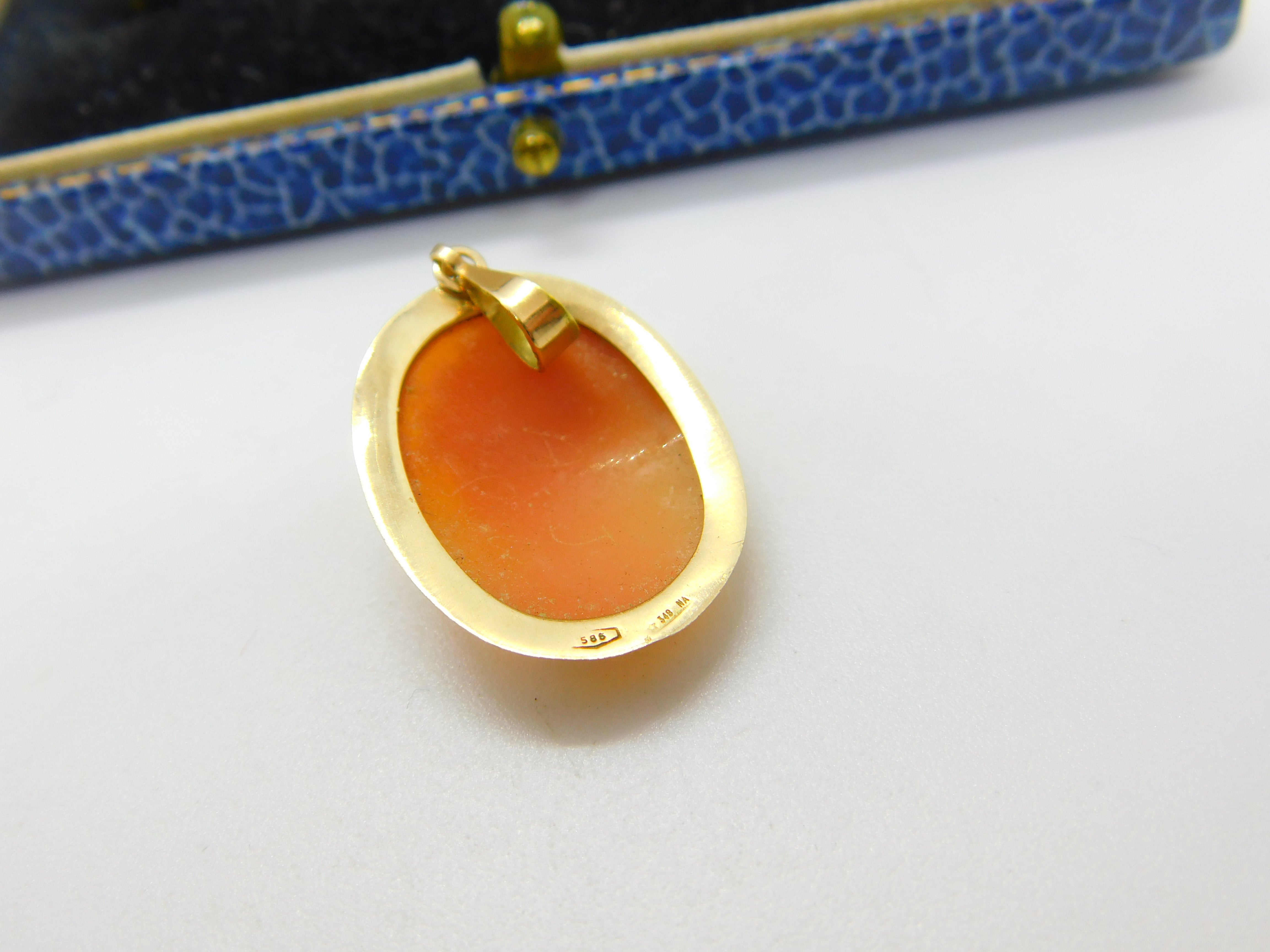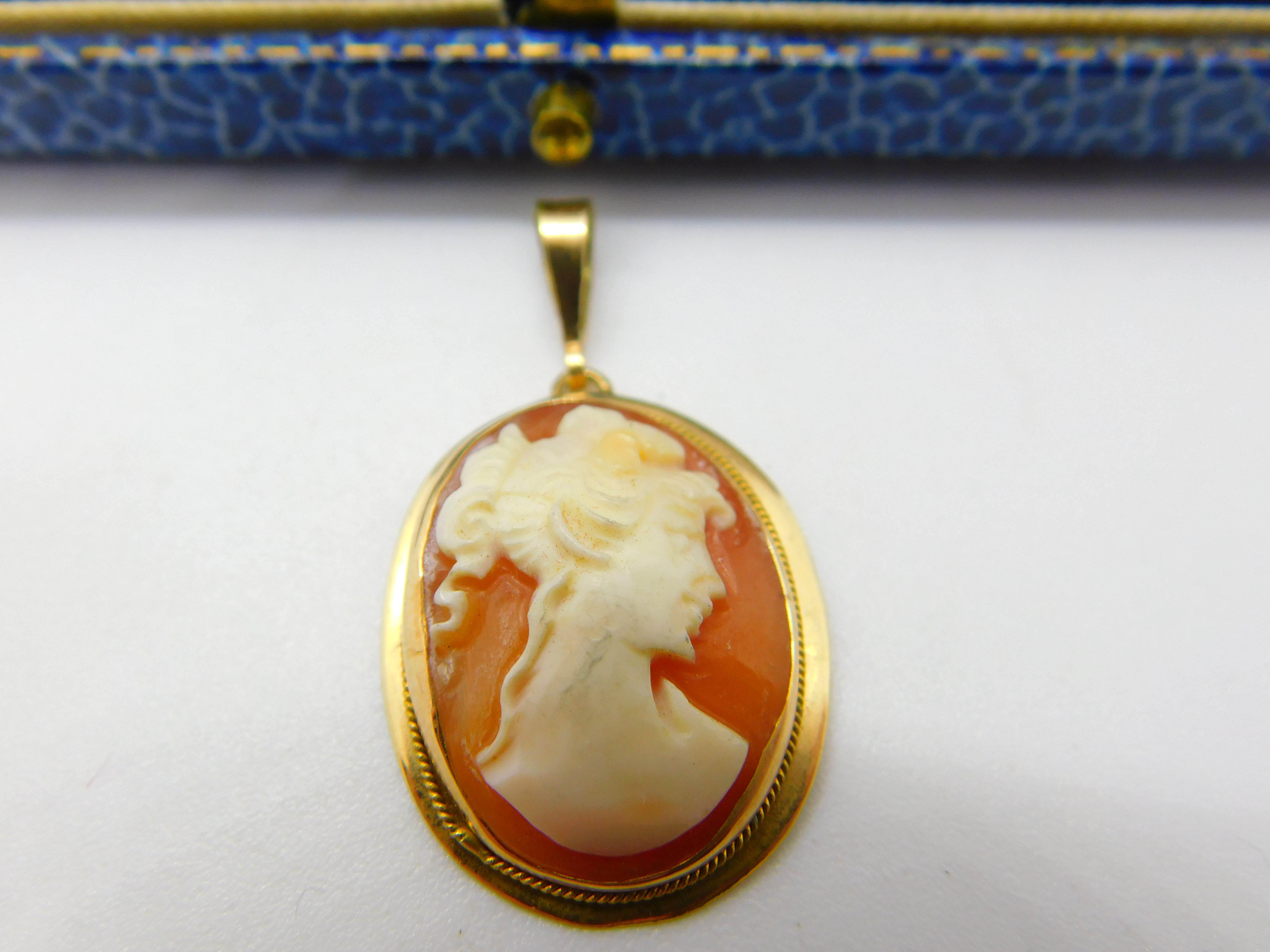 14ct Yellow Gold & Carved Shell Cameo Classical Lady Pendant Vintage c1970