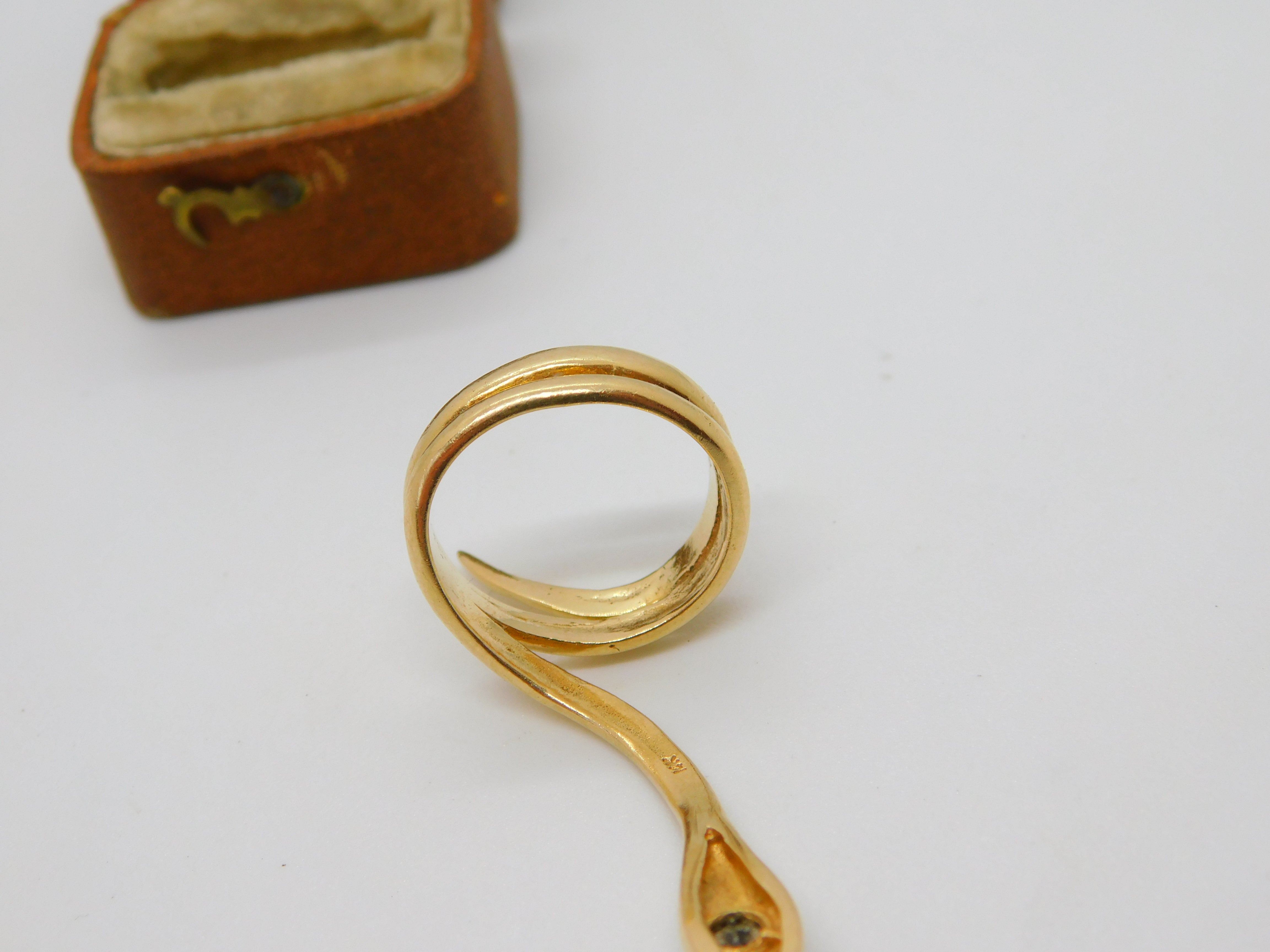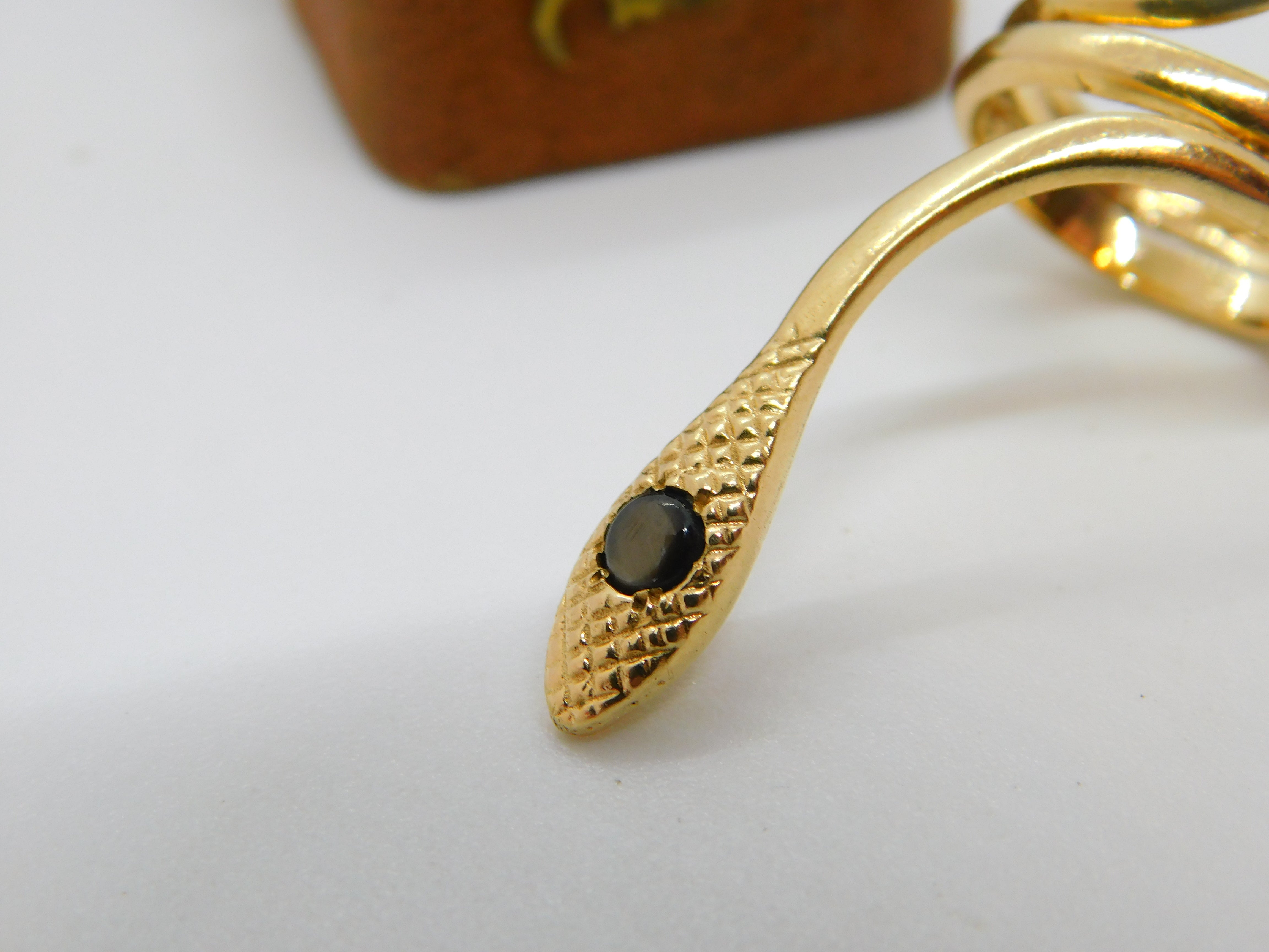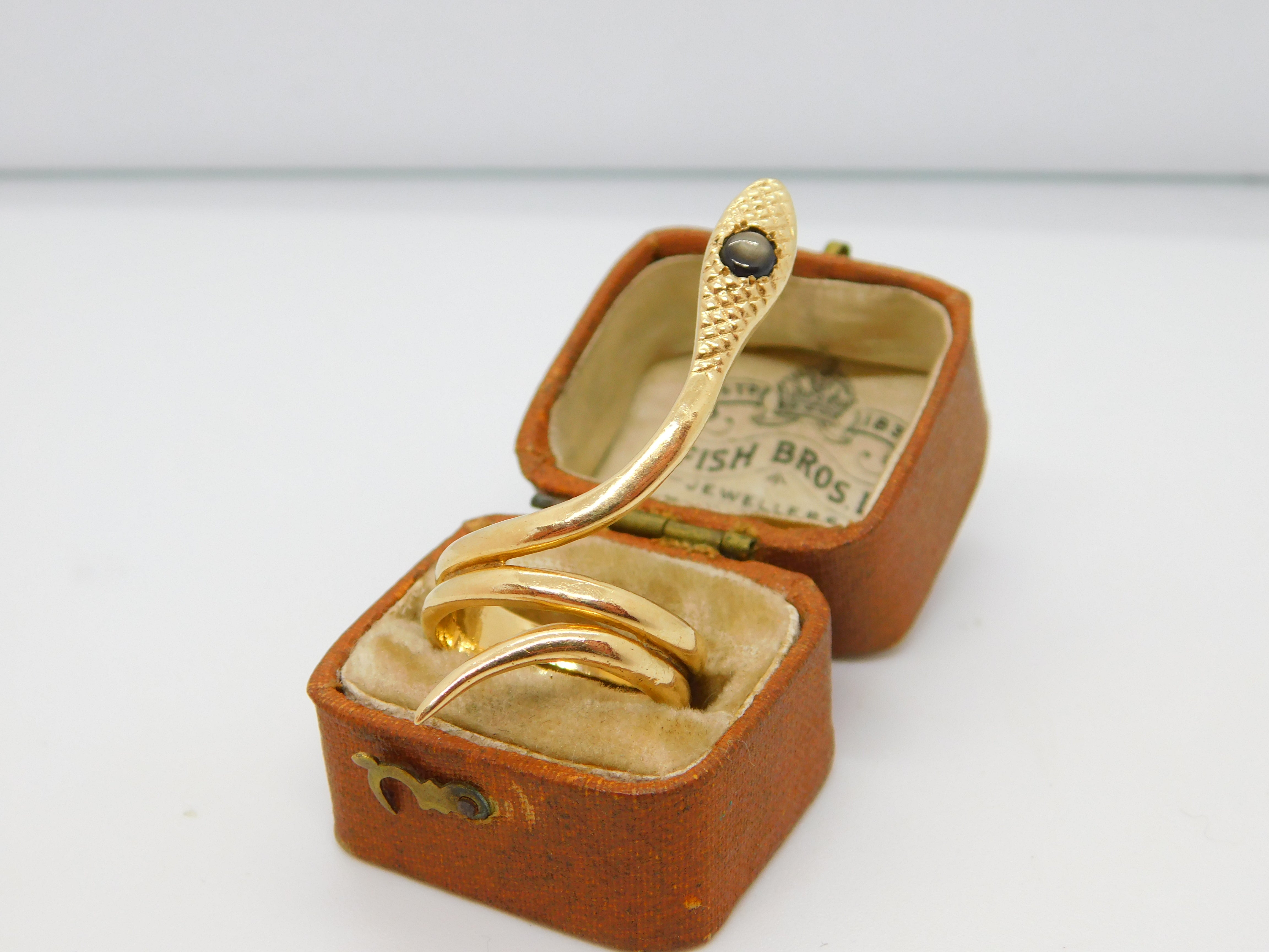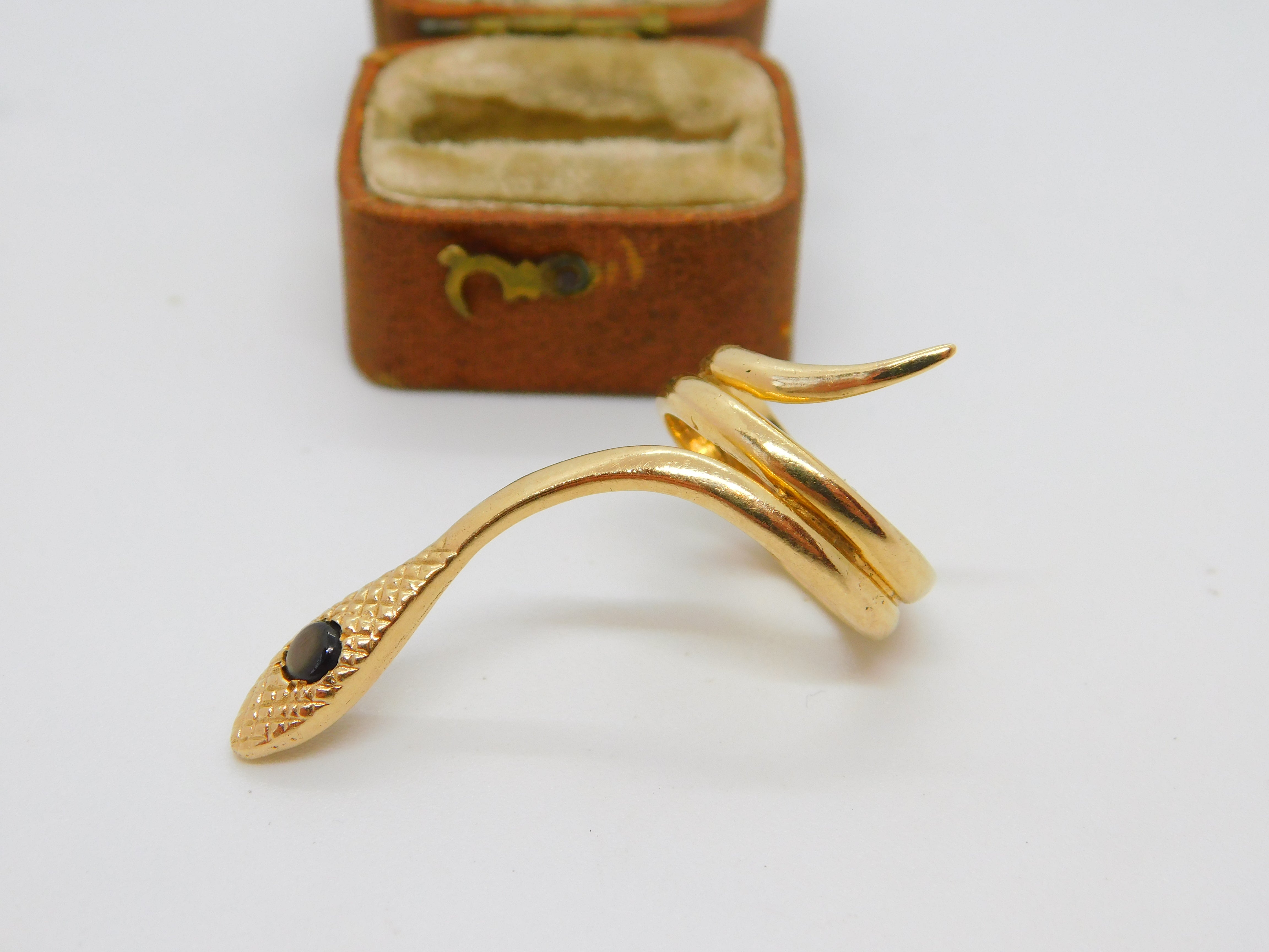 Details: A fantastic and wonderfully designed vintage 14ct yellow gold large serpent or snake statement ring set with a cats eye stone to the face of the snake hallmarked to the interior c1980. This is a wonderful item that would make a perfect gift or addition to any collection. The BOX pictured is for PRESENTATION ONLY and is NOT included in the listings but used to frame the pictures unless specifically stated otherwise.