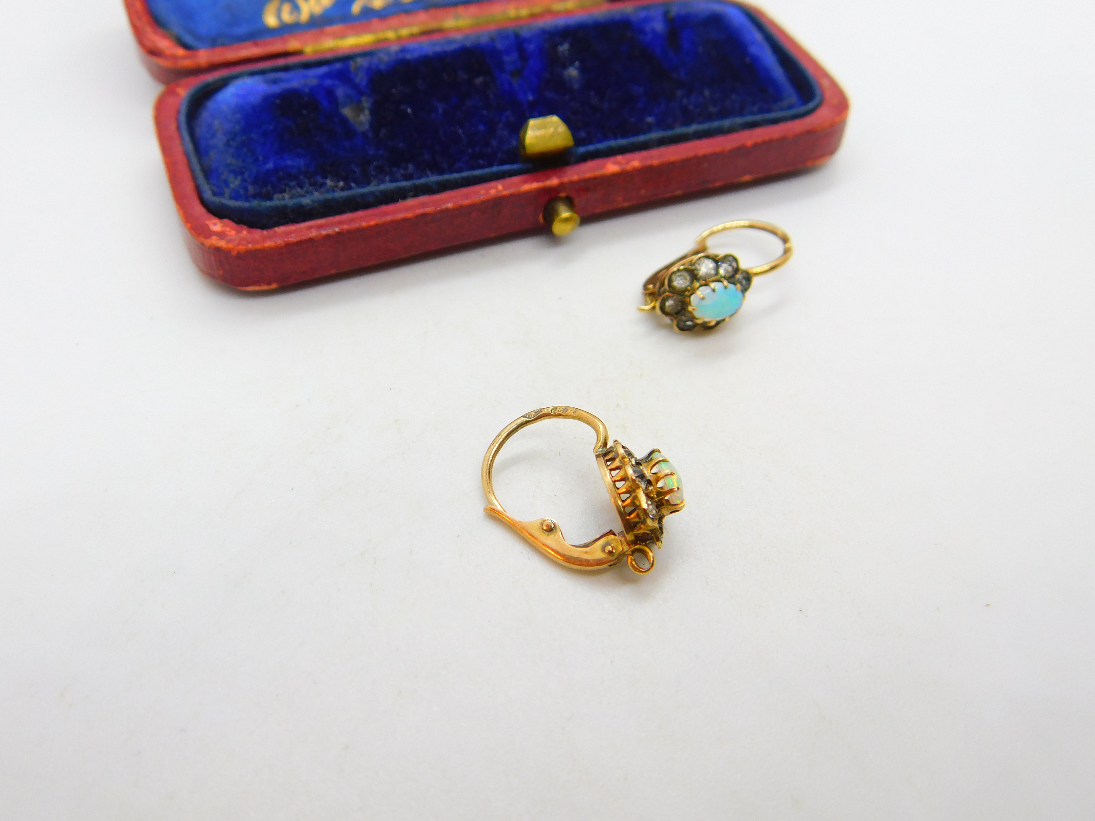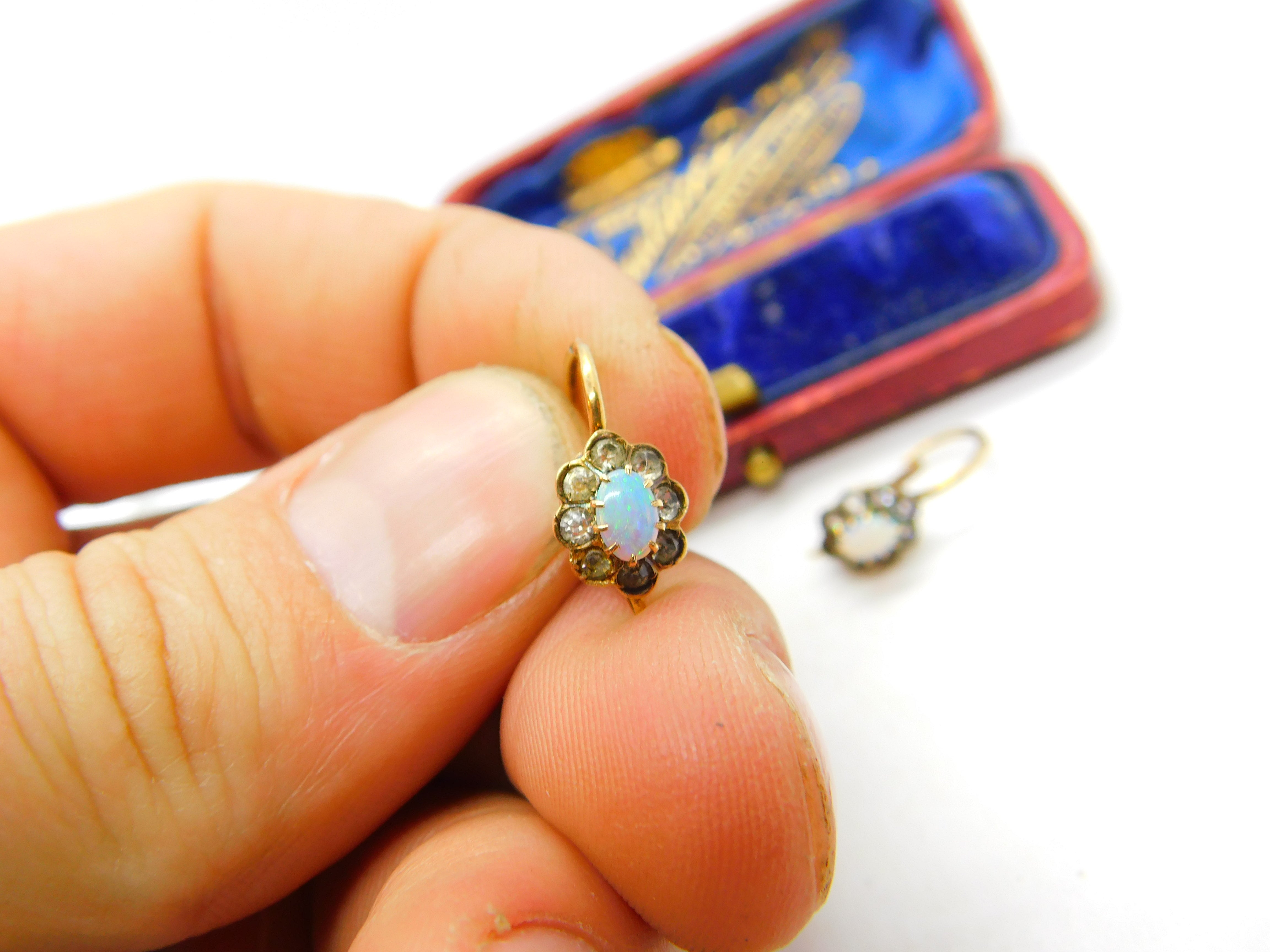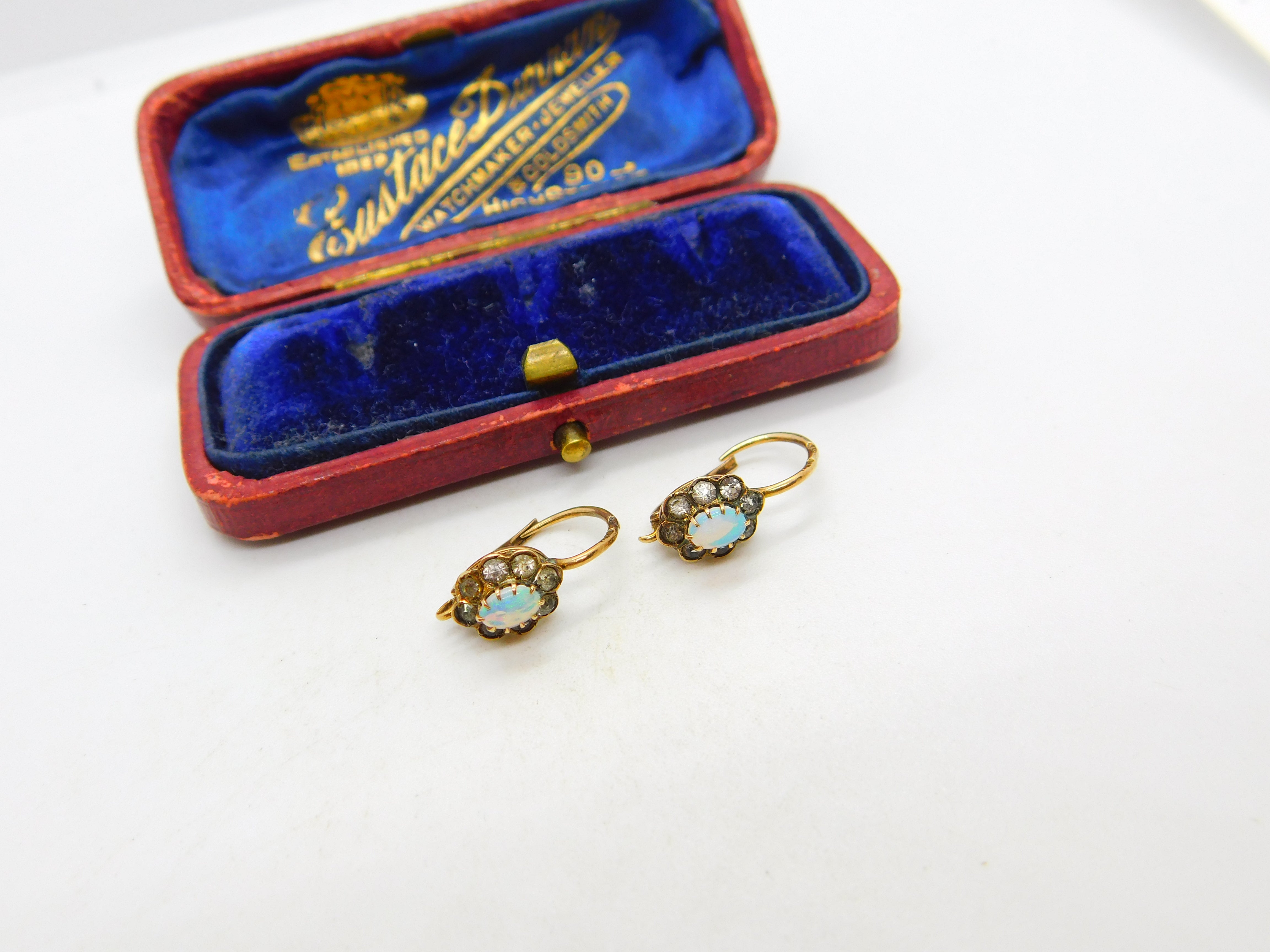 14ct Yellow Gold, Diamond Paste & Cabochon Opal Floral Earrings Antique c1920