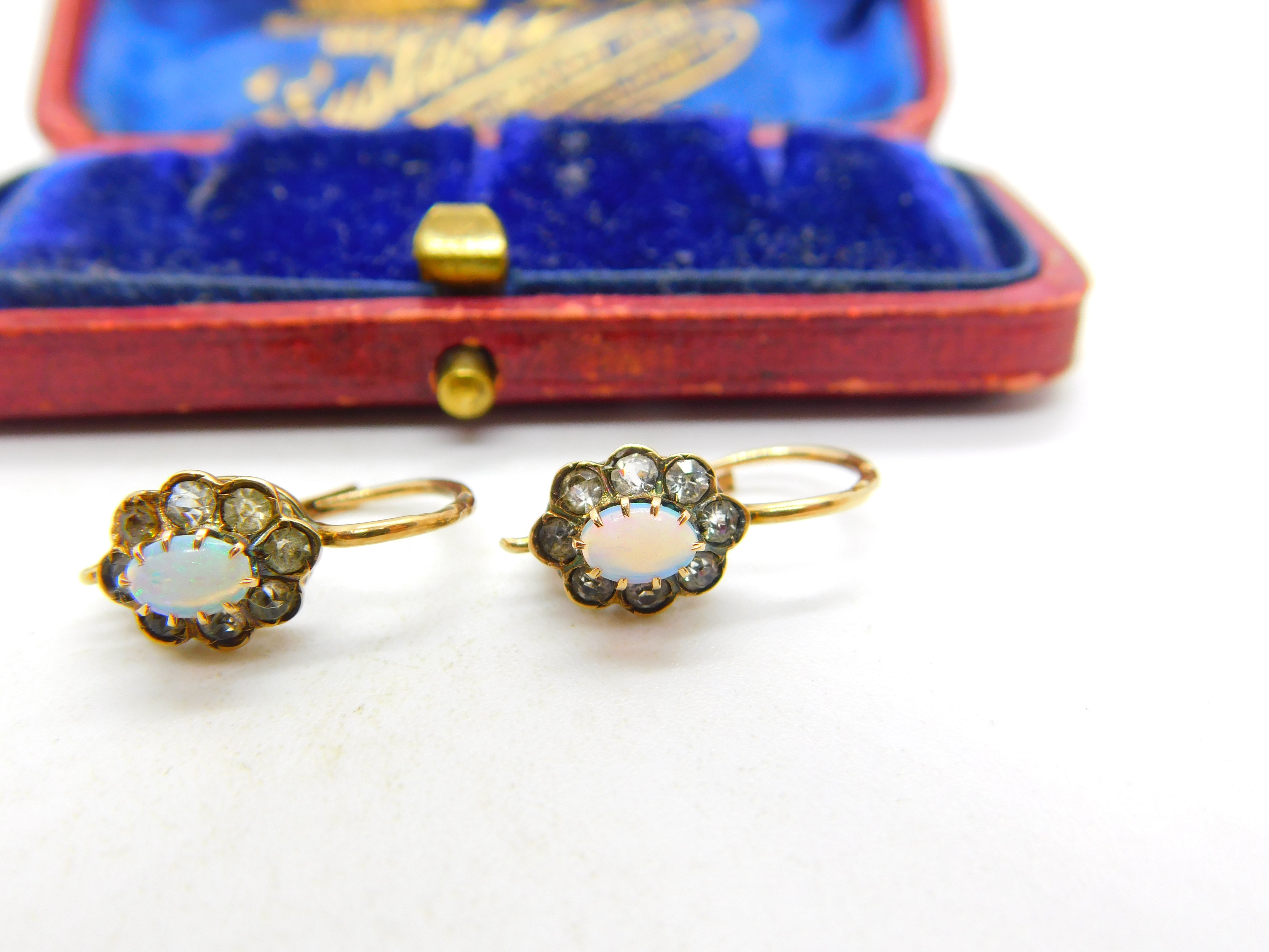 Details: A fantastic and wonderfully designed antique 14ct yellow gold floral cluster earrings set with diamond paste and central cabochon opals hallmarked to the back clips c1920. This is a wonderful item that would make a perfect gift or addition to any collection. The BOX pictured is for PRESENTATION ONLY and is NOT included in the listings but used to frame the pictures unless specifically stated otherwise.