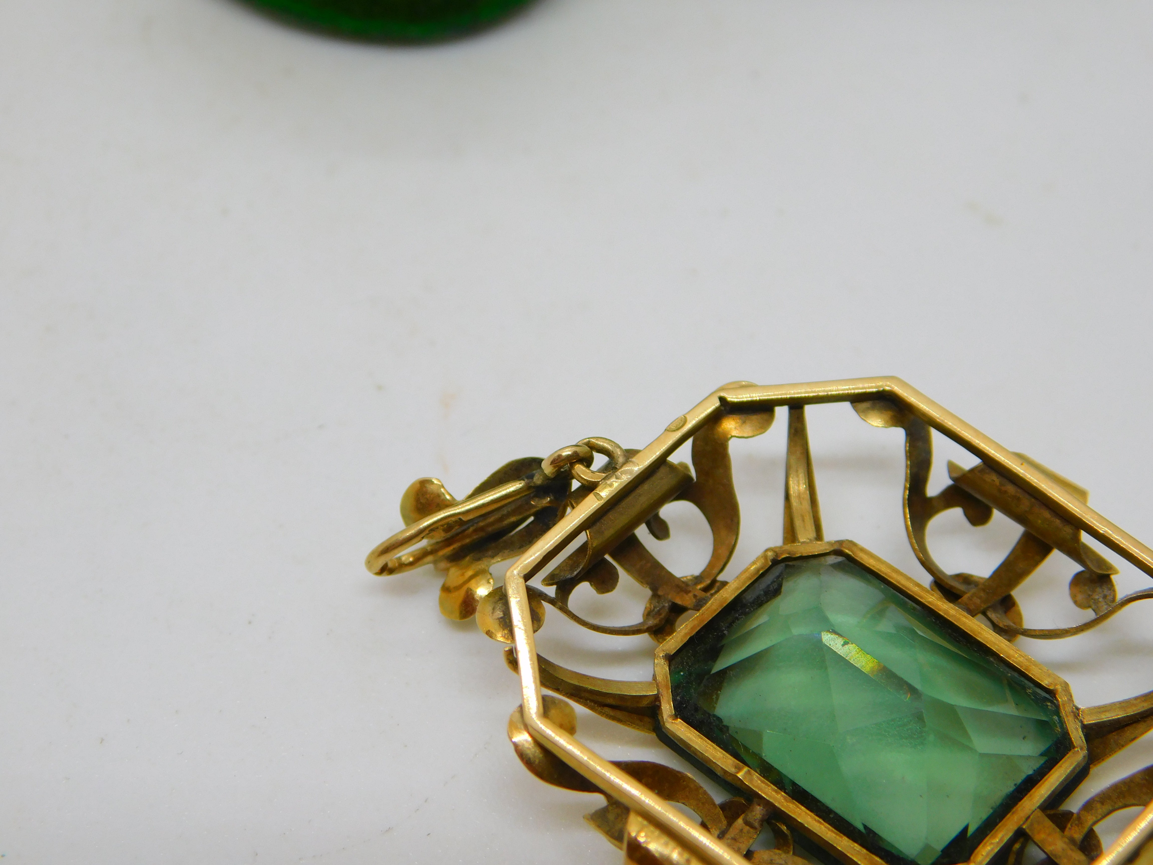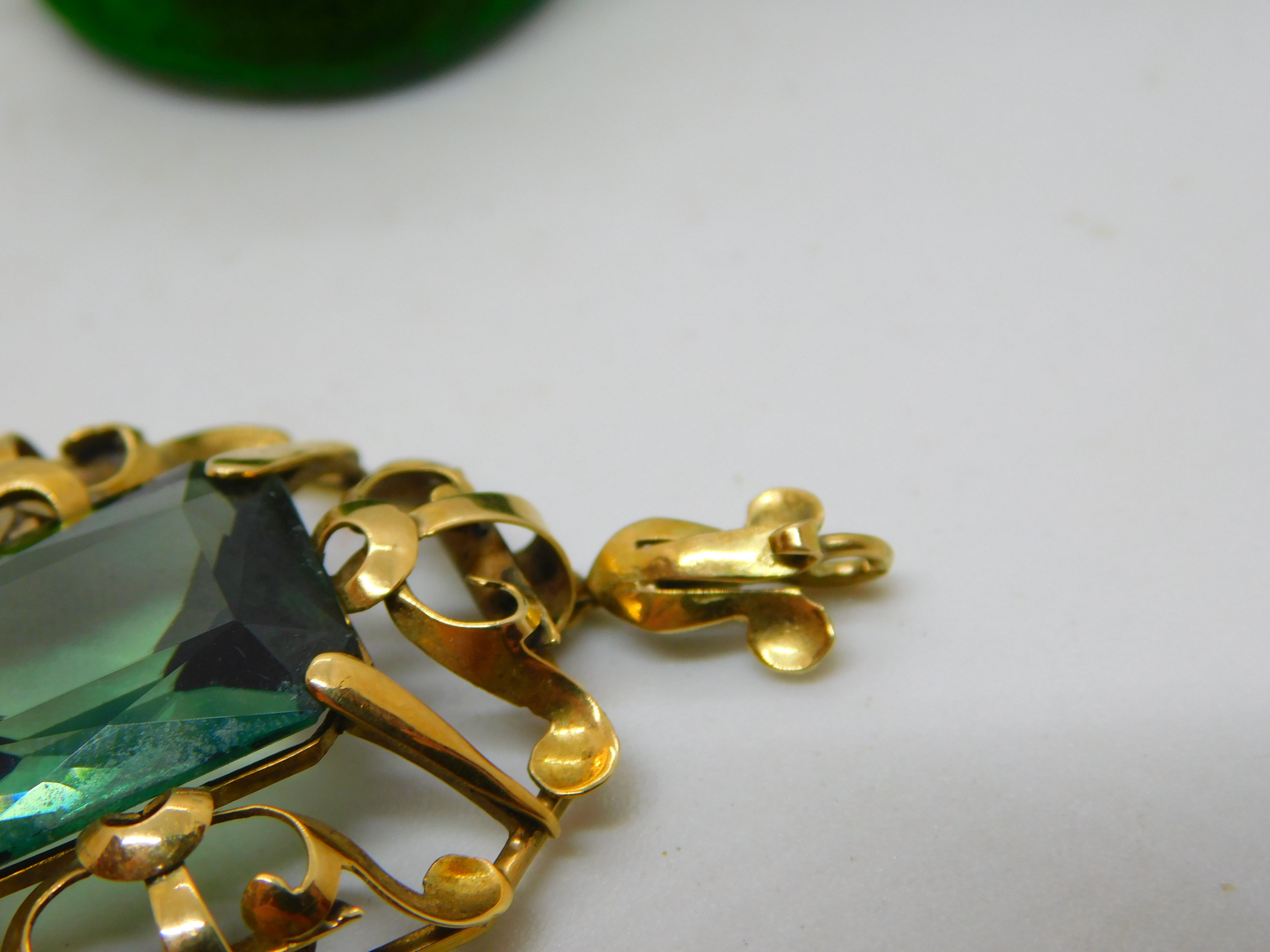14ct Yellow Gold Emerald Cut Green Paste Large Drop Pendant Antique c1920 Deco