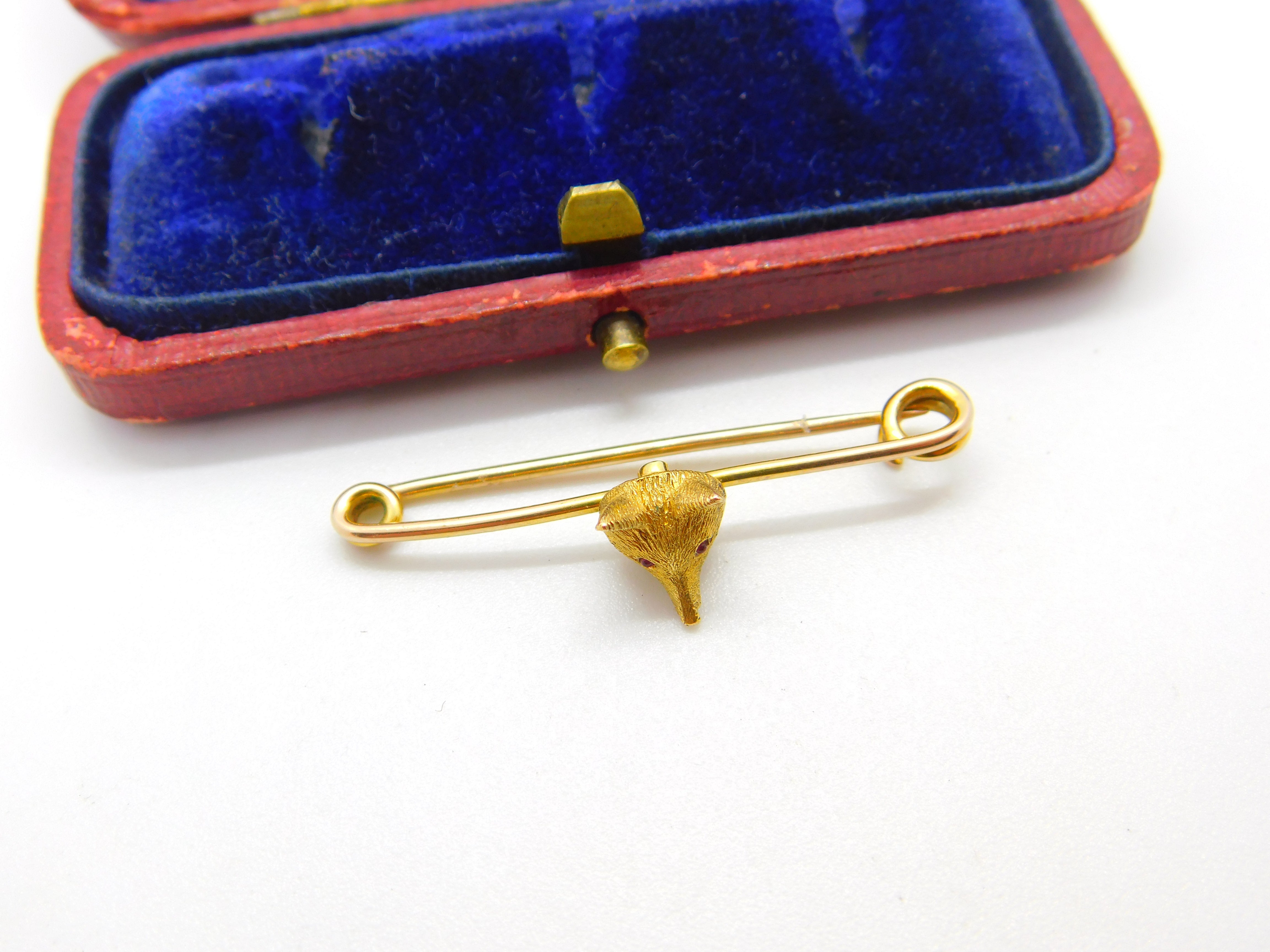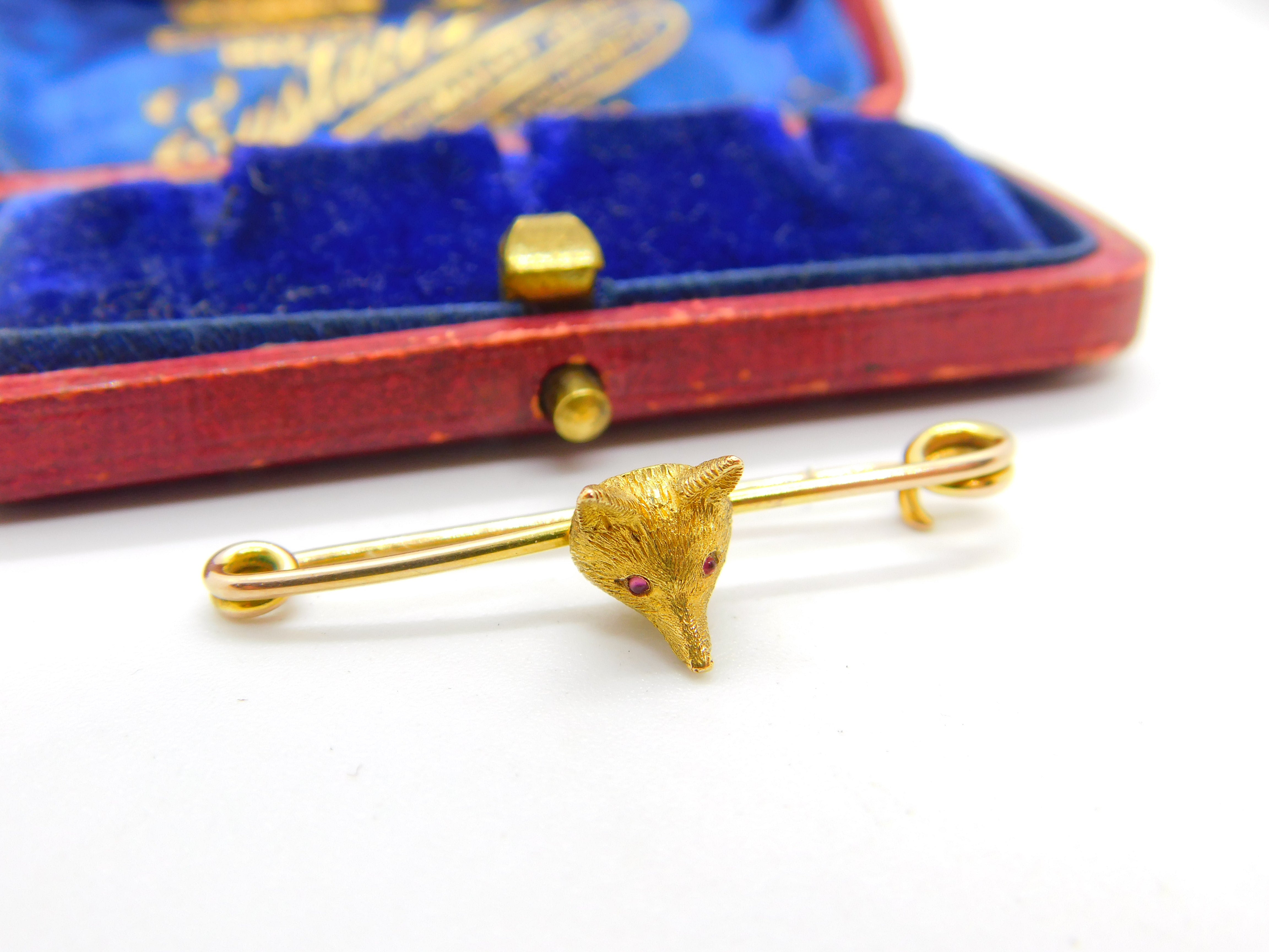 Details: A fantastic and wonderfully designed antique art deco 14ct yellow gold fox mask stock pin or bar brooch with lovely little ruby eyes to the fox c1930 - the gold has been XRF tested. This is a wonderful item that would make a perfect gift or addition to any collection. The BOX pictured is for PRESENTATION ONLY and is NOT included in the listings but used to frame the pictures unless specifically stated otherwise.