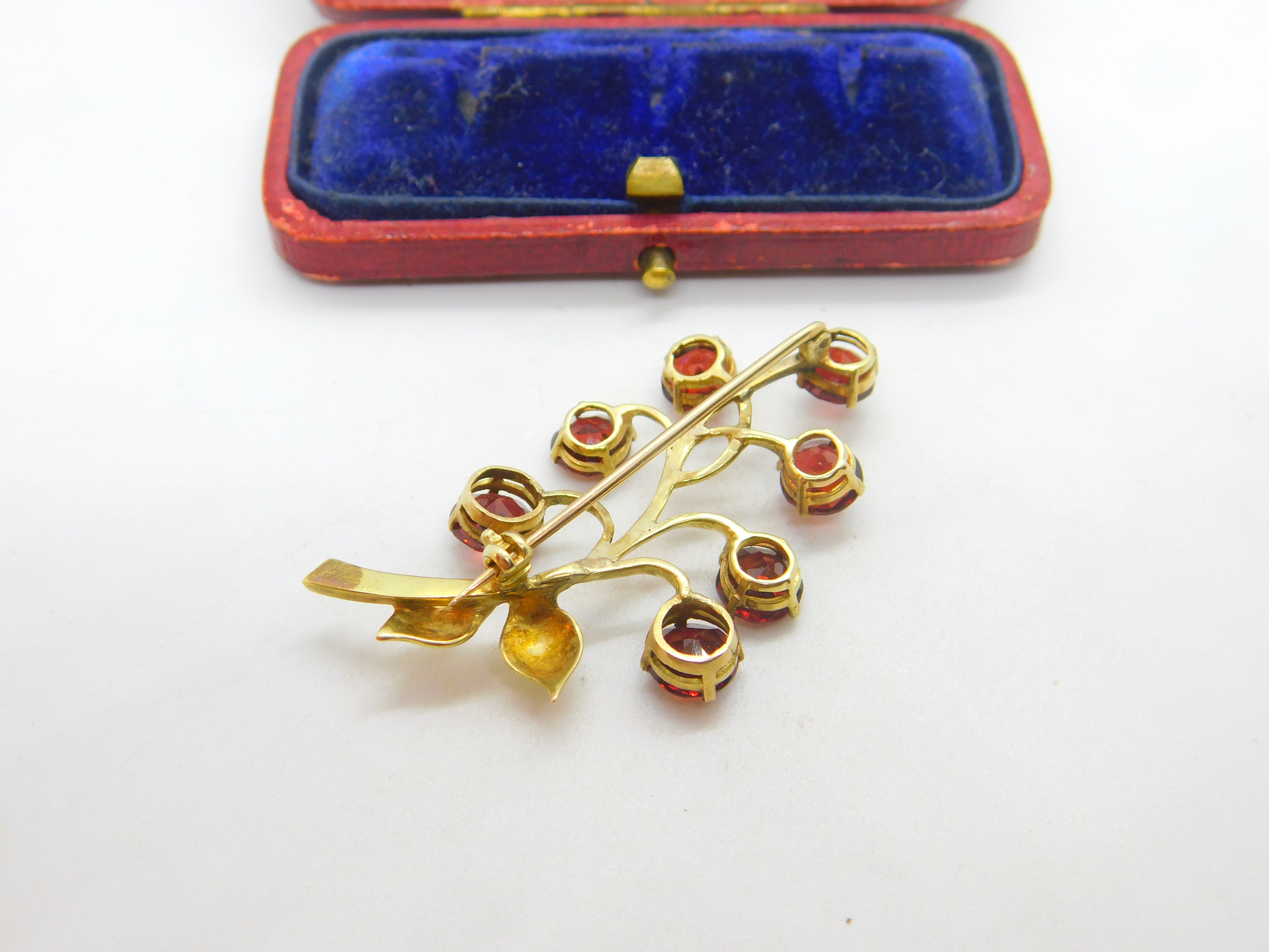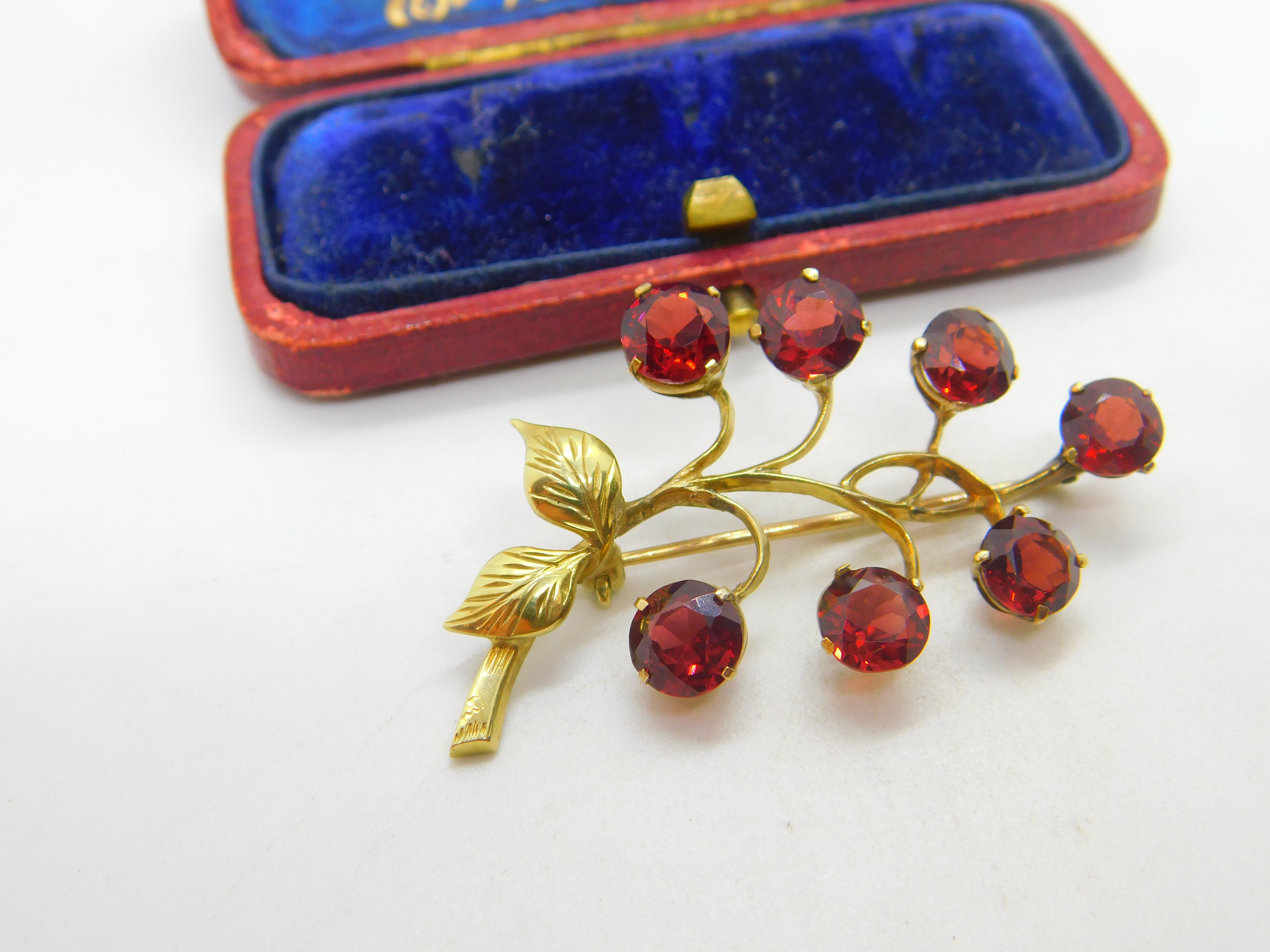14ct Yellow Gold & Garnet Set Floral Sprig Brooch Antique c1930 Art Deco