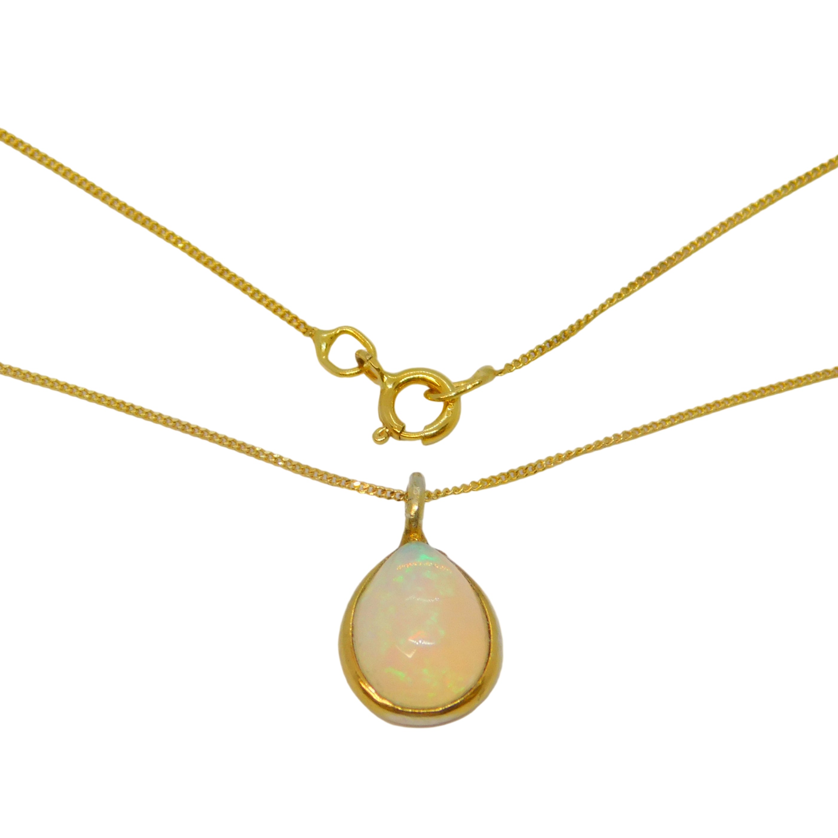 Details: A fantastic and wonderfully designed vintage gilt metal mounted pear cut white opal pendant set on a fine curb link 14ct yellow gold chain necklace hallmarked '585' to the bale c1970. This is a wonderful item that would make a perfect gift or addition to any collection.