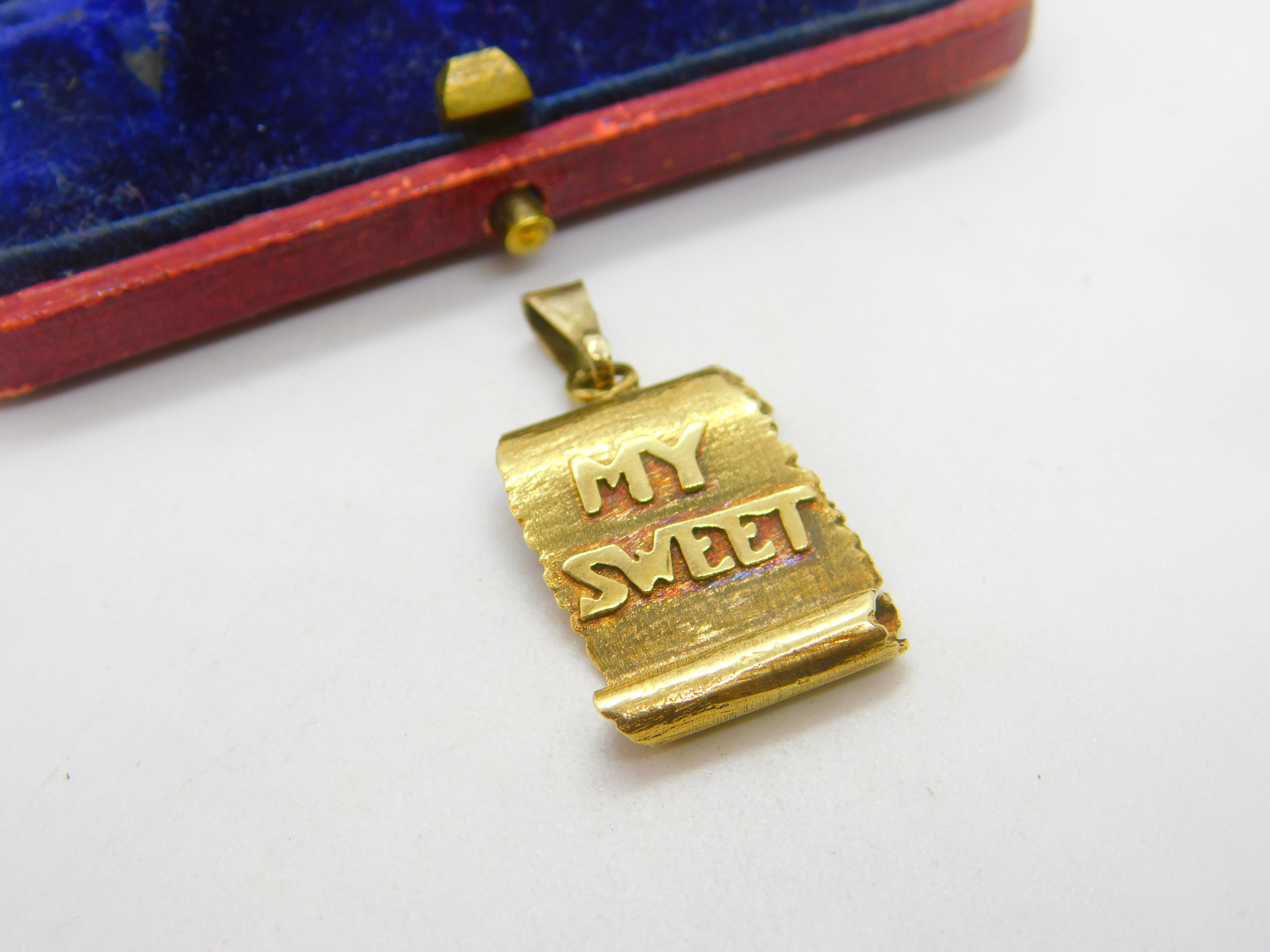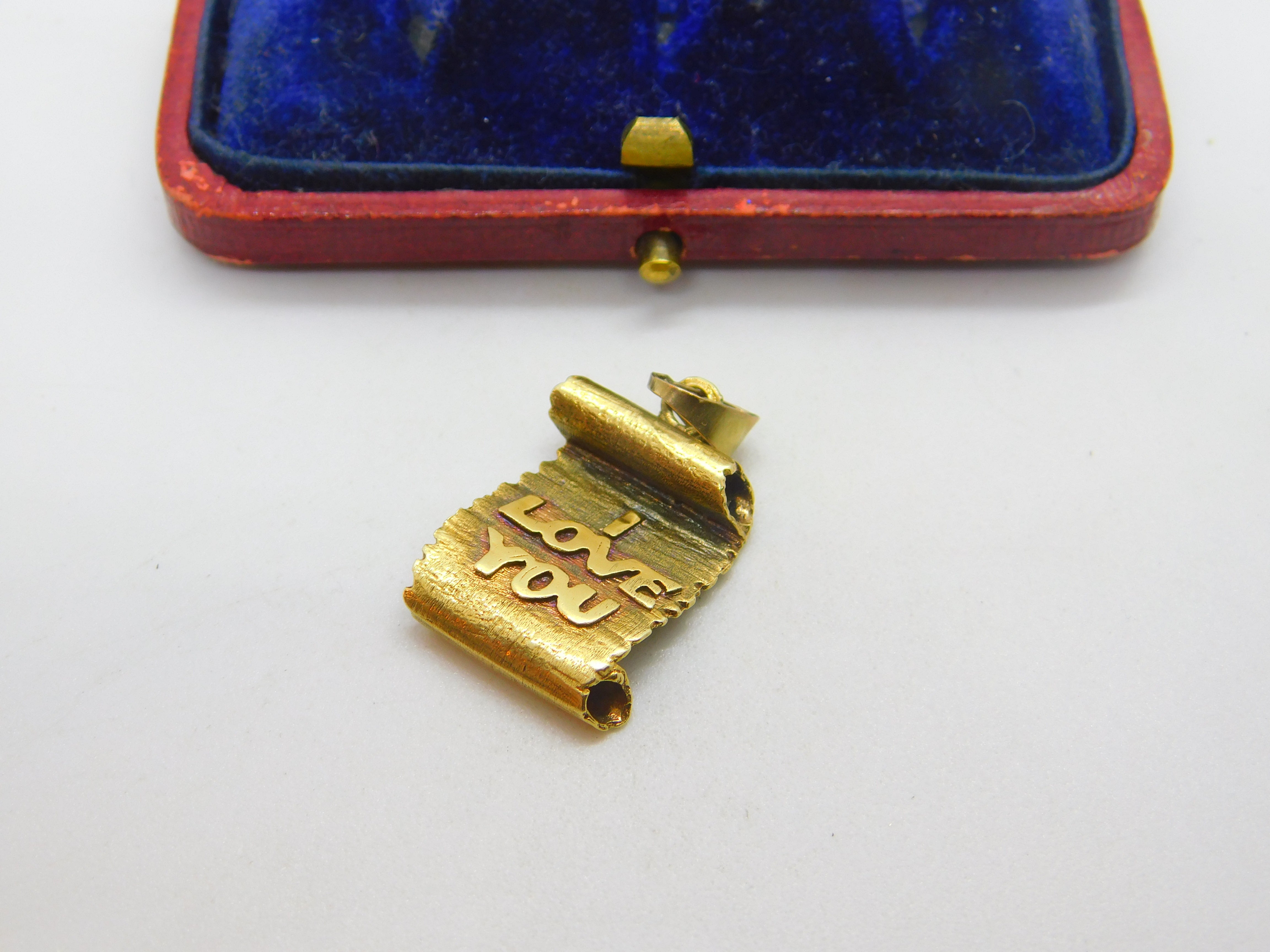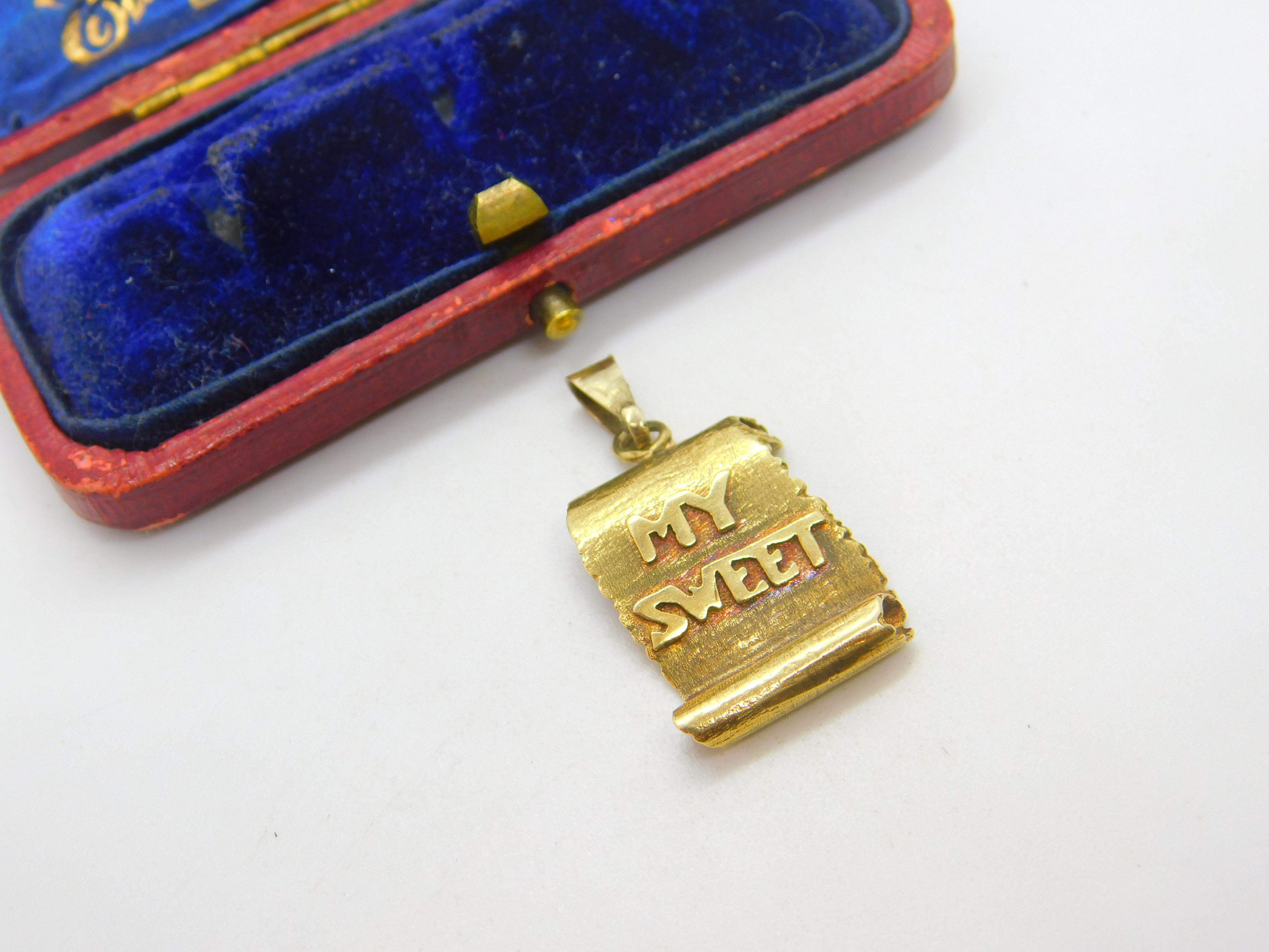 14ct Yellow Gold 'I Love You, My Sweet' Scroll Charm Pendant Vintage c1970