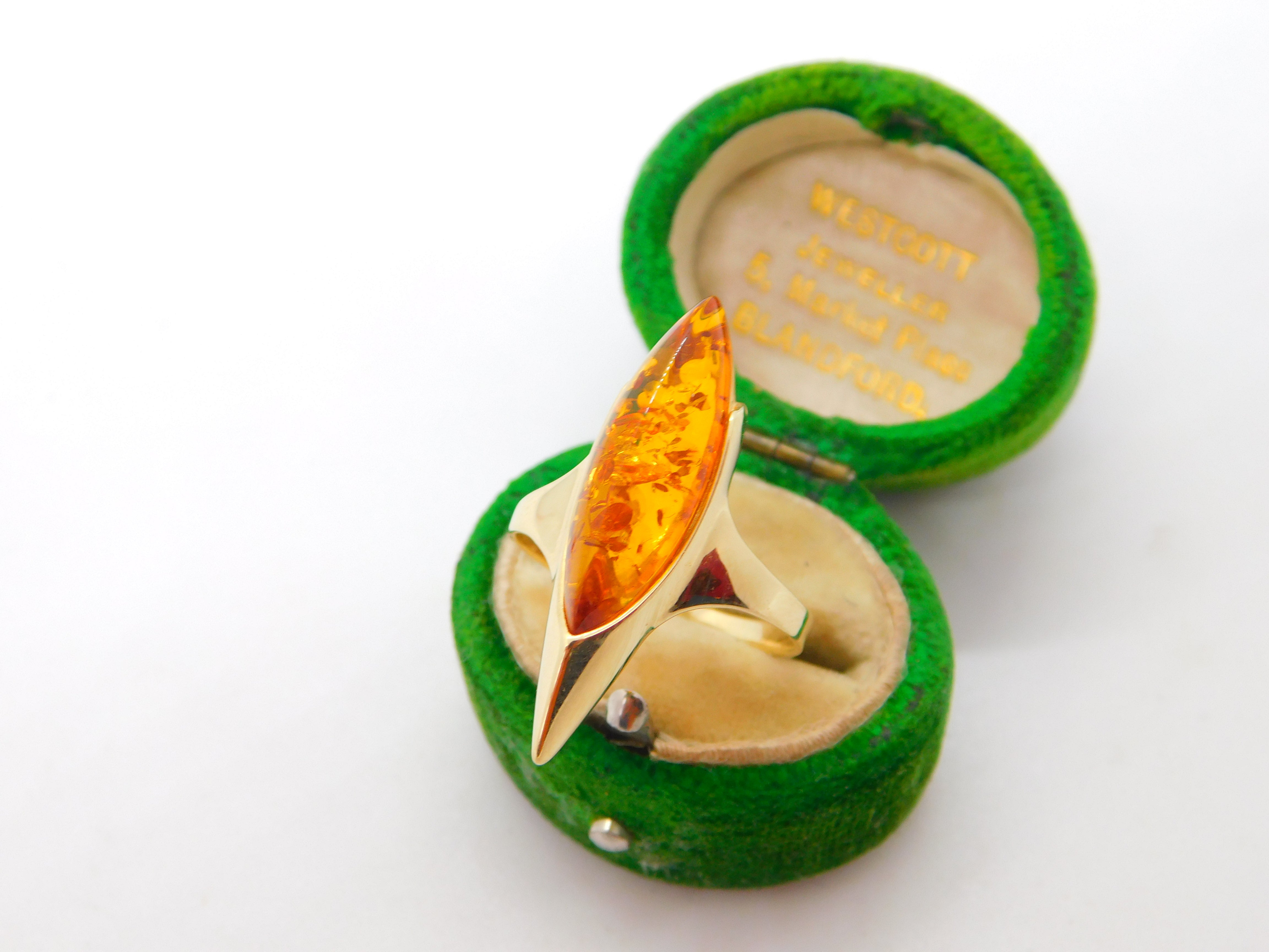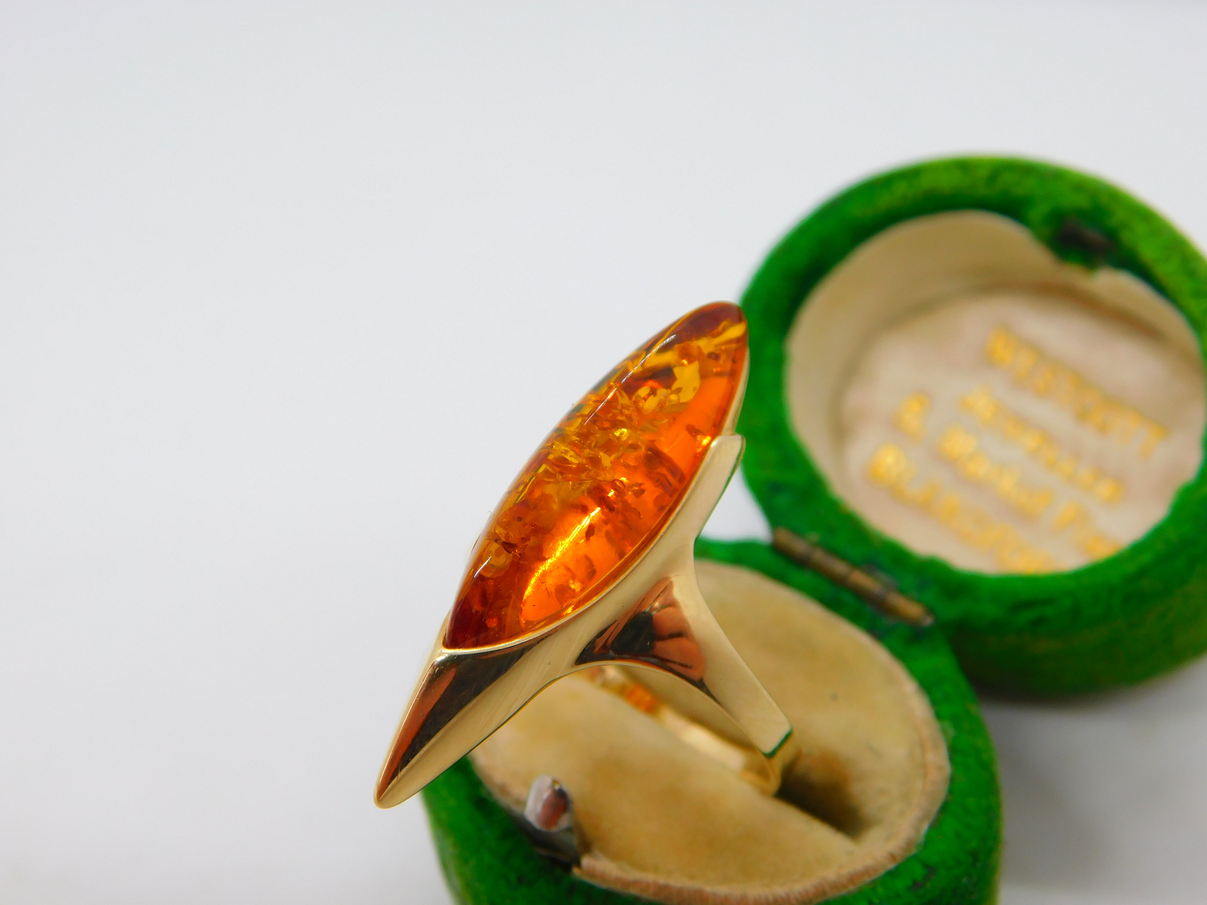 Details: A fantastic and wonderfully designed vintage 14ct yellow gold statement ring set with baltic amber hallmarked to the interior band c1990. This is a wonderful item that would make a perfect gift or addition to any collection. The BOX pictured is for PRESENTATION ONLY and is NOT included in the listings but used to frame the pictures unless specifically stated otherwise.