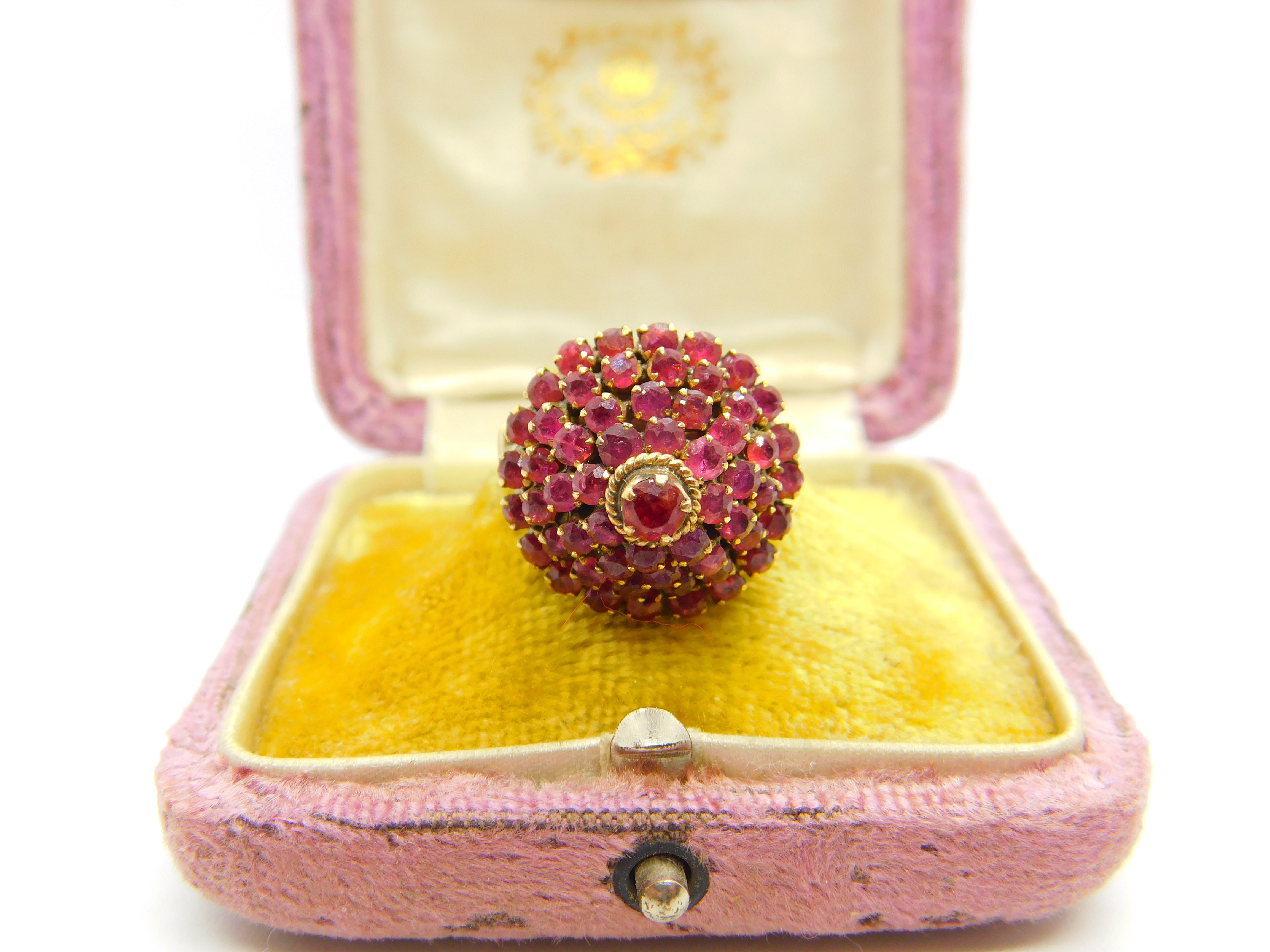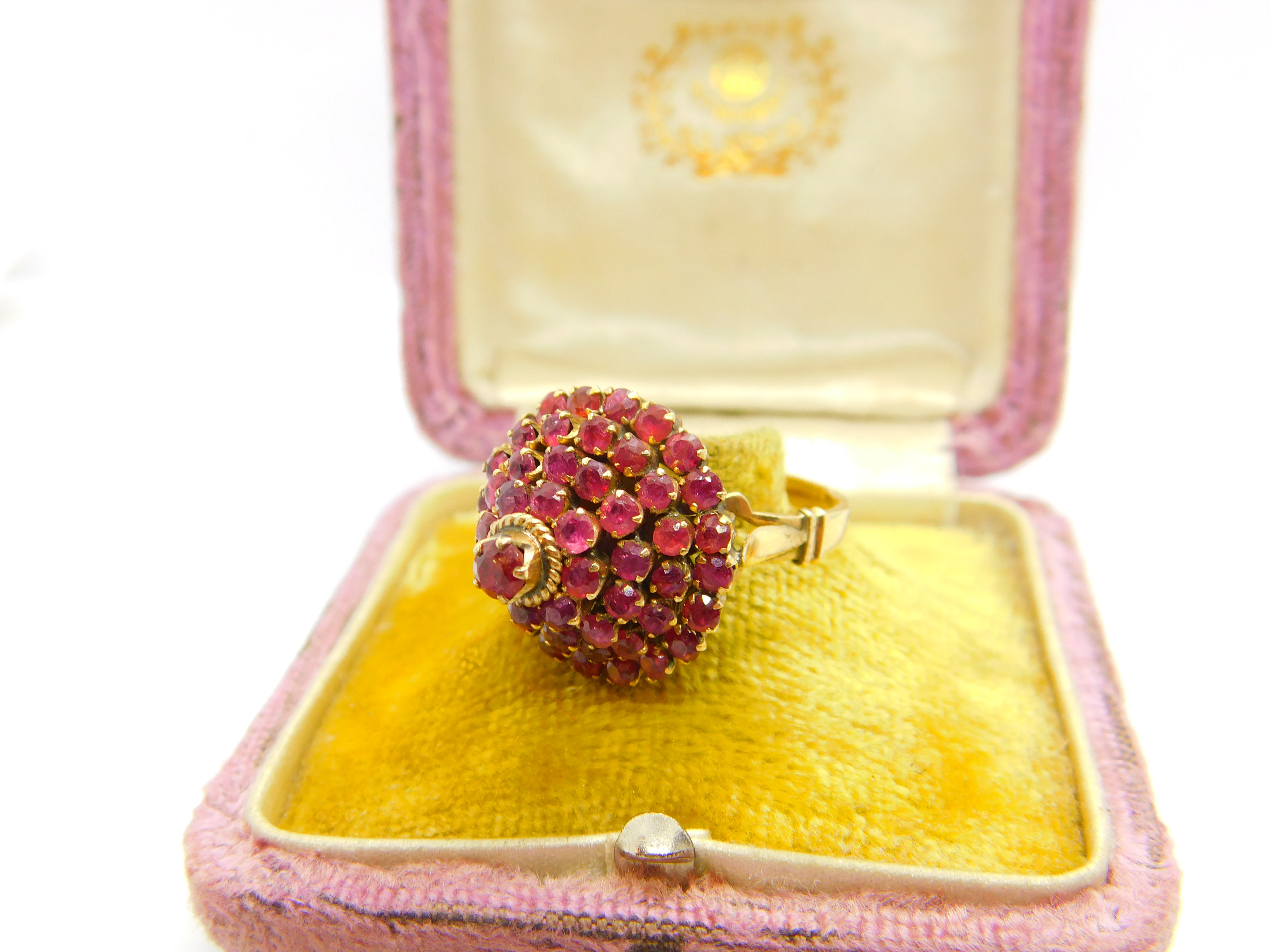 Details: A fantastic and wonderfully designed antique art deco 14ct yellow gold pagoda or floral cluster ring set with natural rubies throughout hallmarked 14K to the interior band c1930. The stones have been tested. This is a wonderful item that would make a perfect gift or addition to any collection. The BOX pictured is for PRESENTATION ONLY and is NOT included in the listings but used to frame the pictures unless specifically stated otherwise.