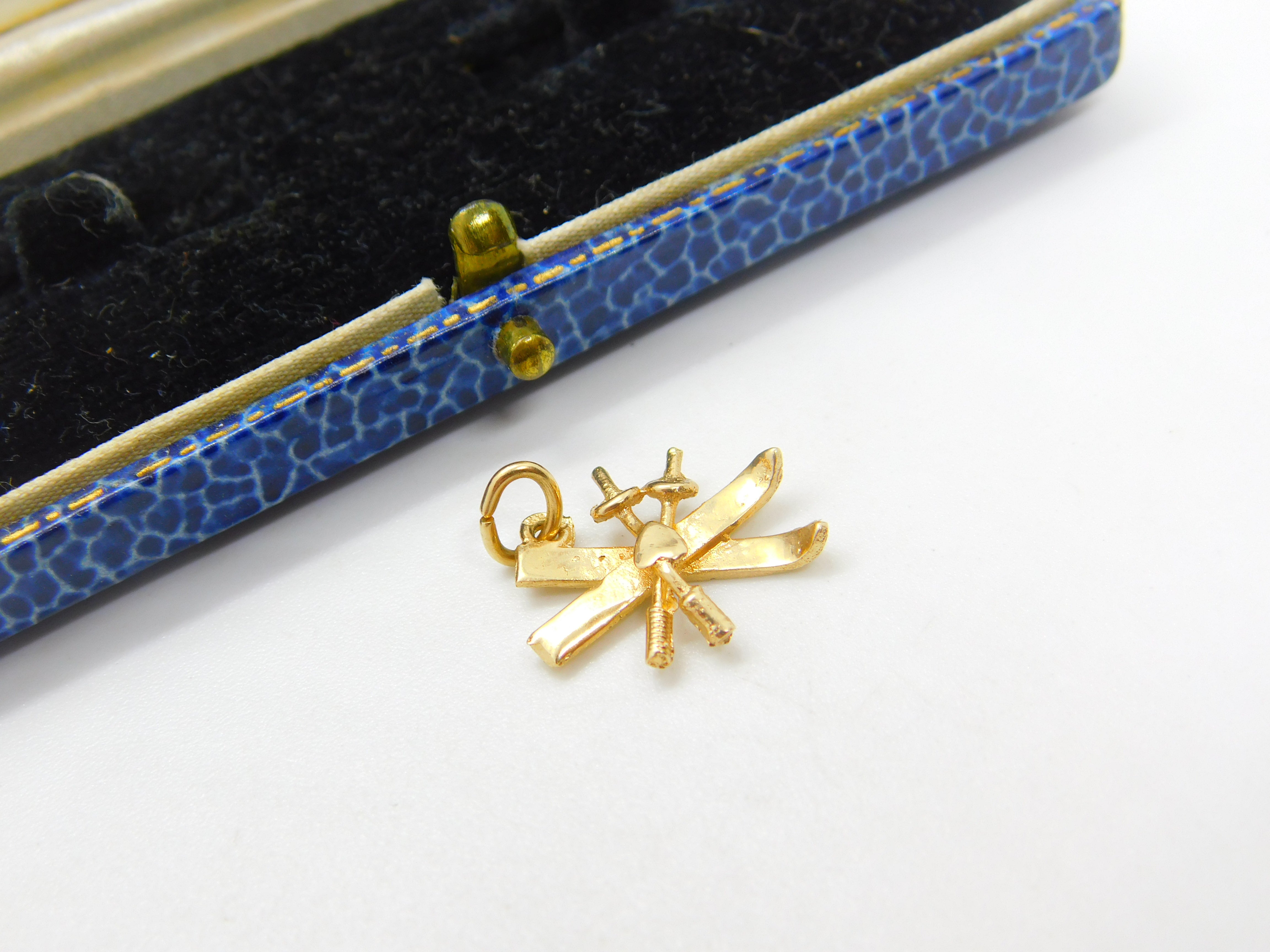 Details: A fantastic and wonderfully designed vintage 14ct yellow gold skiing interest skis and poles charm pendant hallmarked to the bale 585 c1970. This is a wonderful item that would make a perfect gift or addition to any collection. The BOX pictured is for PRESENTATION ONLY and is NOT included in the listings but used to frame the pictures unless specifically stated otherwise.