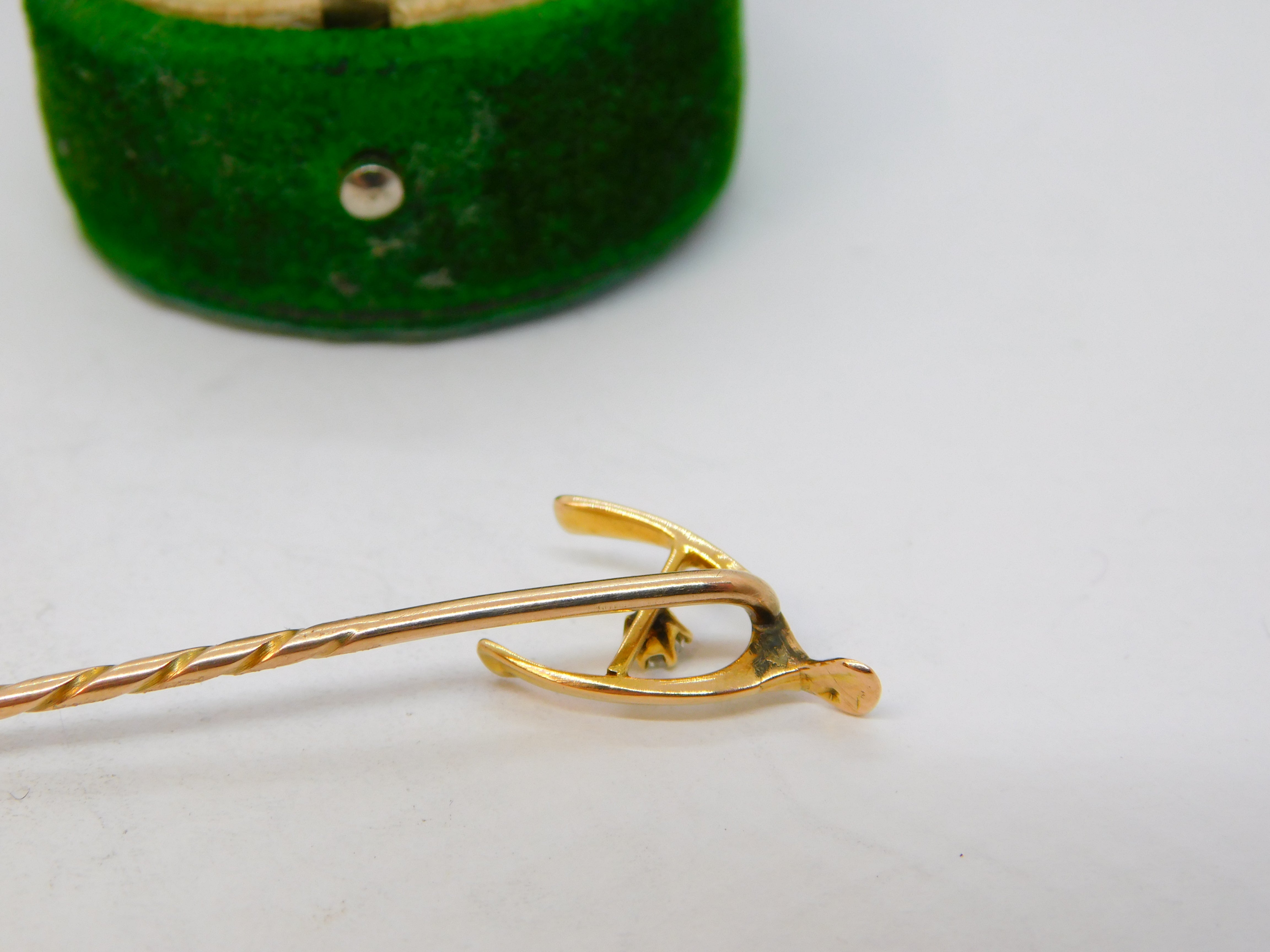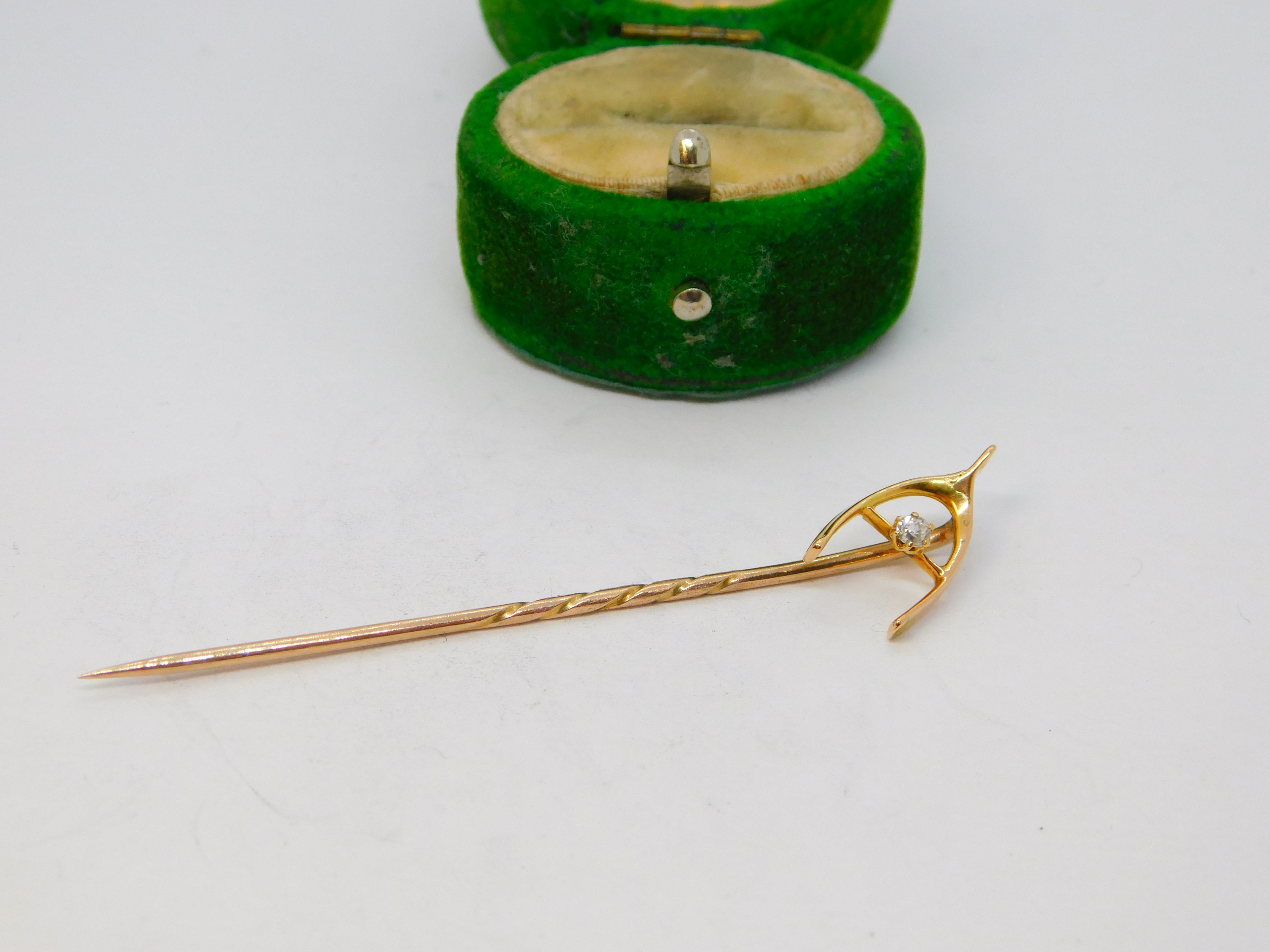 15ct Yellow Gold & Diamond Set Lucky Wishbone Stick Pin Antique c1890