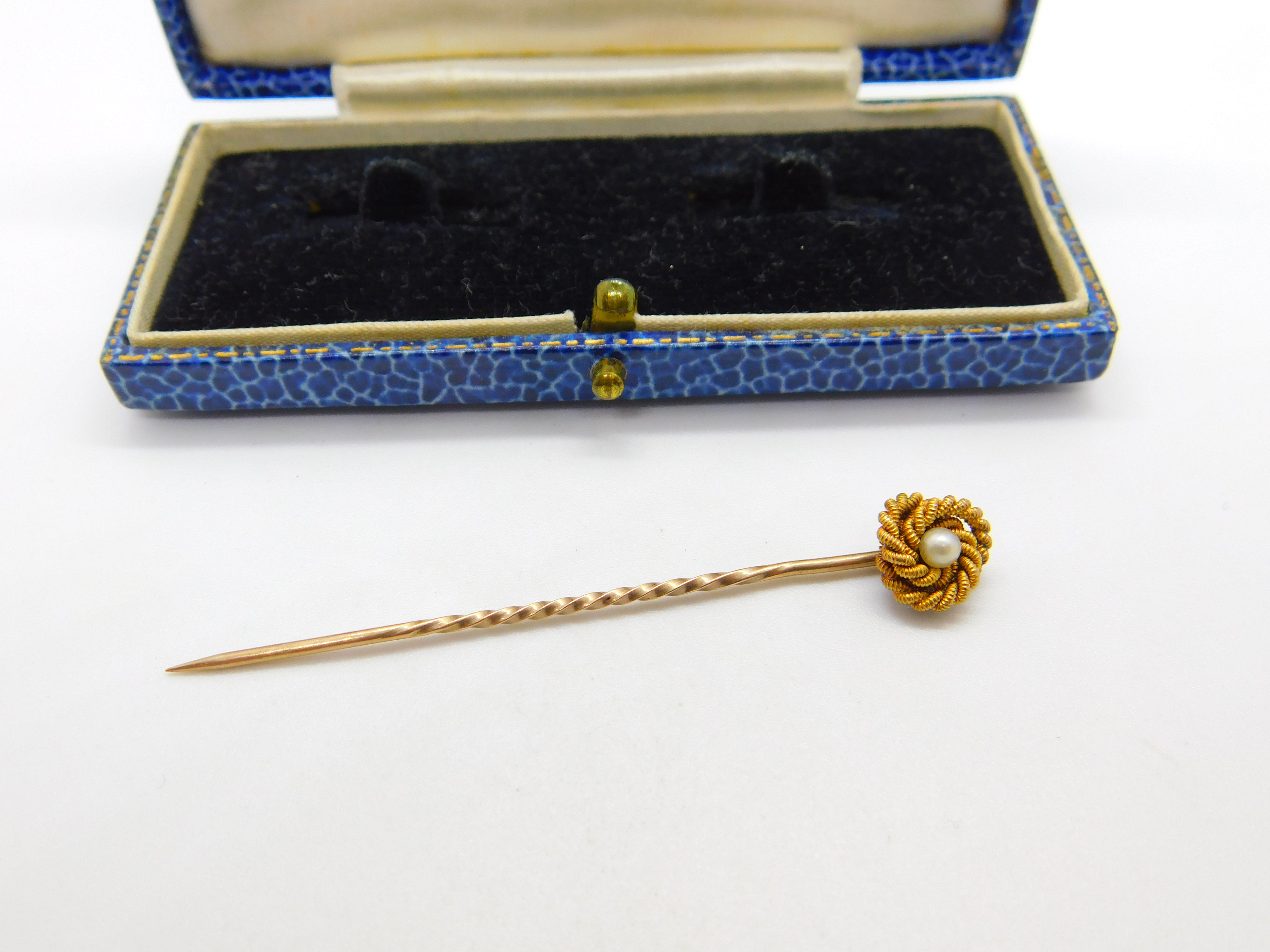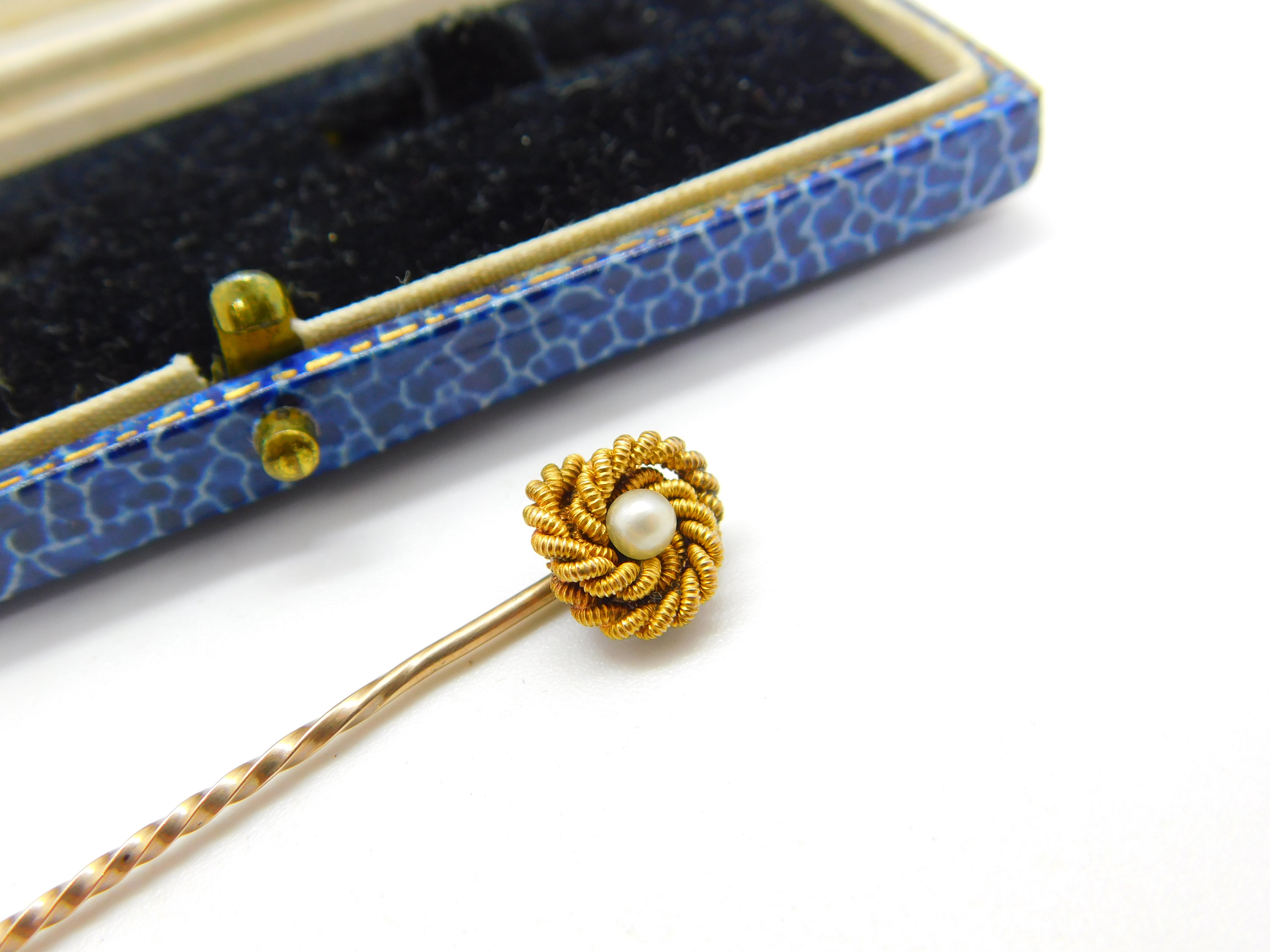 15ct Yellow Gold & Pearl Set Lovers Knot Stick Pin Antique c1910 Edwardian