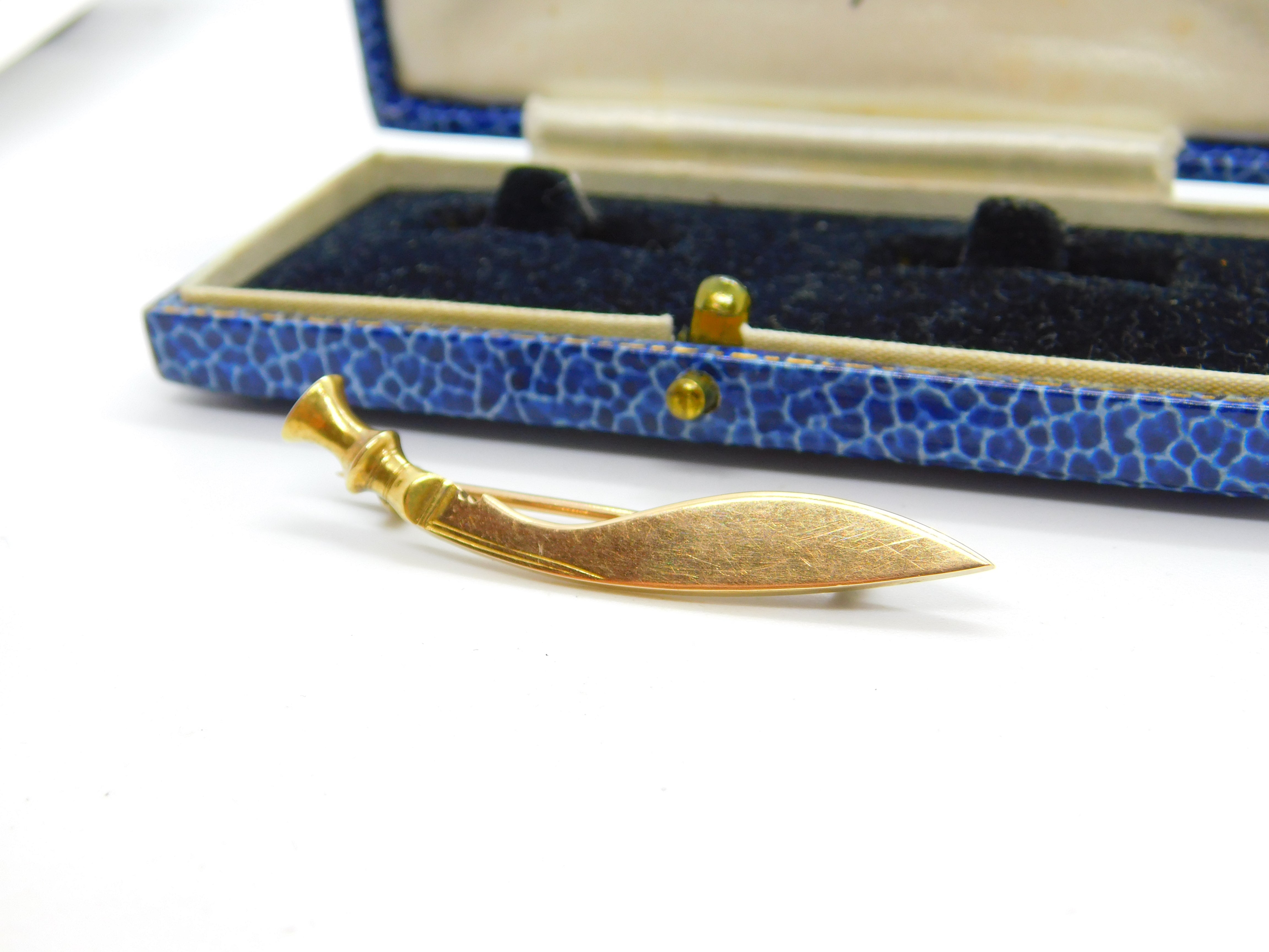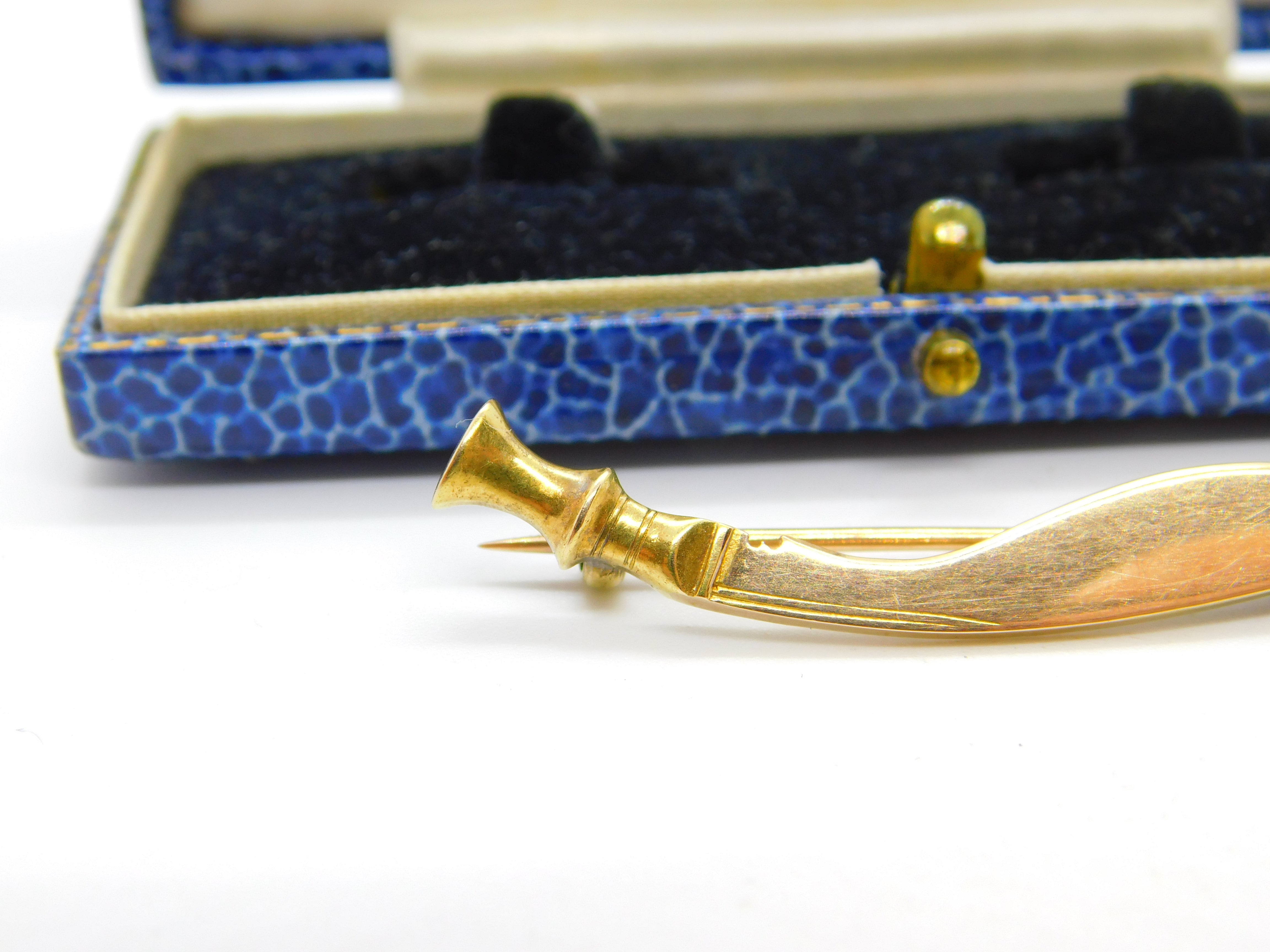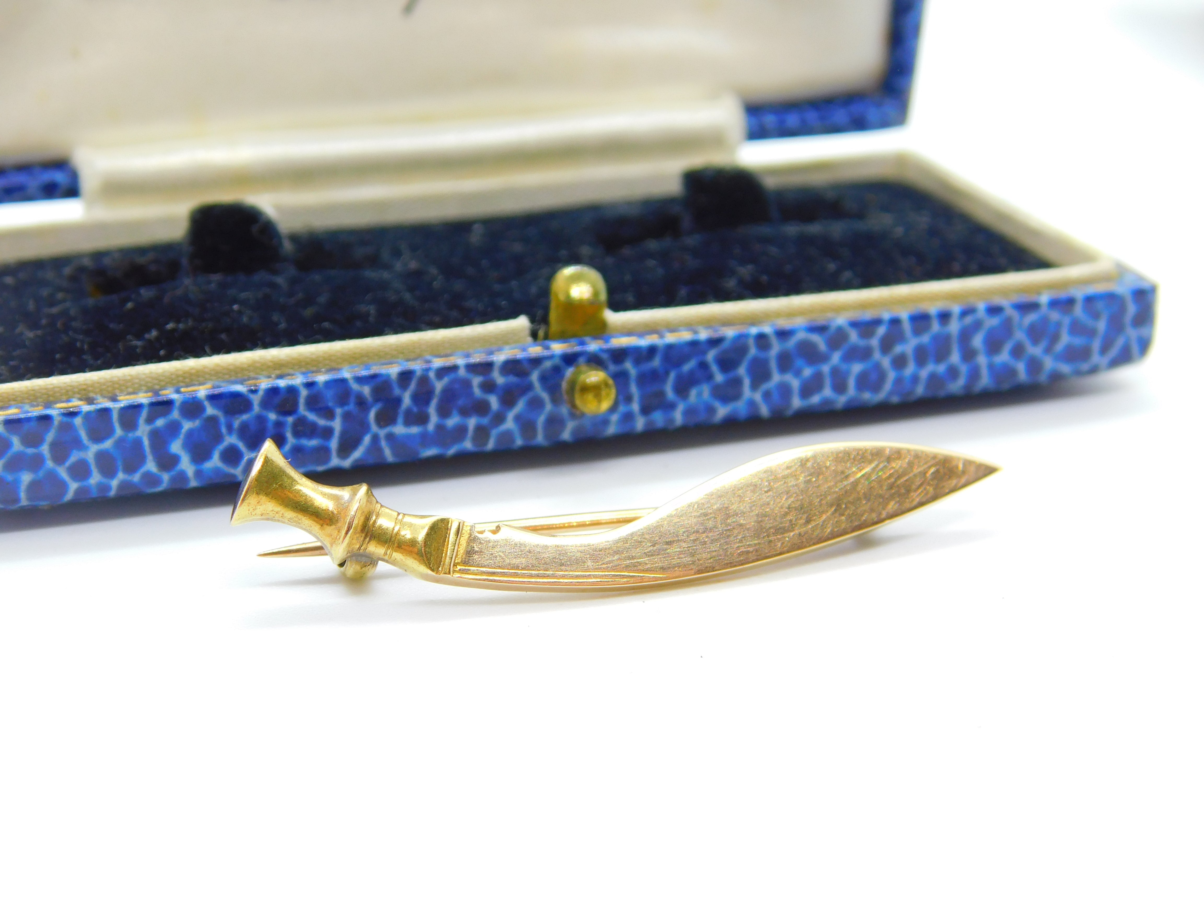 Details: A fantastic and wonderfully designed antique art deco 15ct yellow gold Royal Gurkha Rifles kukri form brooch with lovely detailing hallmarked London 1927 by Goldsmiths & Silversmiths Co. Ltd. This is a wonderful item that would make a perfect gift or addition to any collection. The BOX pictured is for PRESENTATION ONLY and is NOT included in the listings but used to frame the pictures unless specifically stated otherwise.