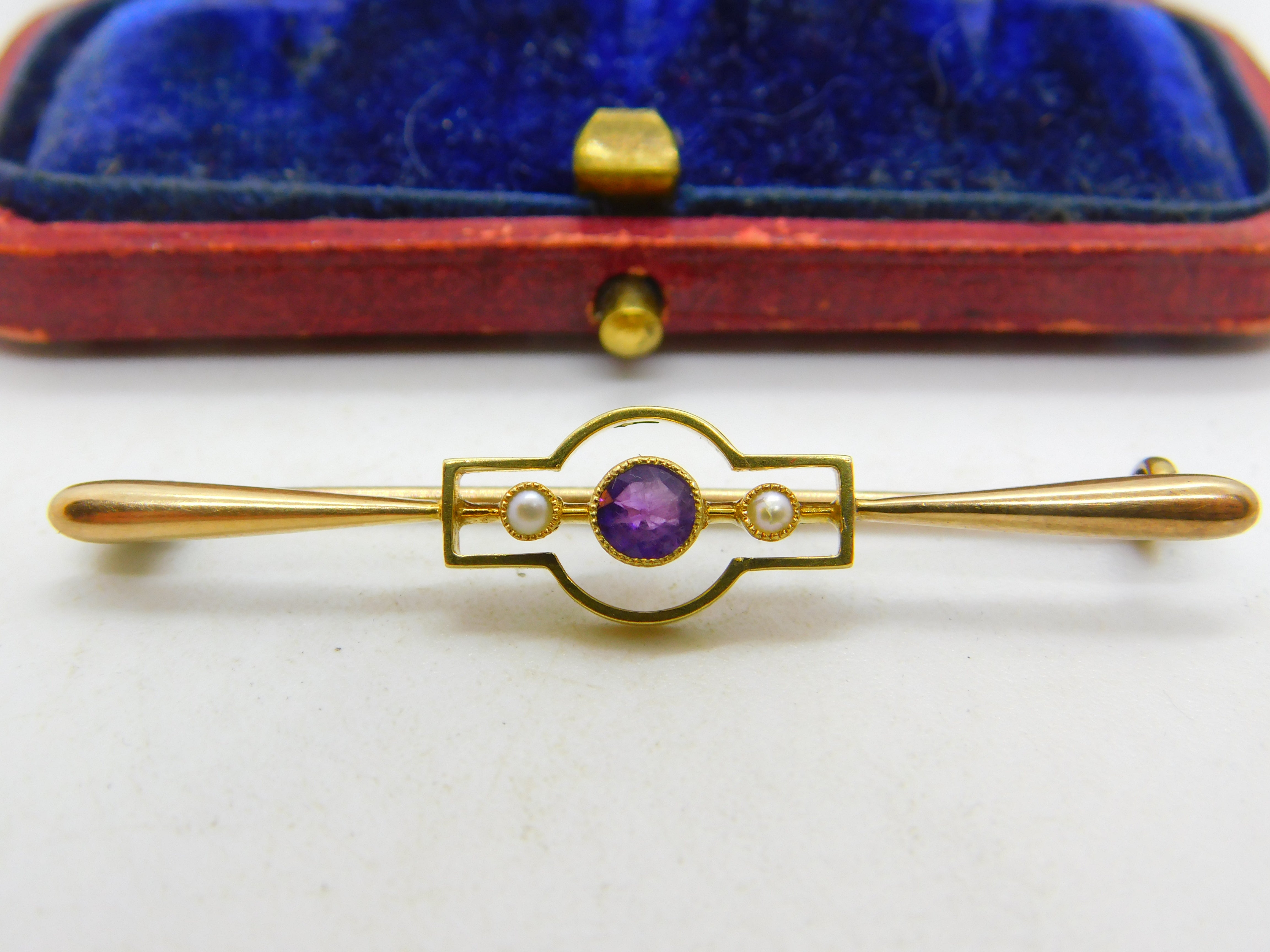 Details: A fantastic and wonderfully designed antique Edwardian 15ct yellow gold sweetheart bar brooch set with amethyst & seed pearls hallmarked to the reverse c1910. This is a wonderful item that would make a perfect gift or addition to any collection. The BOX pictured is for PRESENTATION ONLY and is NOT included in the listings but used to frame the pictures unless specifically stated otherwise.