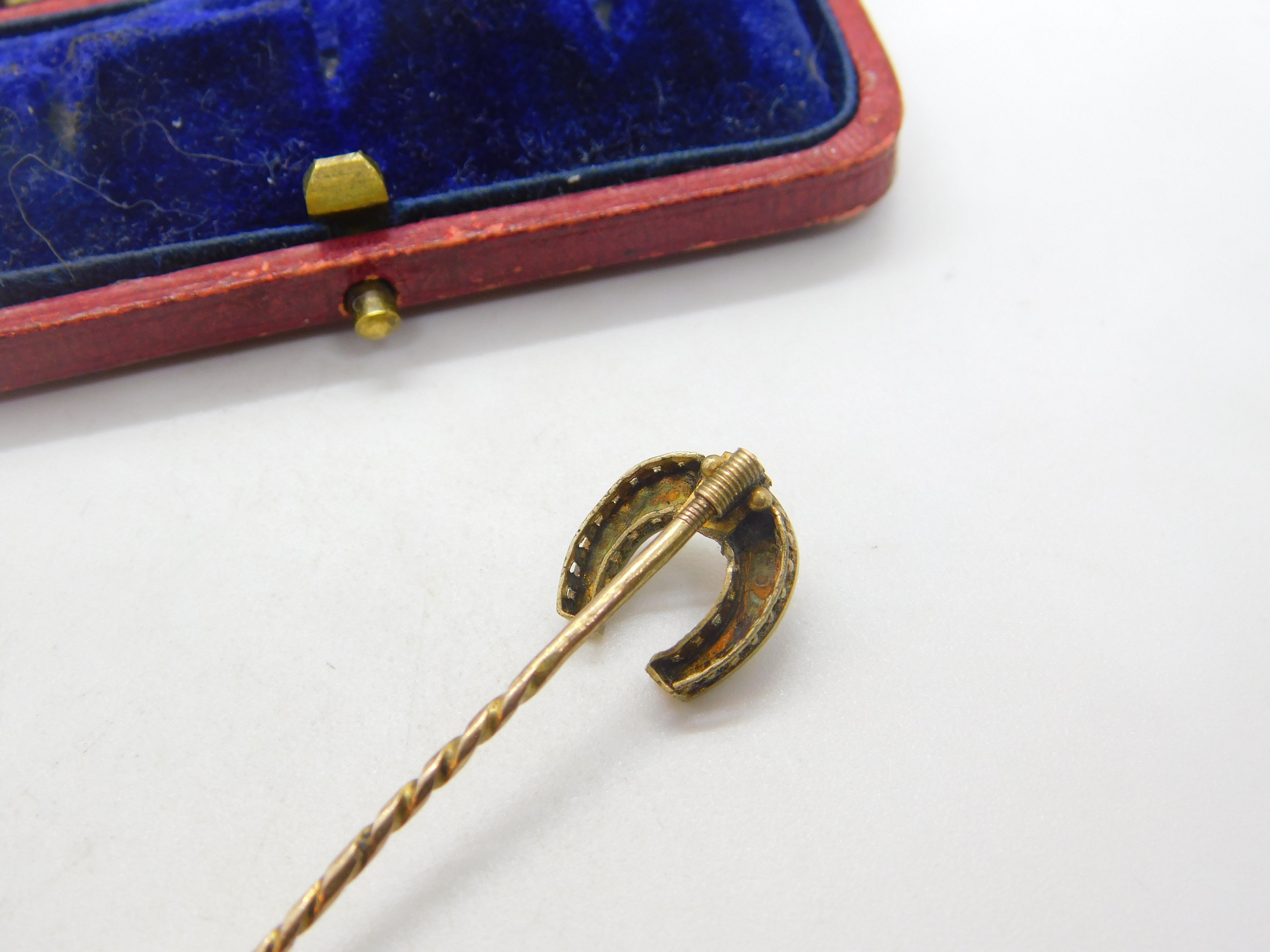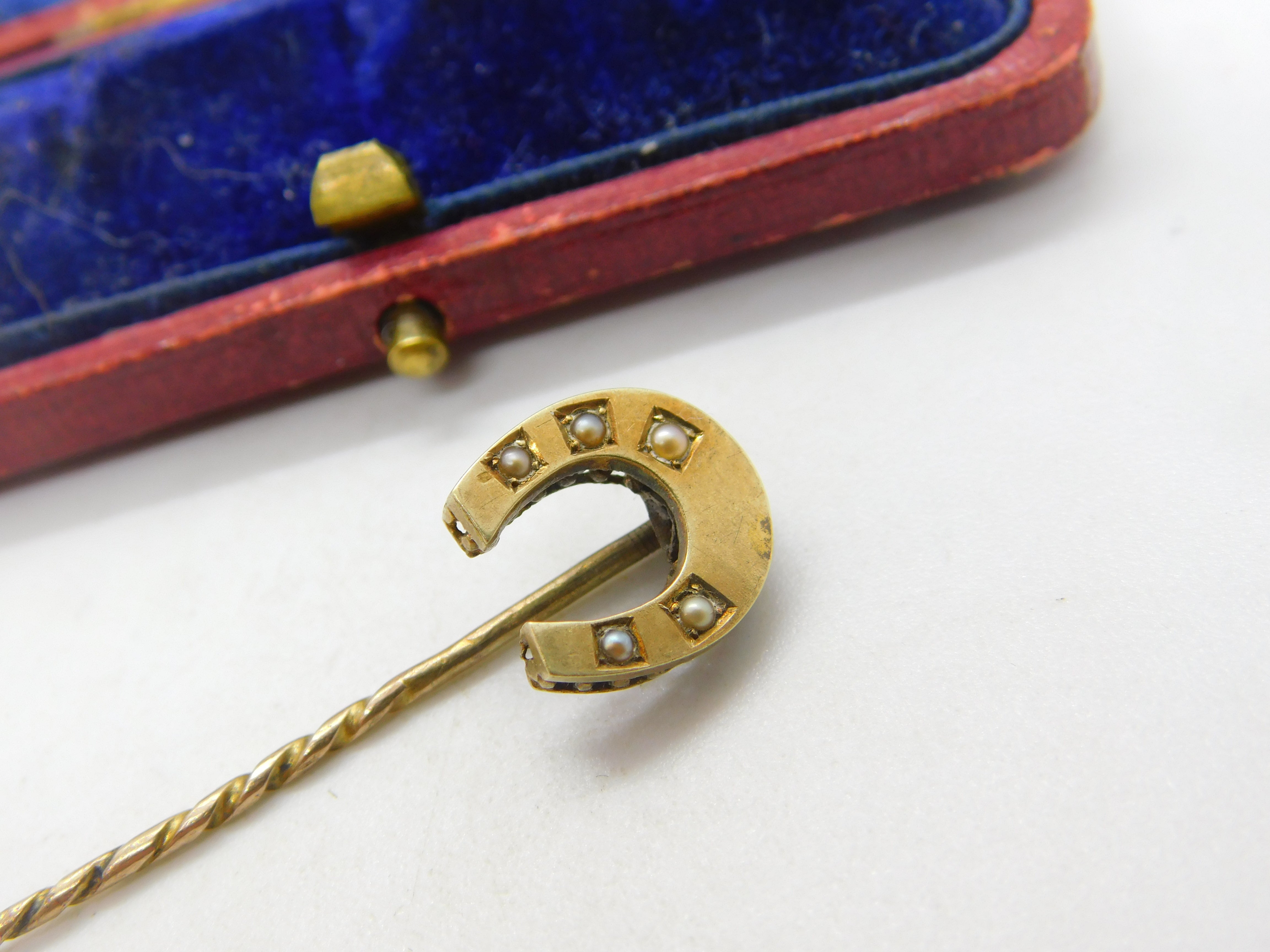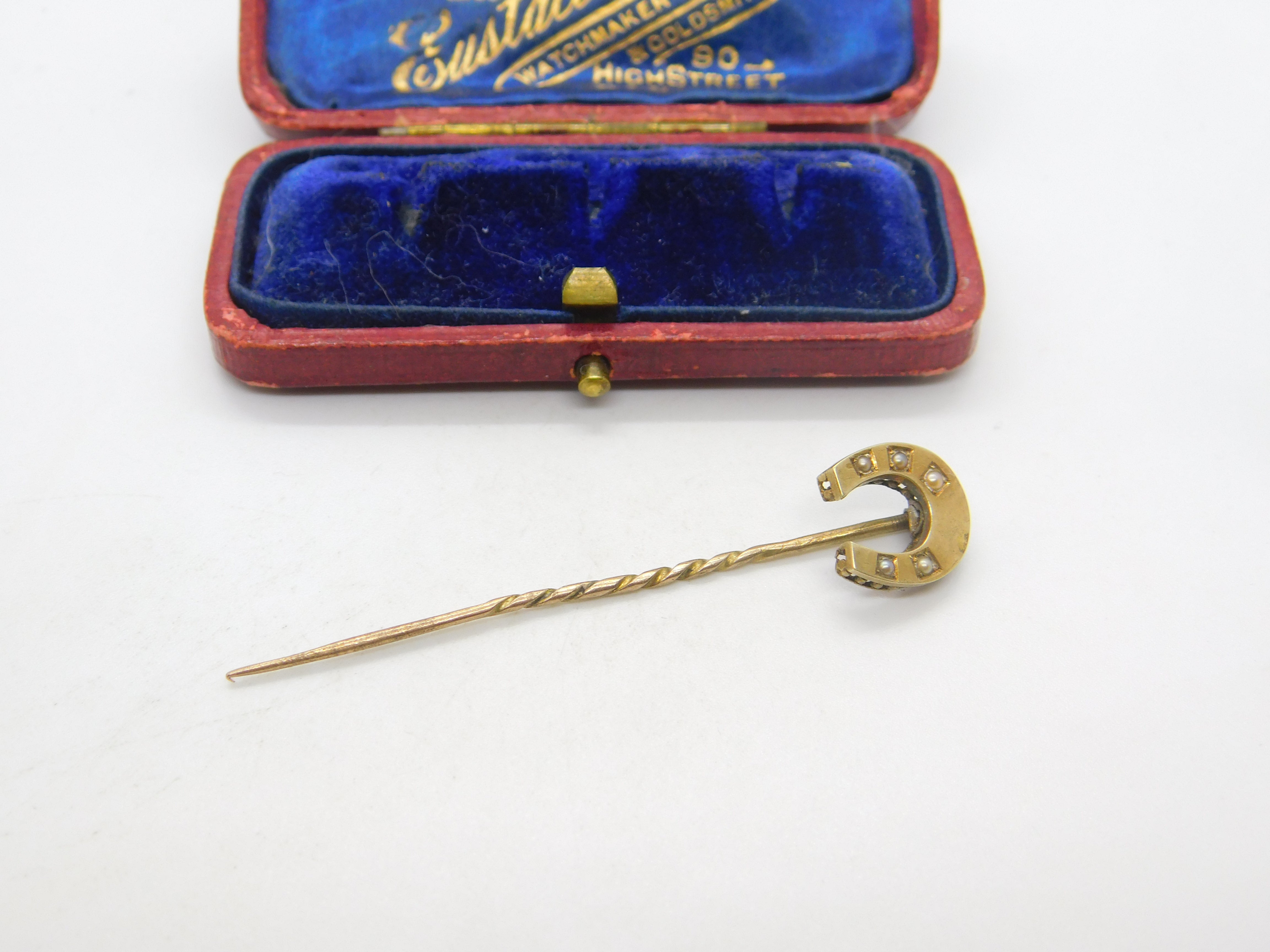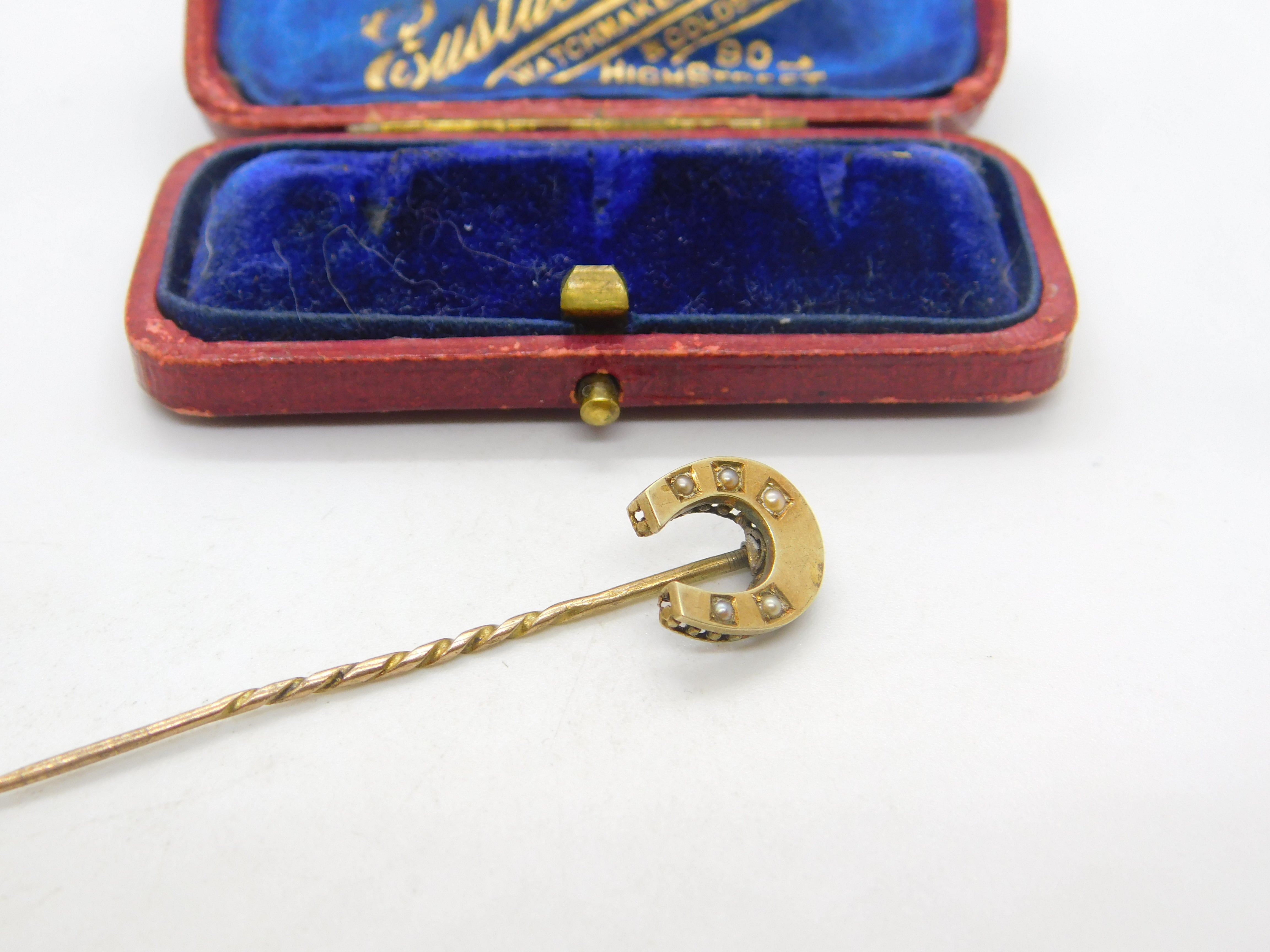 15ct Yellow Gold & Seed Pearl Set Horseshoe Good Luck Stick Pin c1890 Victorian