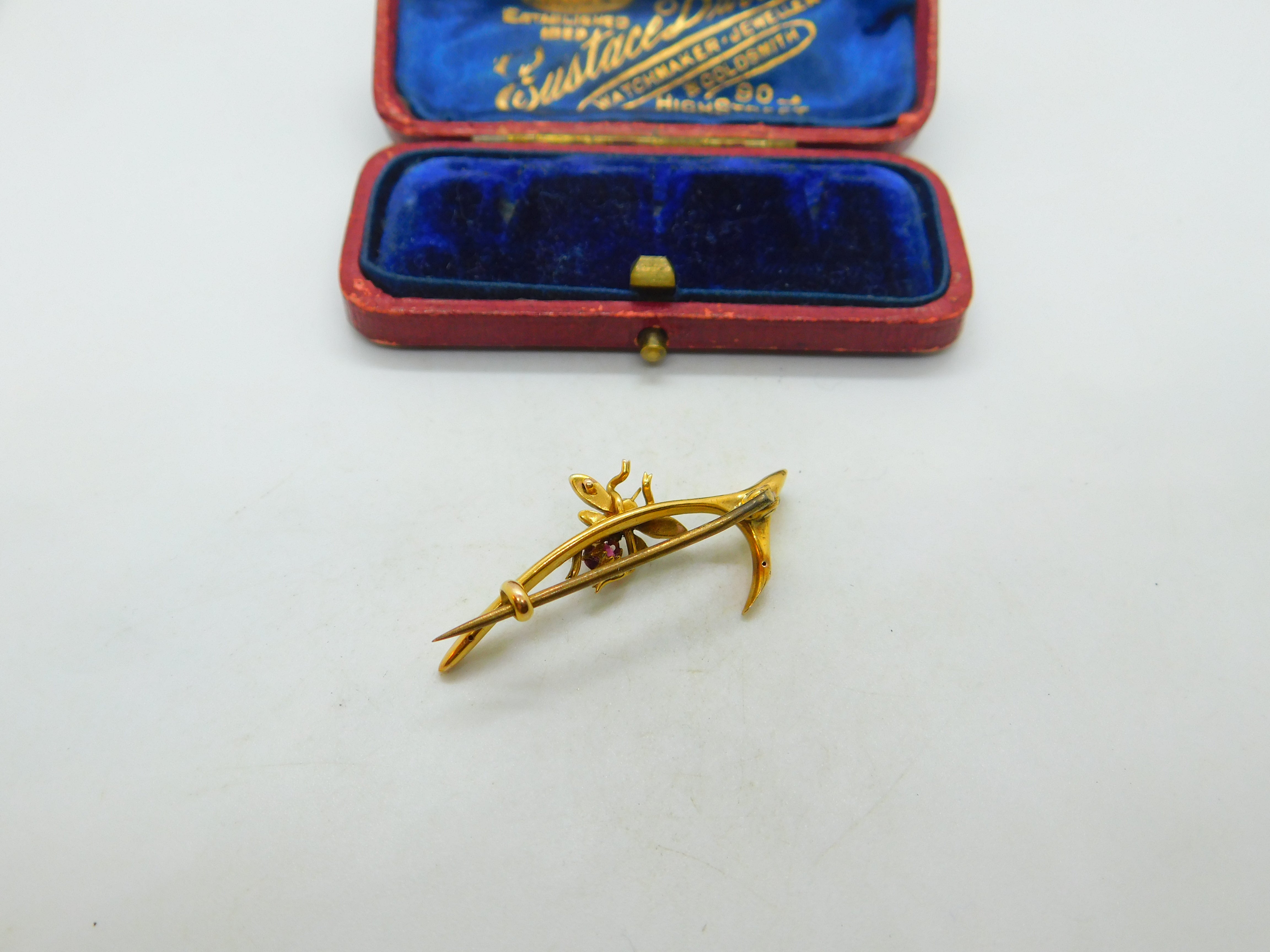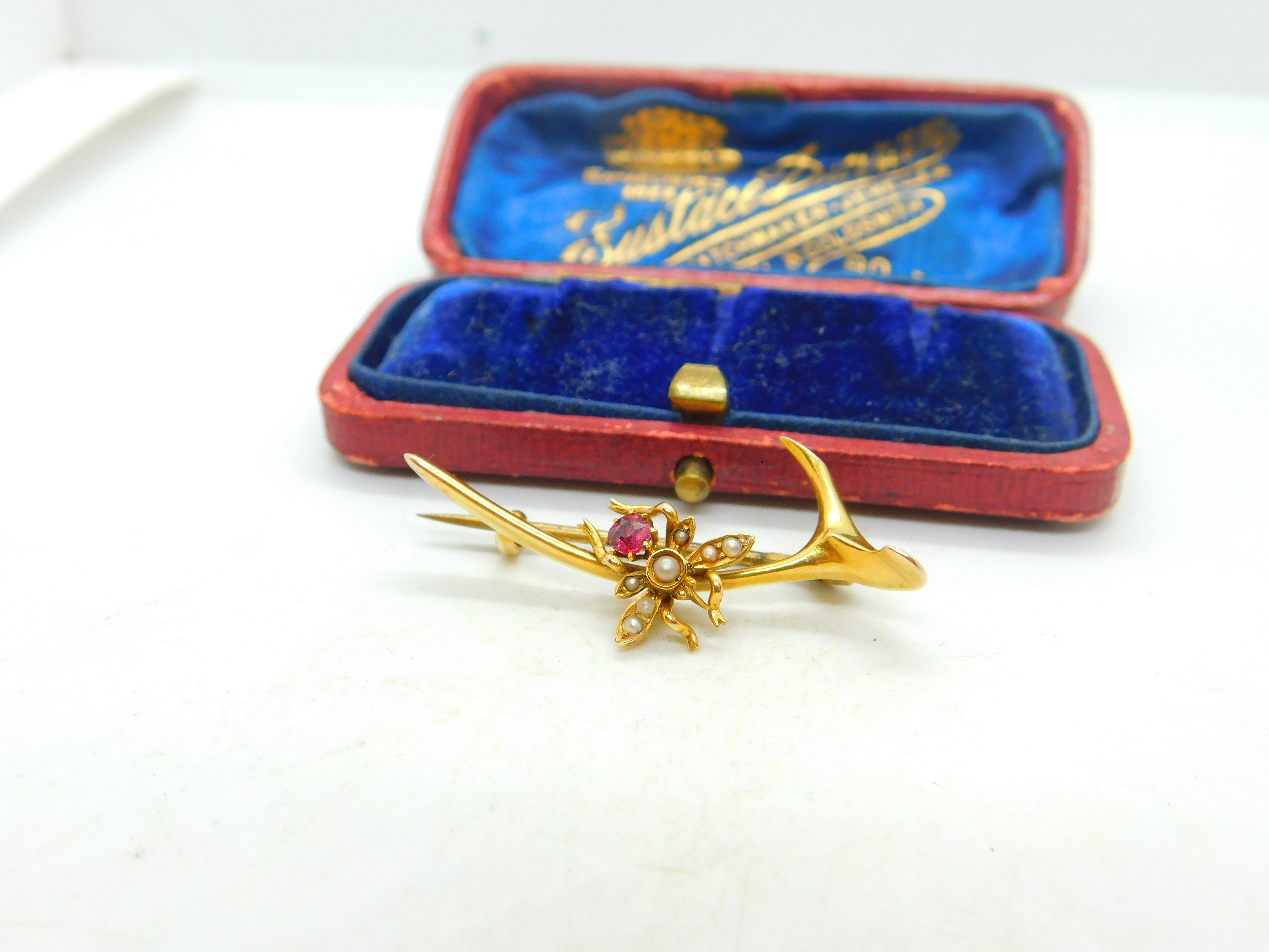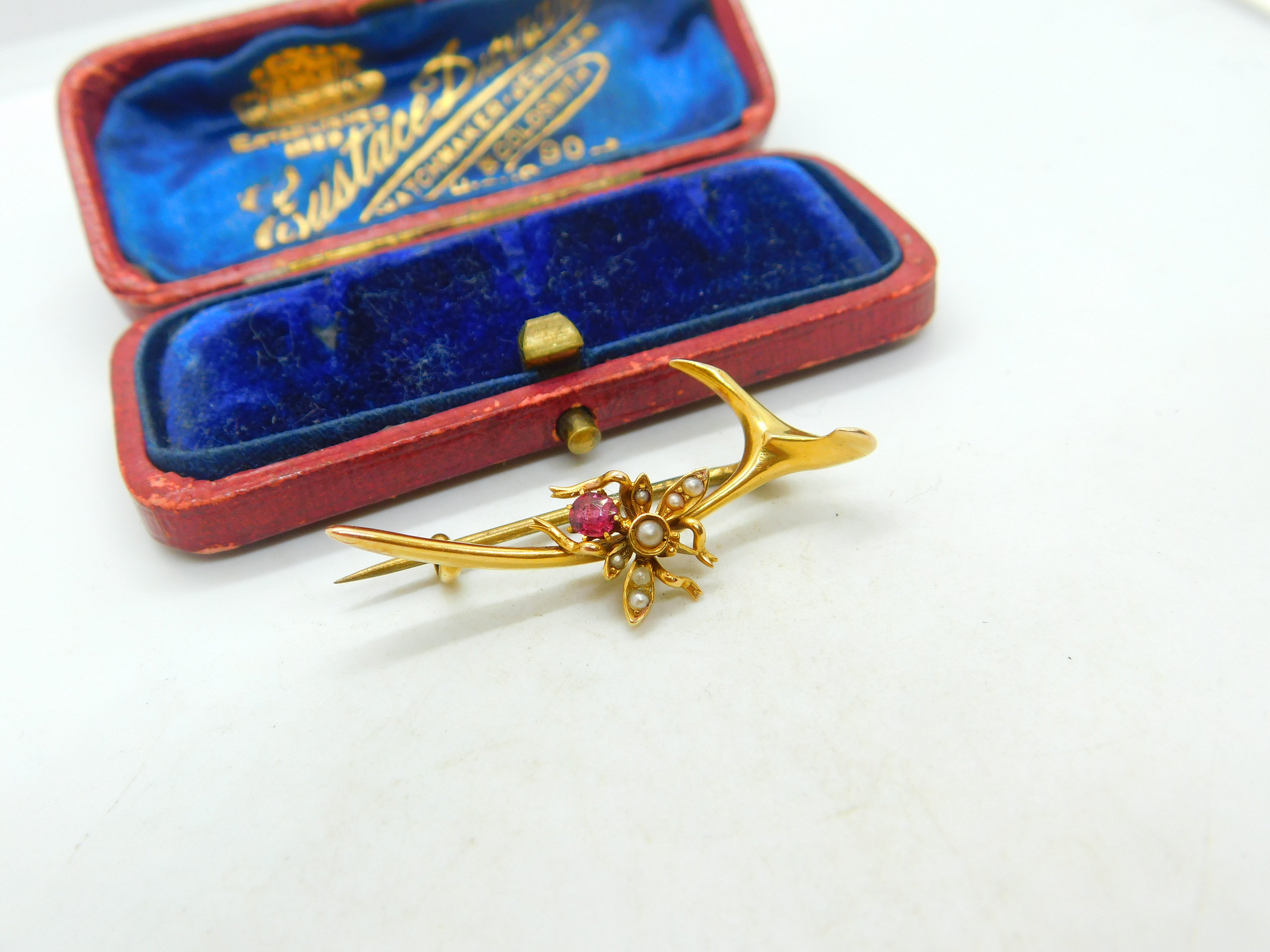 Details: A fantastic and wonderfully designed antique Edwardian 15ct yellow gold wishbone form brooch with lovely little insect or bug to the top set with a garnet and seed pearls c1910. The gold has been XRF tested. This is a wonderful item that would make a perfect gift or addition to any collection. The BOX pictured is for PRESENTATION ONLY and is NOT included in the listings but used to frame the pictures unless specifically stated otherwise.
