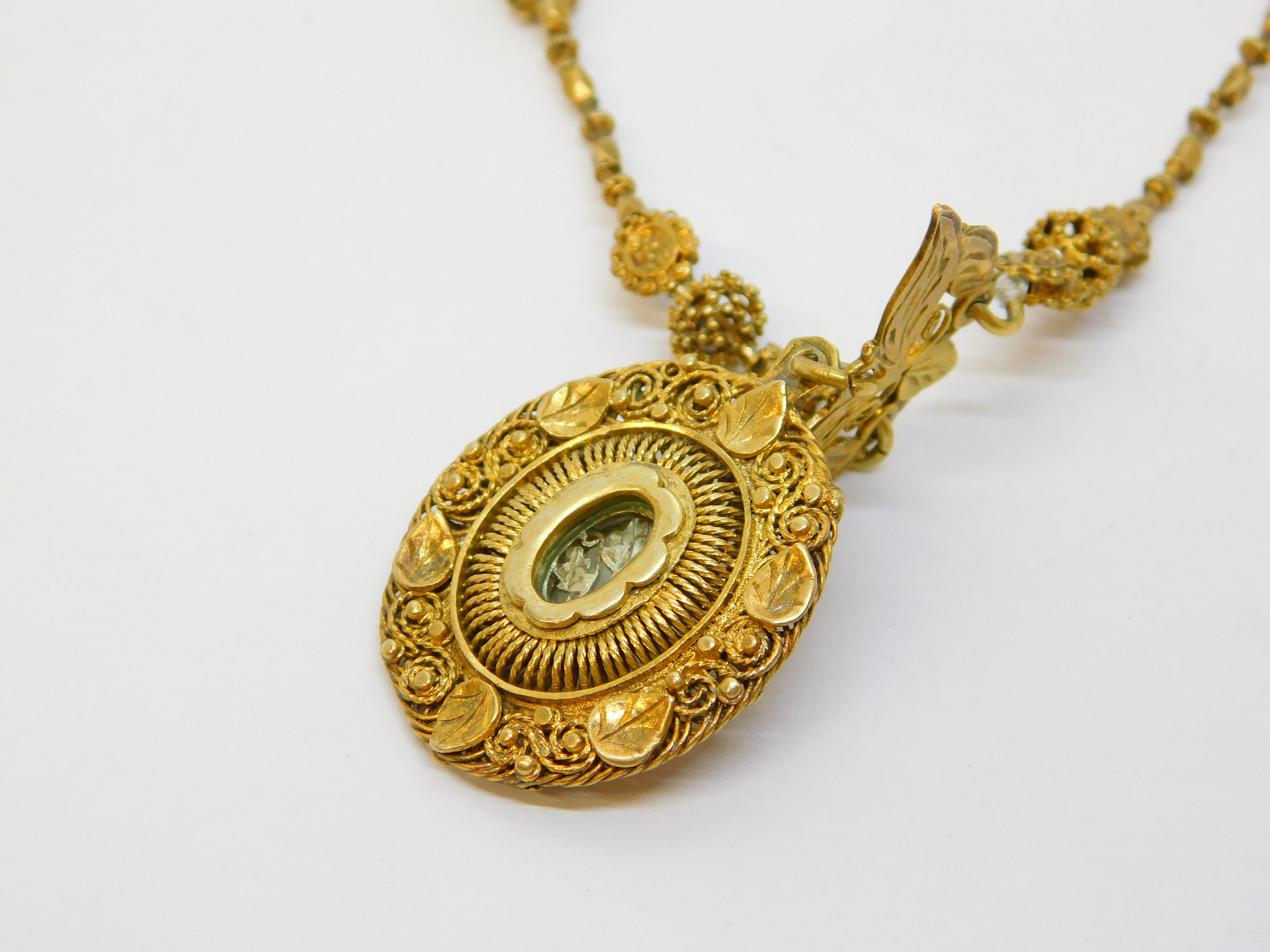Details: A fantastic and wonderfully designed antique 17th century Spanish colonial sterling silver gilt floral pattern cannetille necklace with reliquary pendant, the silver has been XRF tested as it is unmarked. This is a wonderful item that would make a perfect gift or addition to any collection.