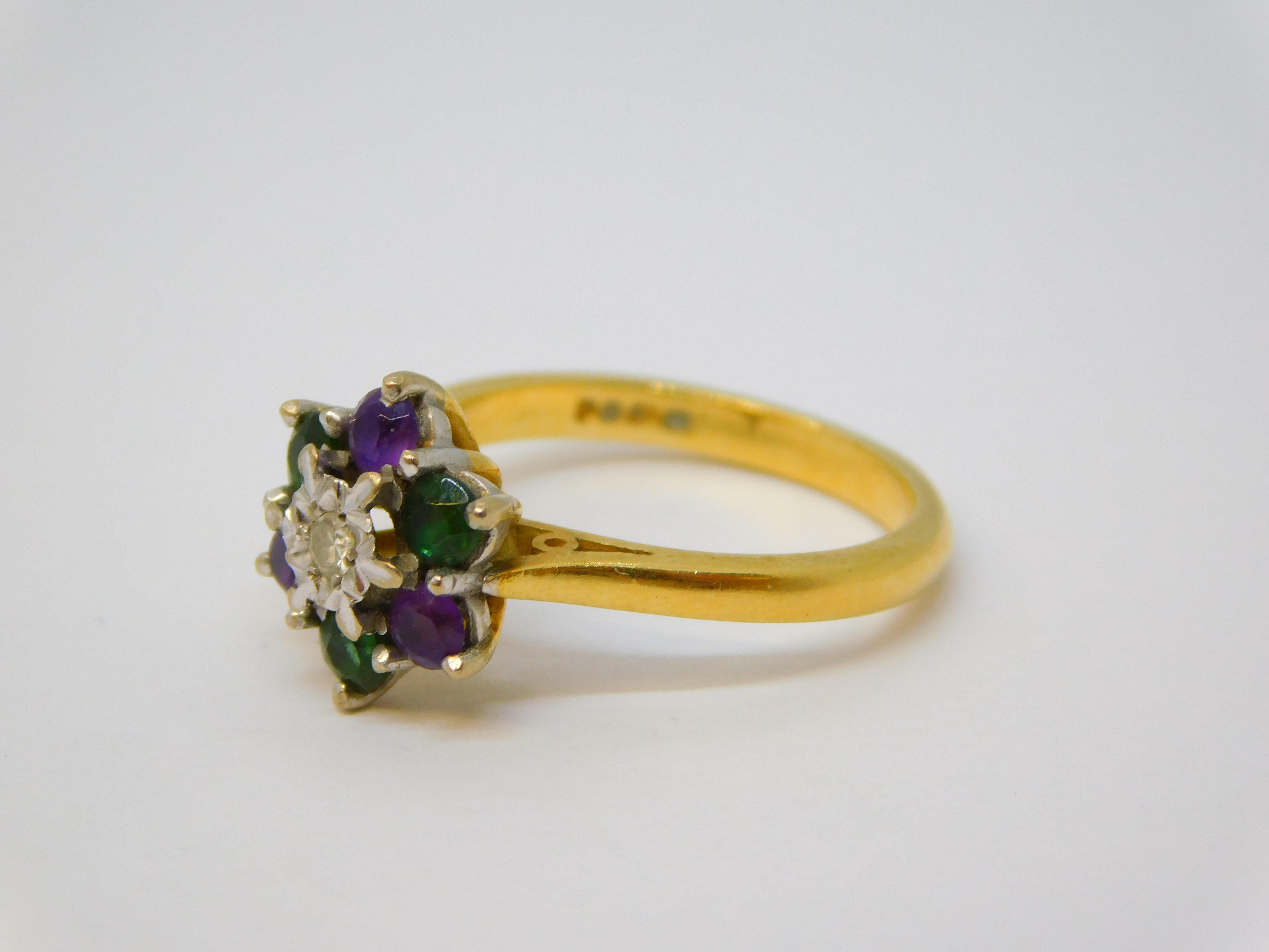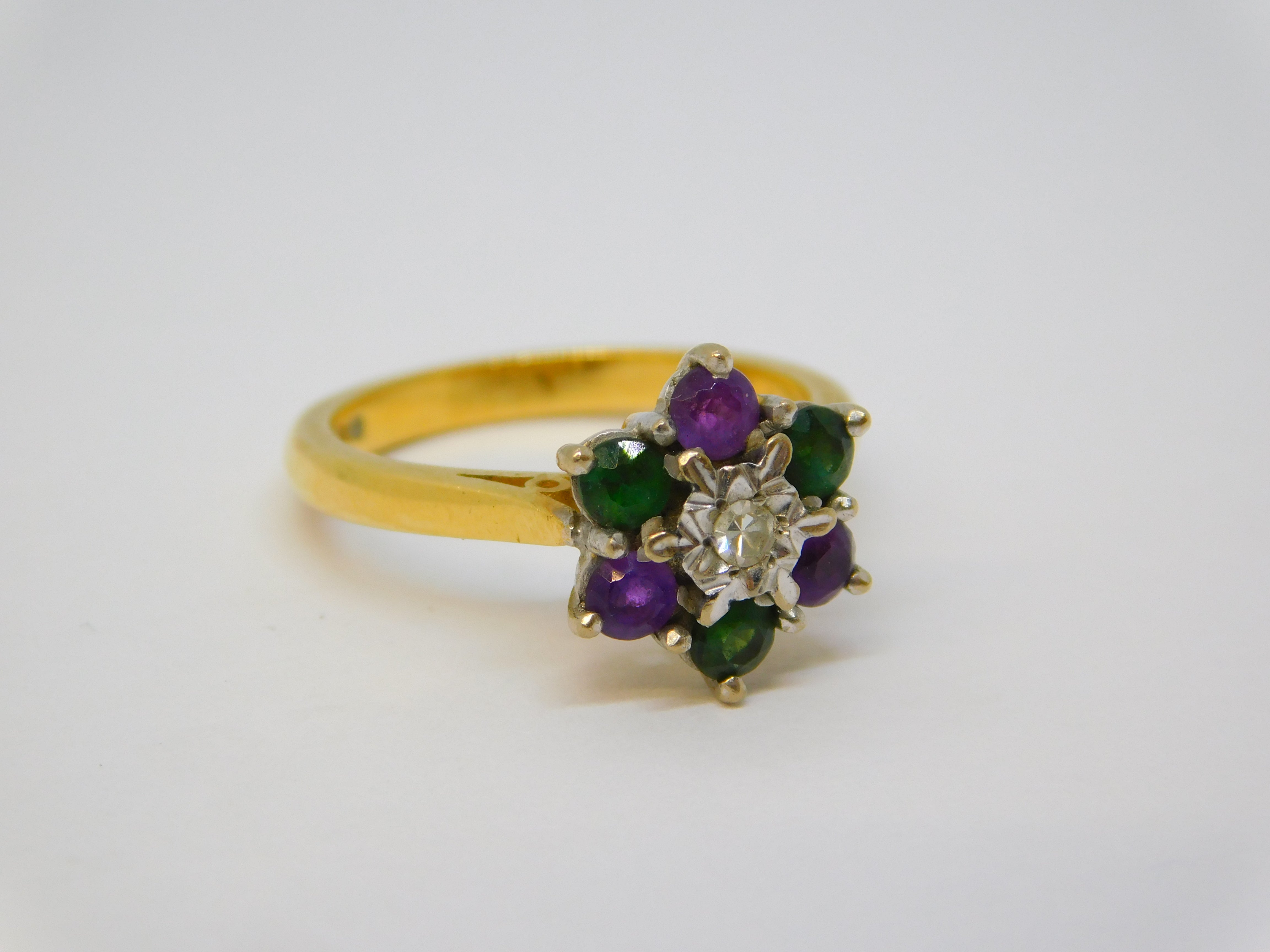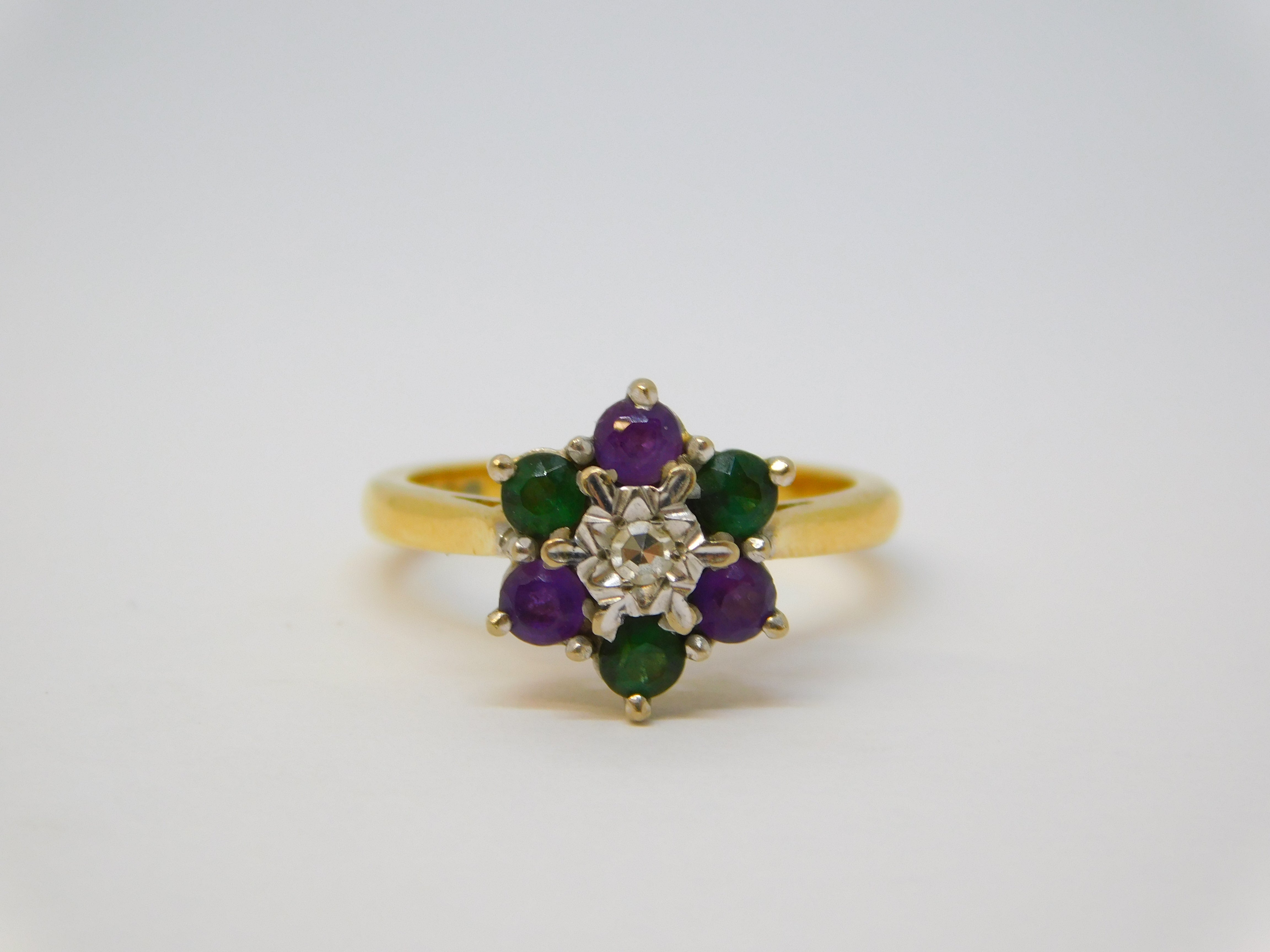 Details: A fantastic and wonderfully designed vintage 18ct yellow gold floral cluster ring set with amethyst and emeralds, colours representing the Suffragette movement, set with a central brilliant cut diamond hallmarked London 1970 to the interior band, the stones have all been tested. This is a wonderful item that would make a perfect gift or addition to any collection.