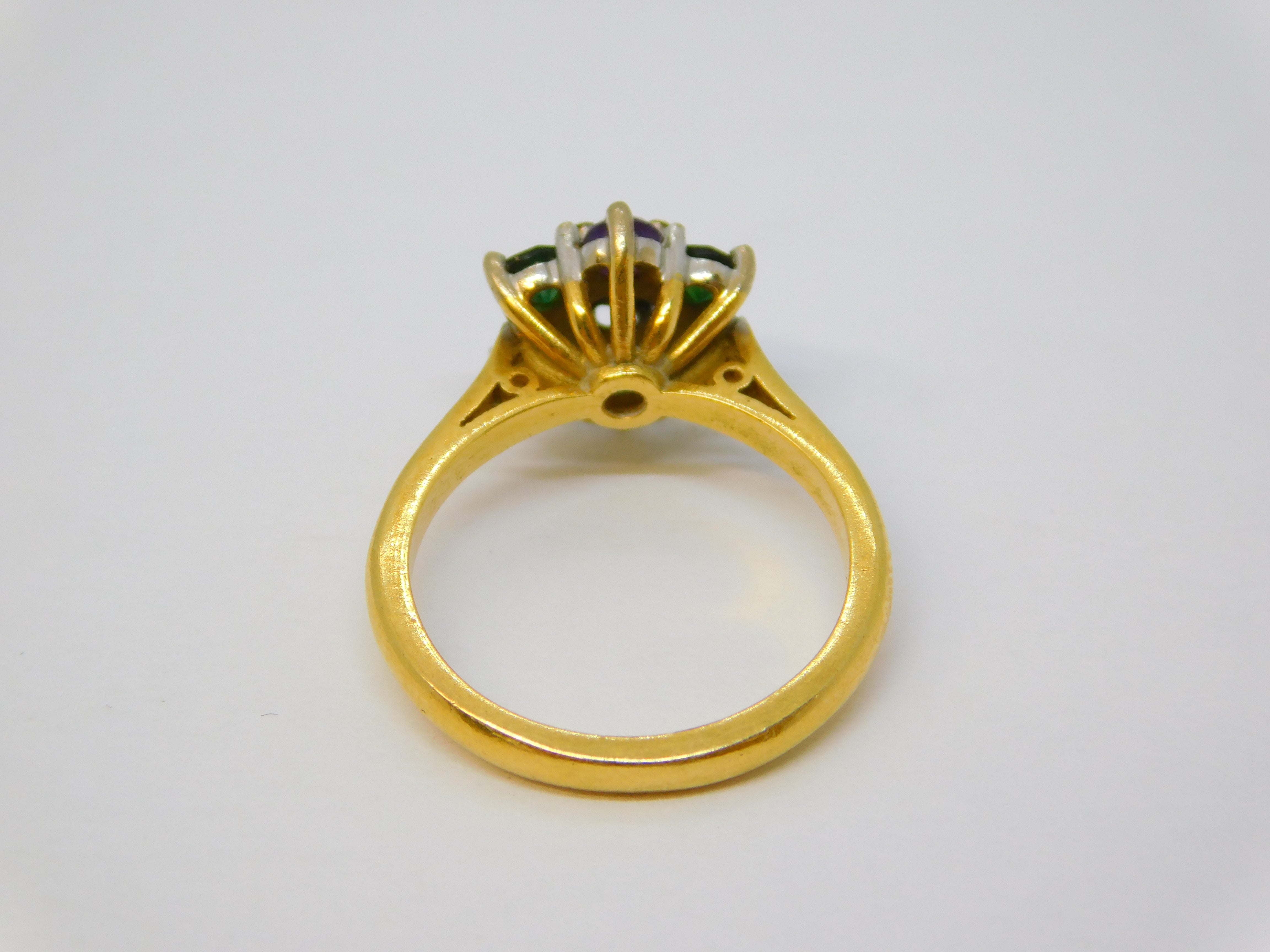 18ct Gold, Emerald, Amethyst & Diamond Suffragette Cluster Ring Vintage London
