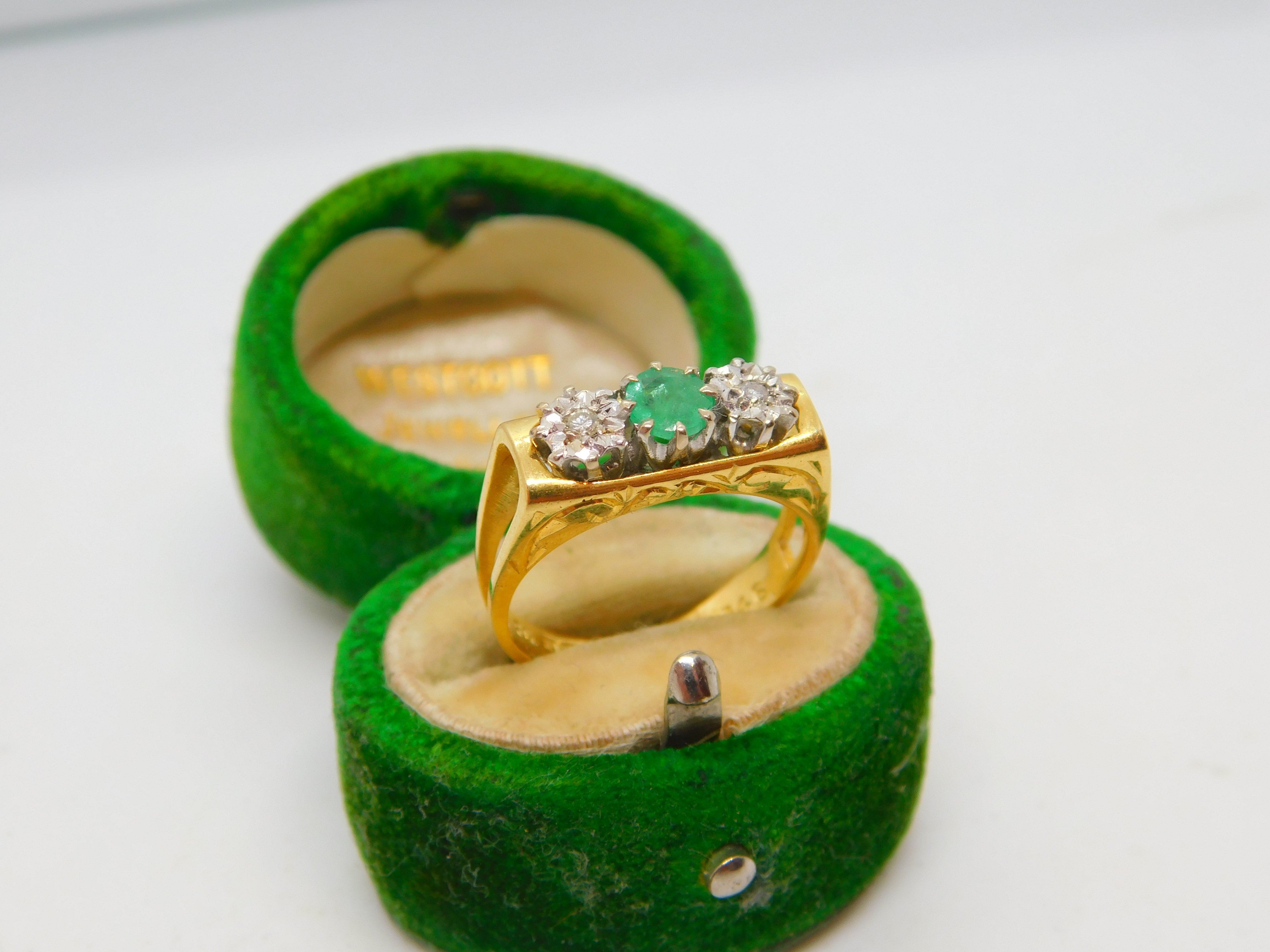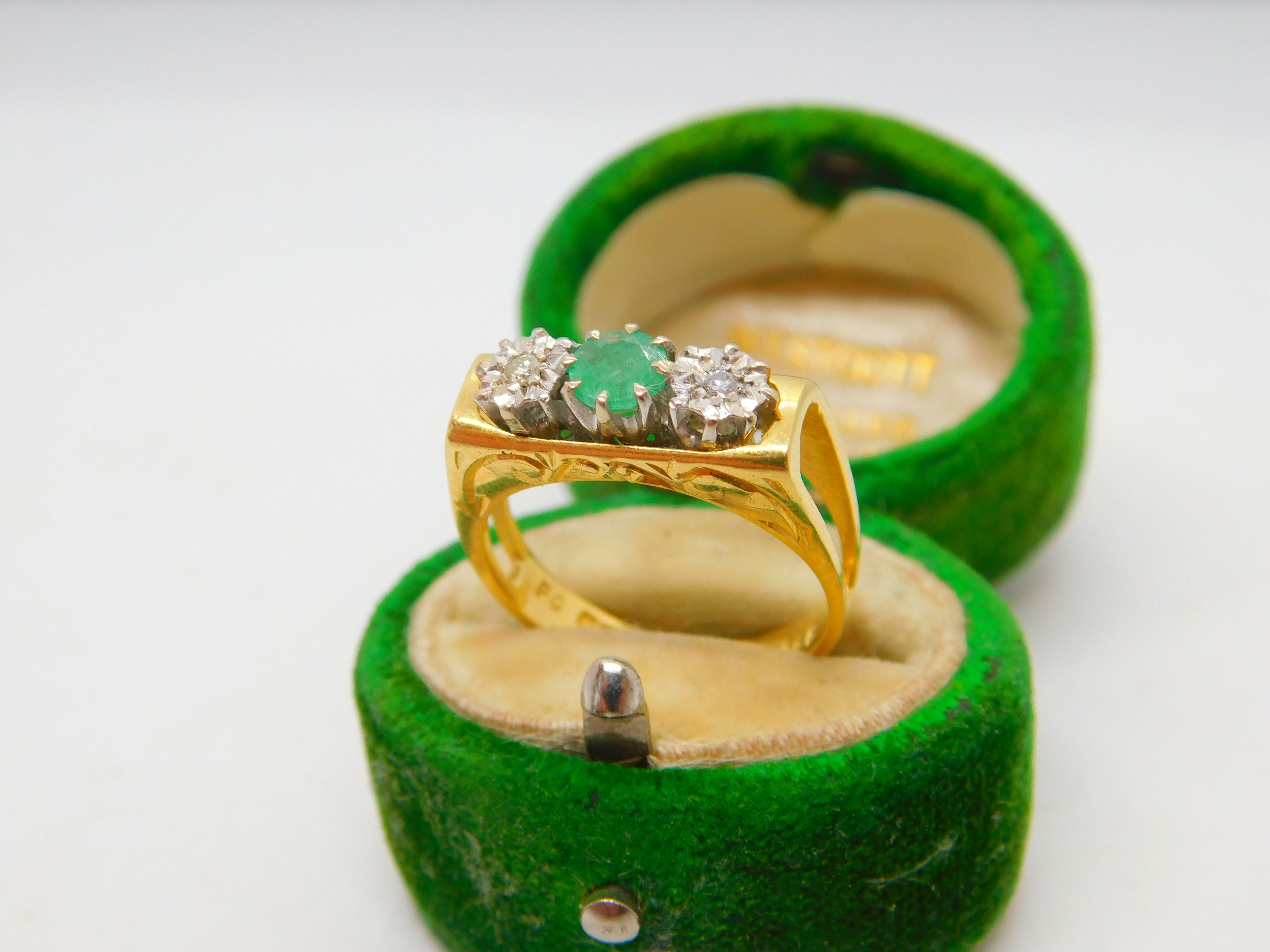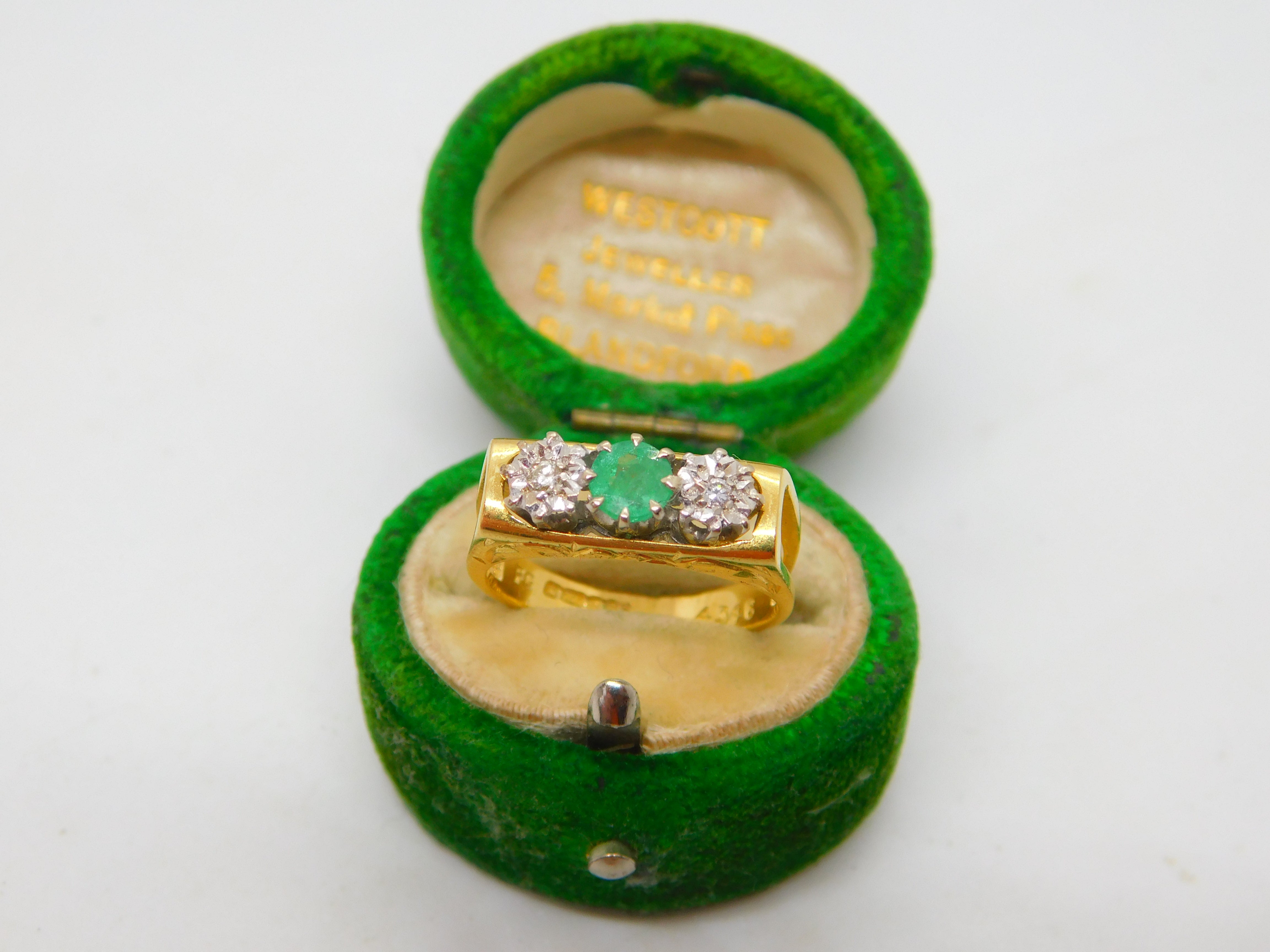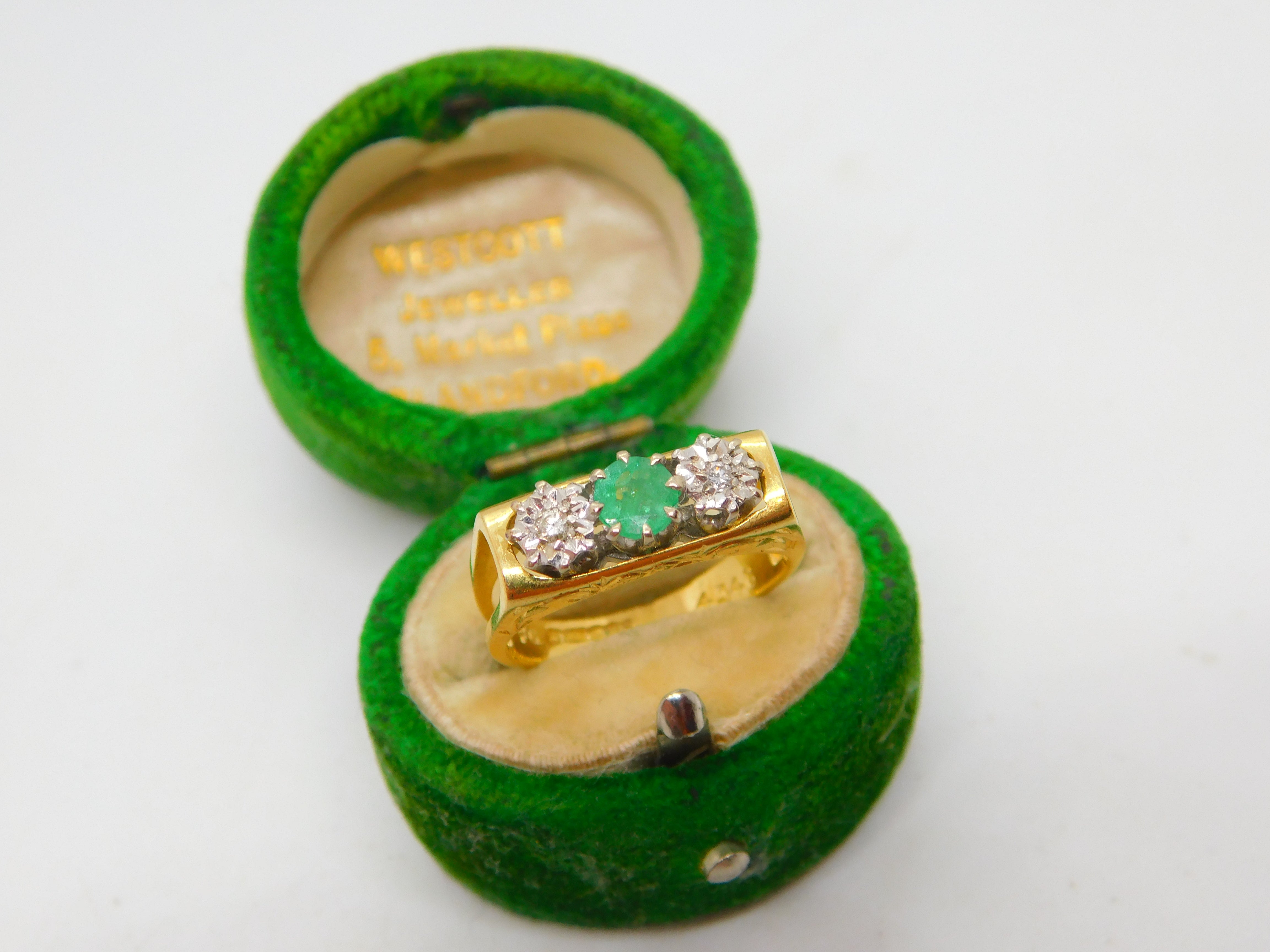 Details: A fantastic and wonderfully designed vintage 18ct yellow gold modernist band ring set with two diamonds (each approx. 0.1ct) flanking a central emerald hallmarked Birmingham 1978 to the interior band. The stones have been tested. This is a wonderful item that would make a perfect gift or addition to any collection. The BOX pictured is for PRESENTATION ONLY and is NOT included in the listings but used to frame the pictures unless specifically stated otherwise.