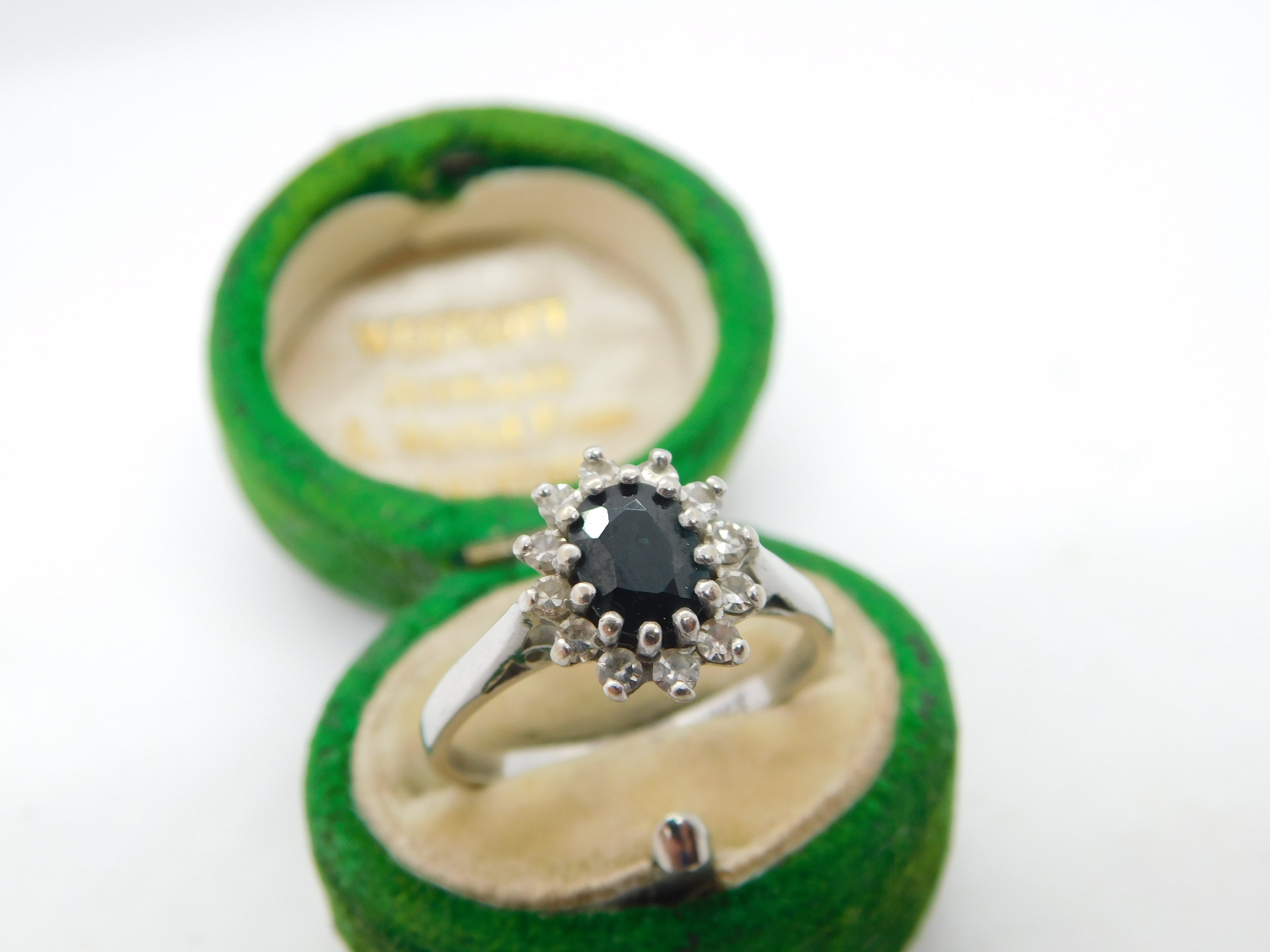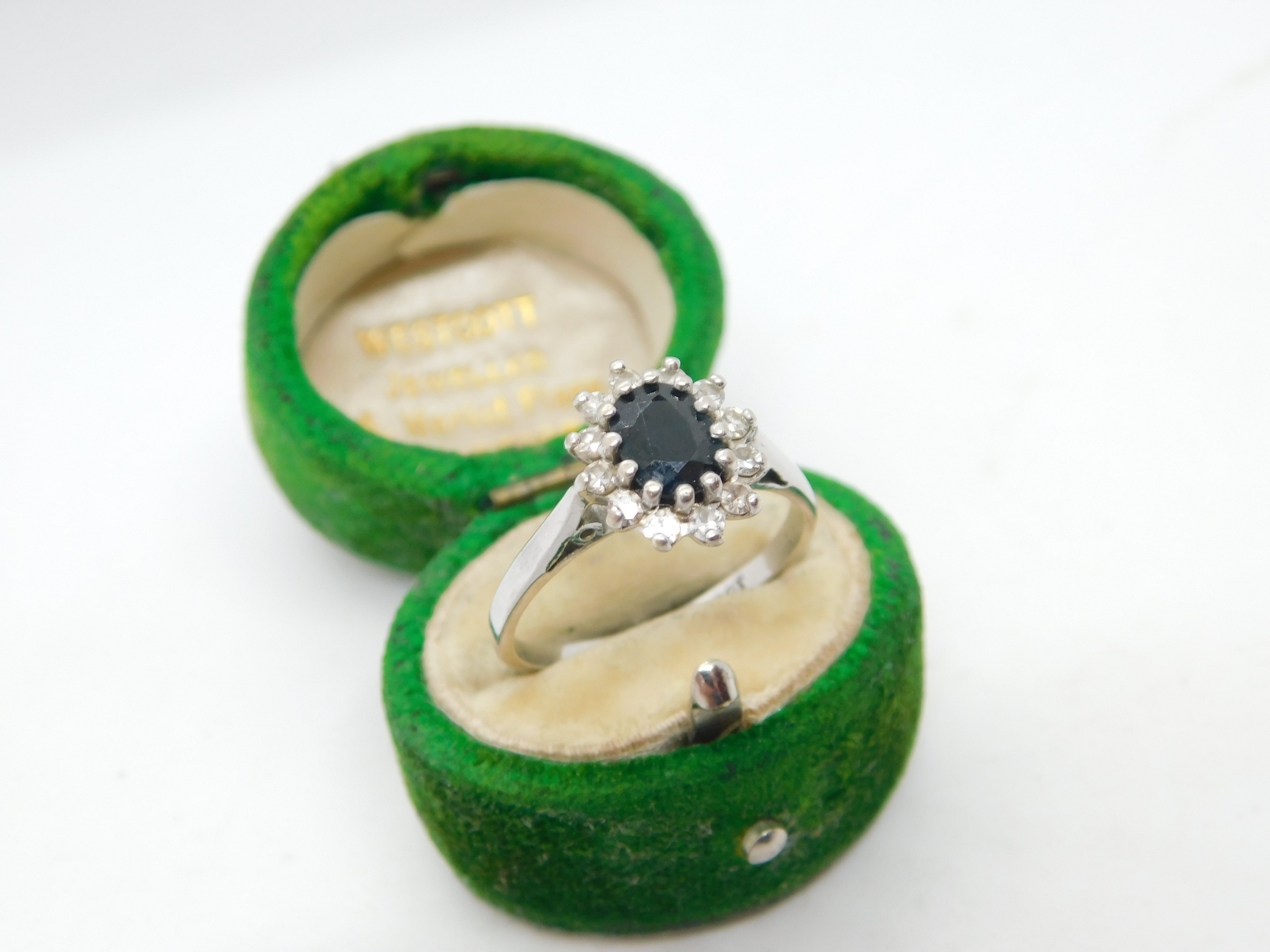 Details: A fantastic and wonderfully designed vintage 18ct white gold engagement ring set with a central sapphire with a cluster of brilliant cut diamonds hallmarked '18ct' to the interior c1960, all the stones have been tested. This is a wonderful item that would make a perfect gift or addition to any collection. The BOX pictured is for PRESENTATION ONLY and is NOT included in the listings but used to frame the pictures unless specifically stated otherwise.