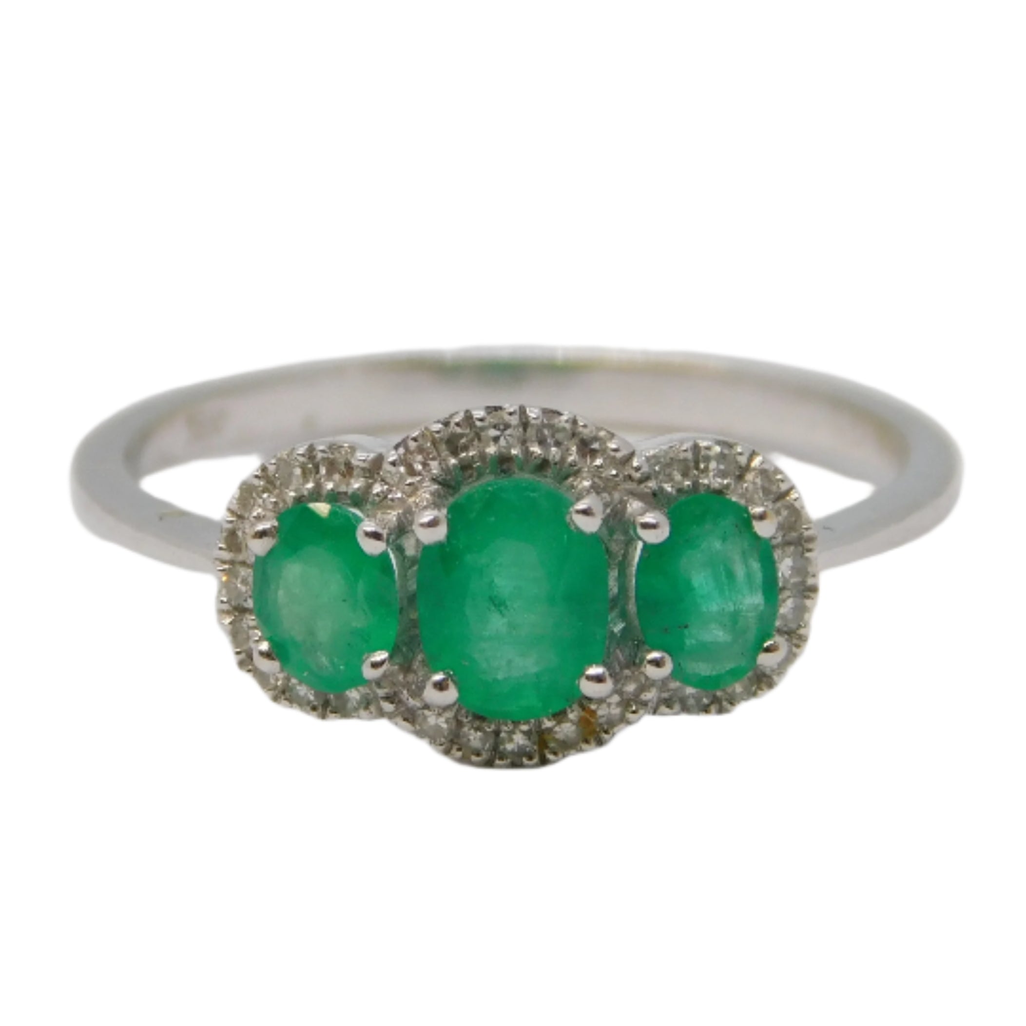 18ct White Gold, Three-Stone Emerald & Diamond Dress Ring Vintage c1990